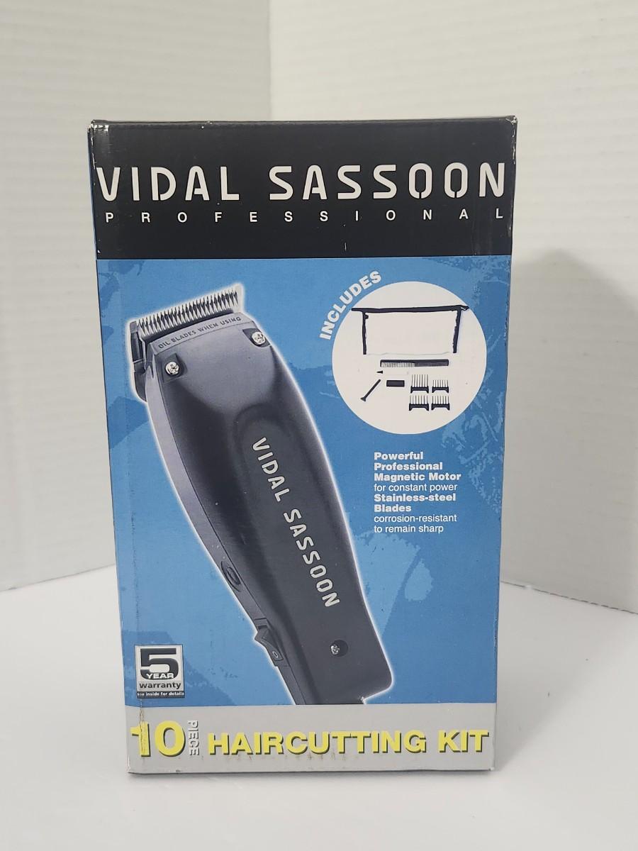 Classic Vidal Sassoon Professional haircutting kit from 2005, featuring electric hair clippers with stainless steel blades designed for long lasting sharpness and consistent cutting power. Box highlights a powerful professional magnetic motor and includes multiple guide combs and accessories for versatile home or salon style haircuts. A great example of mid 2000s grooming gear from an iconic haircare brand, appealing to collectors, stylists, or anyone who appreciates vintage personal care packaging and design.