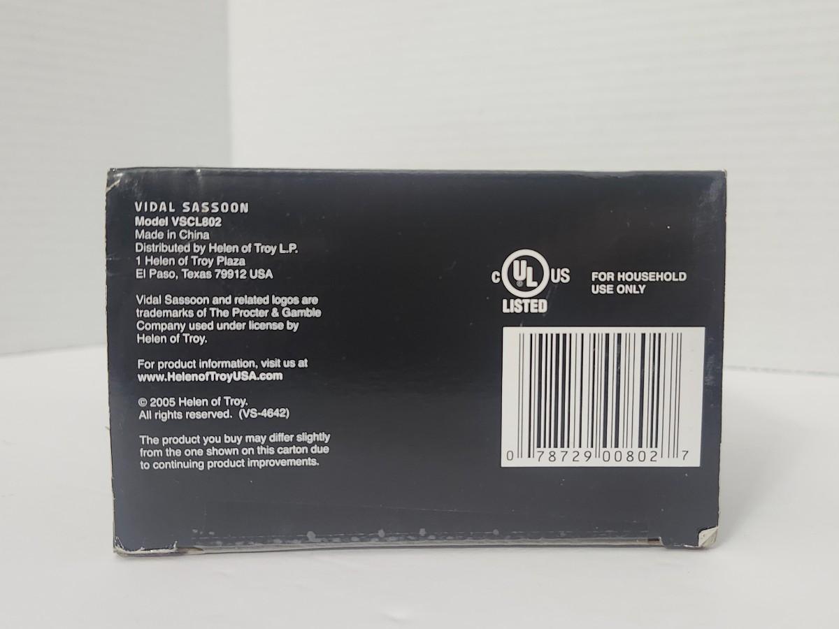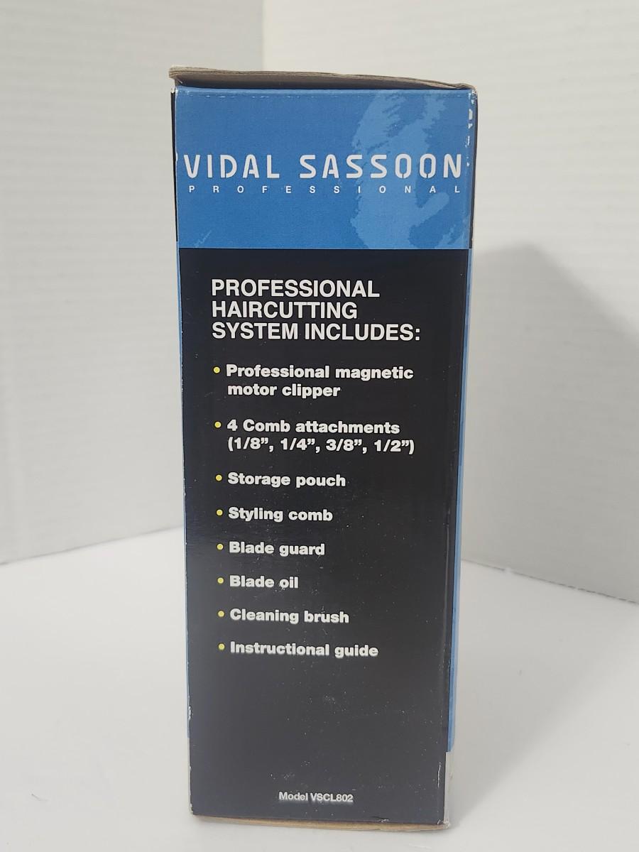 Classic Vidal Sassoon Professional haircutting kit from 2005, featuring electric hair clippers with stainless steel blades designed for long lasting sharpness and consistent cutting power. Box highlights a powerful professional magnetic motor and includes multiple guide combs and accessories for versatile home or salon style haircuts. A great example of mid 2000s grooming gear from an iconic haircare brand, appealing to collectors, stylists, or anyone who appreciates vintage personal care packaging and design.