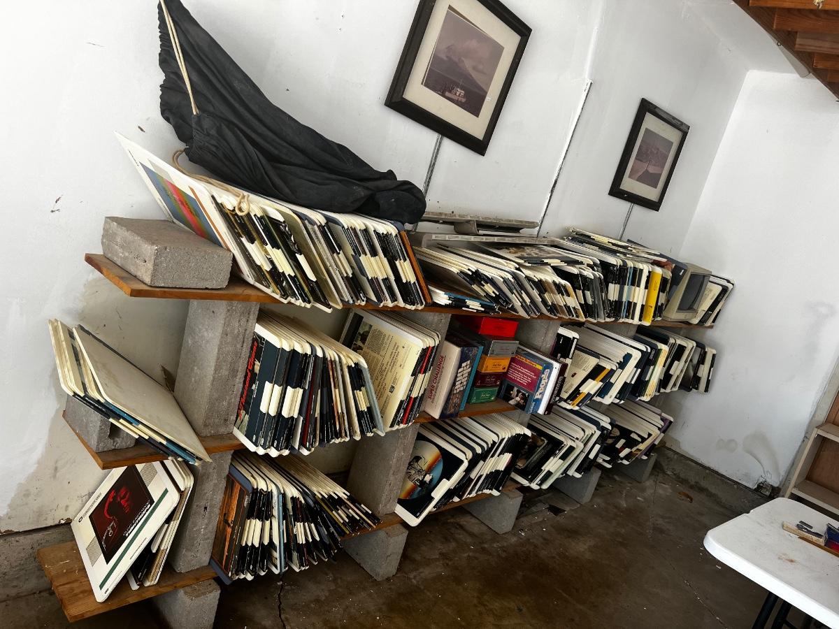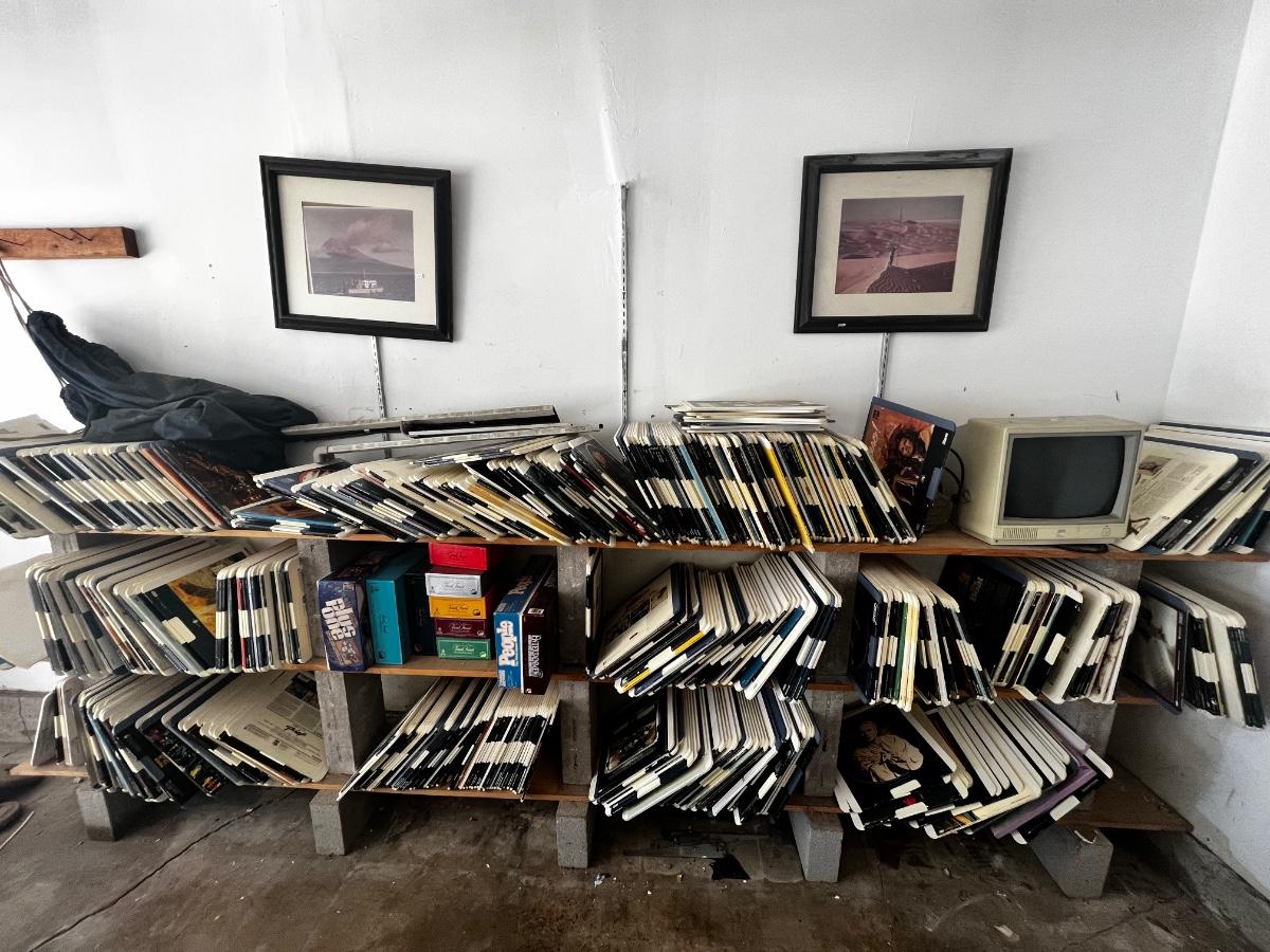 Lot includes all remaining video disc, pictured hanging photographs, board games, IBM computer screen
