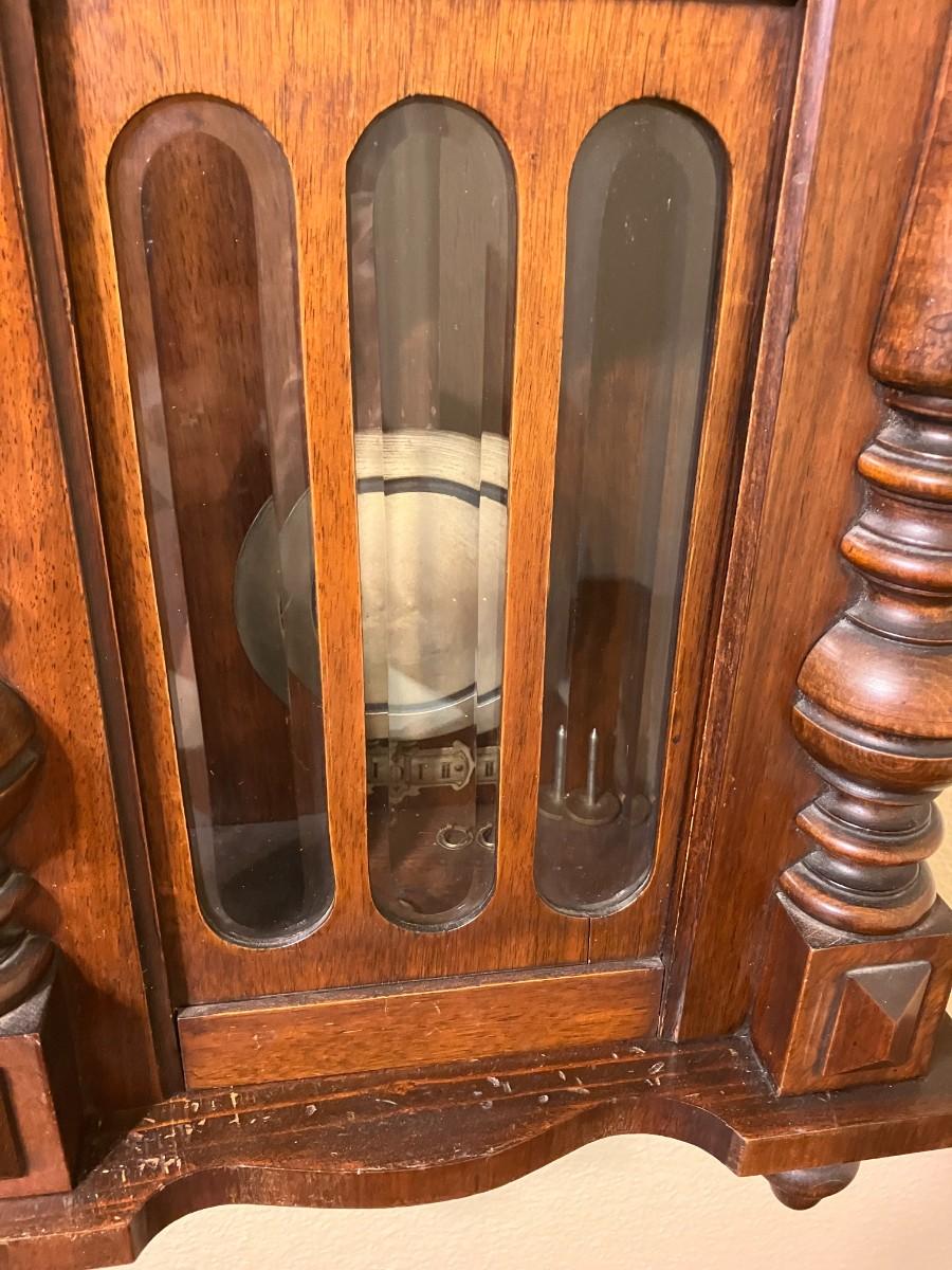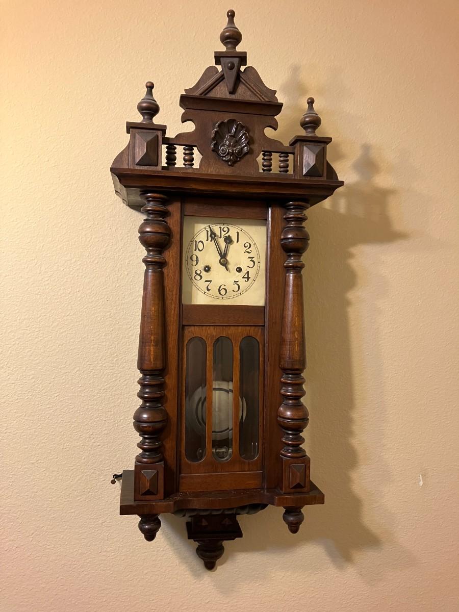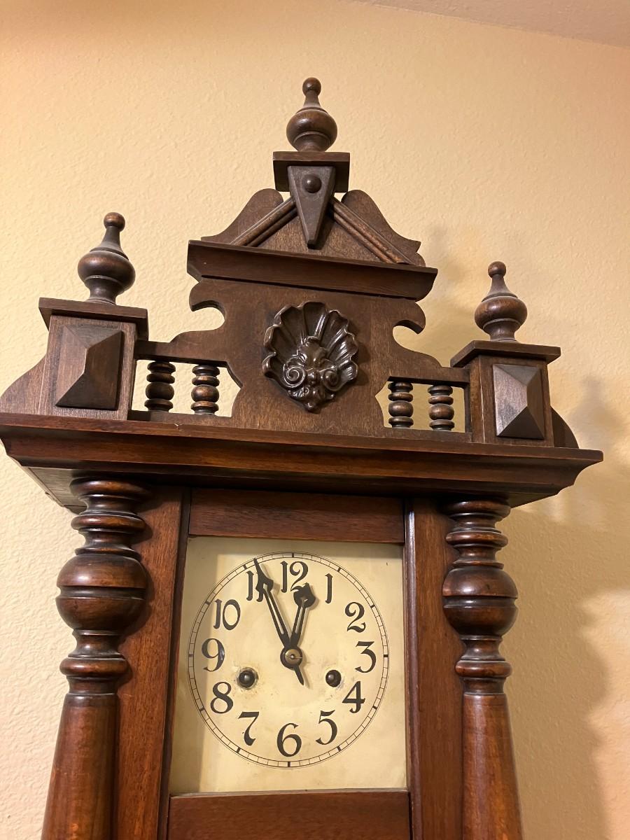 Vienna regulator wall clock with key. Works, excellent condition, requires winding and setting. 38" H x 14" W x 7" D