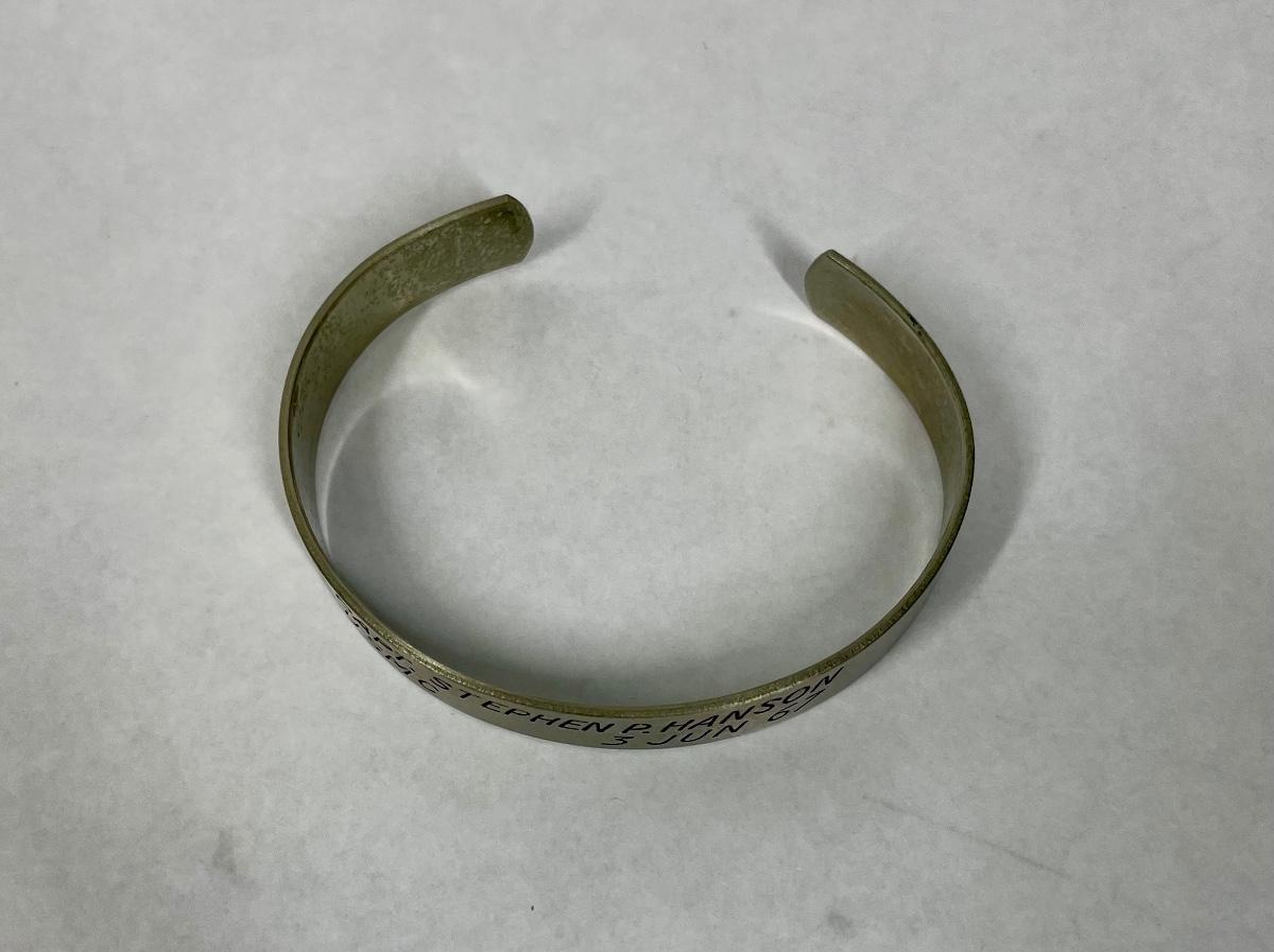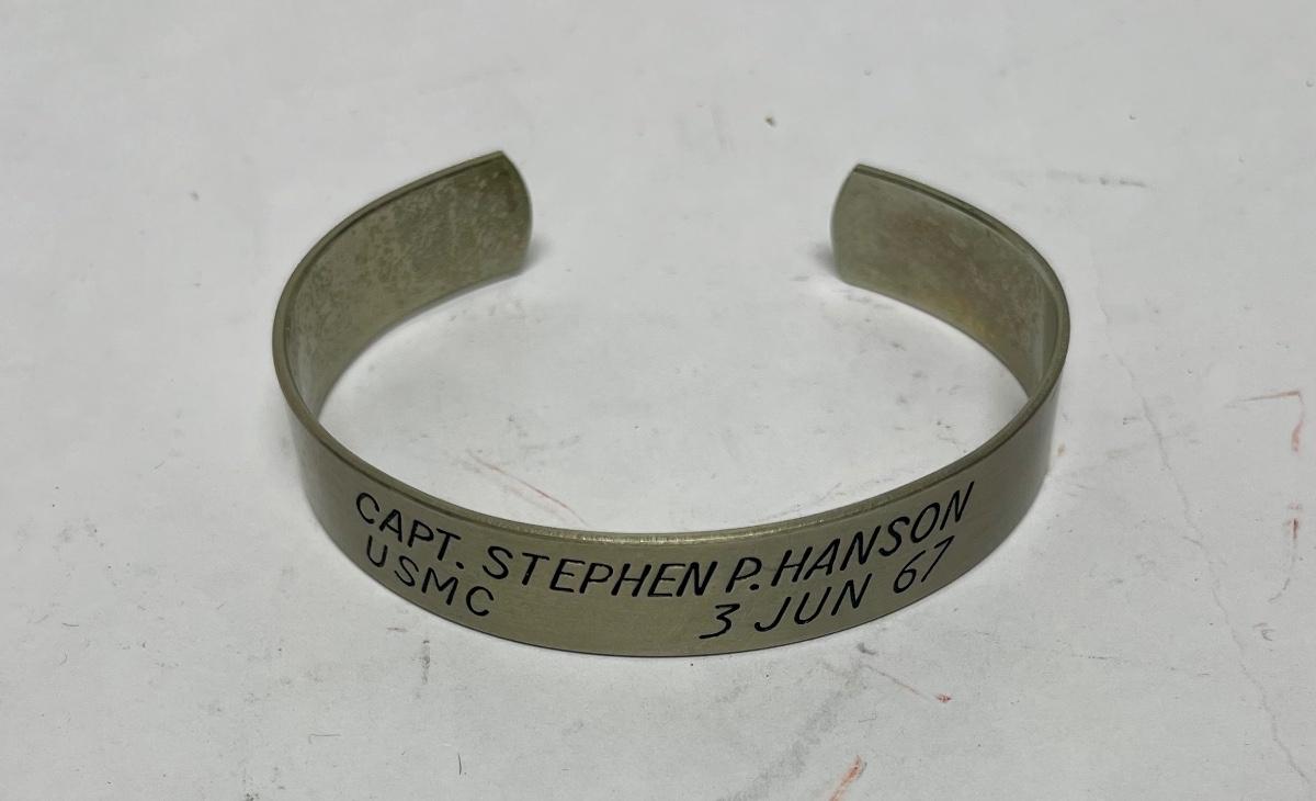 Bracelets like this began to be distributed in 1970 as a way to remember POW/MIA soldiers. USMC Capt. Hanson was listed as missing on 6/3/67, when his helicopter was shot down in Vietnam. Promoted from Capt. to Major while in MIA status, changed to KIA on 10/4/74. In good vintage condition.