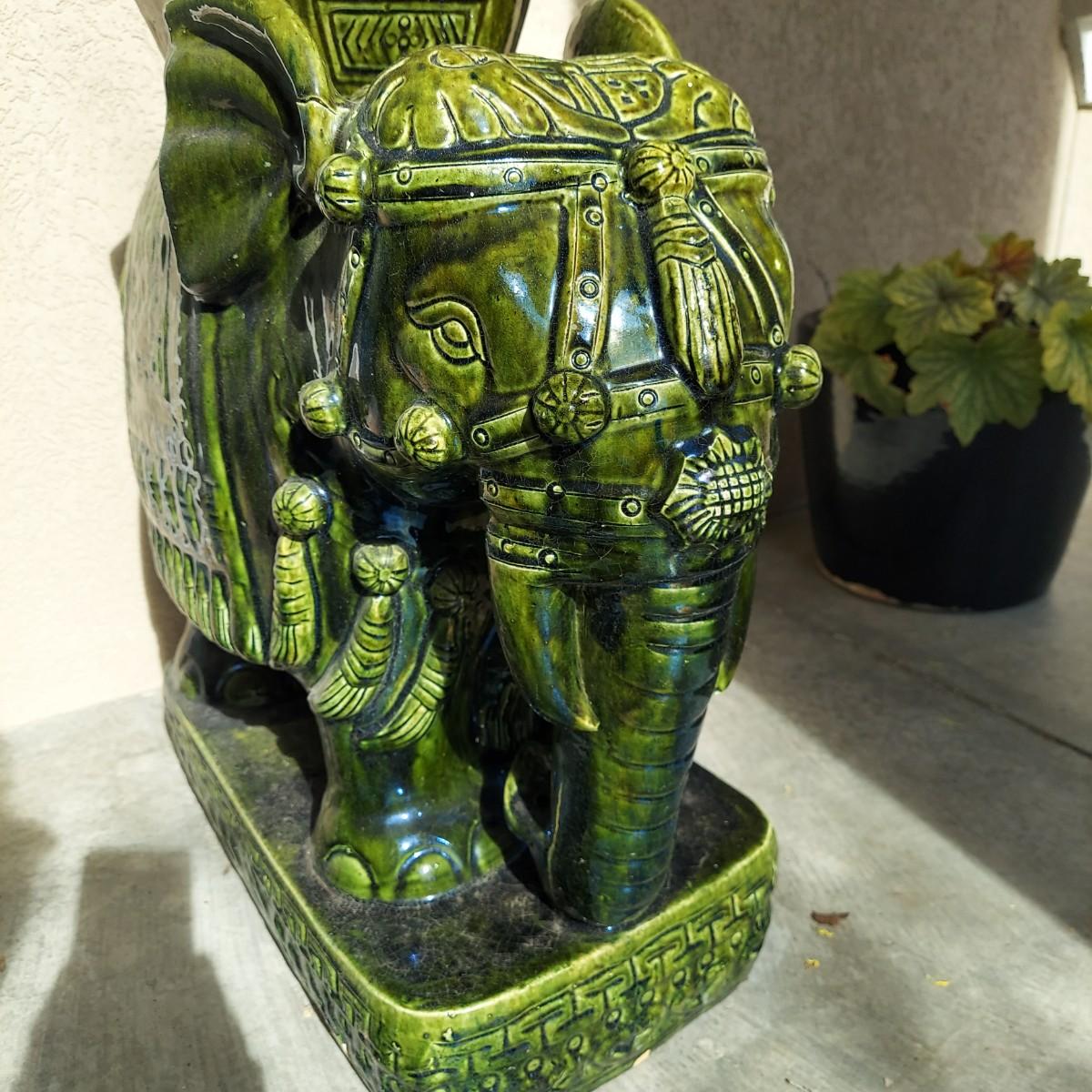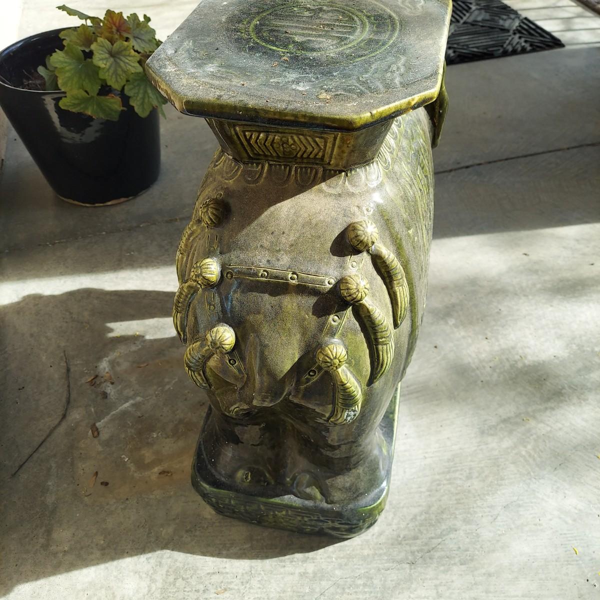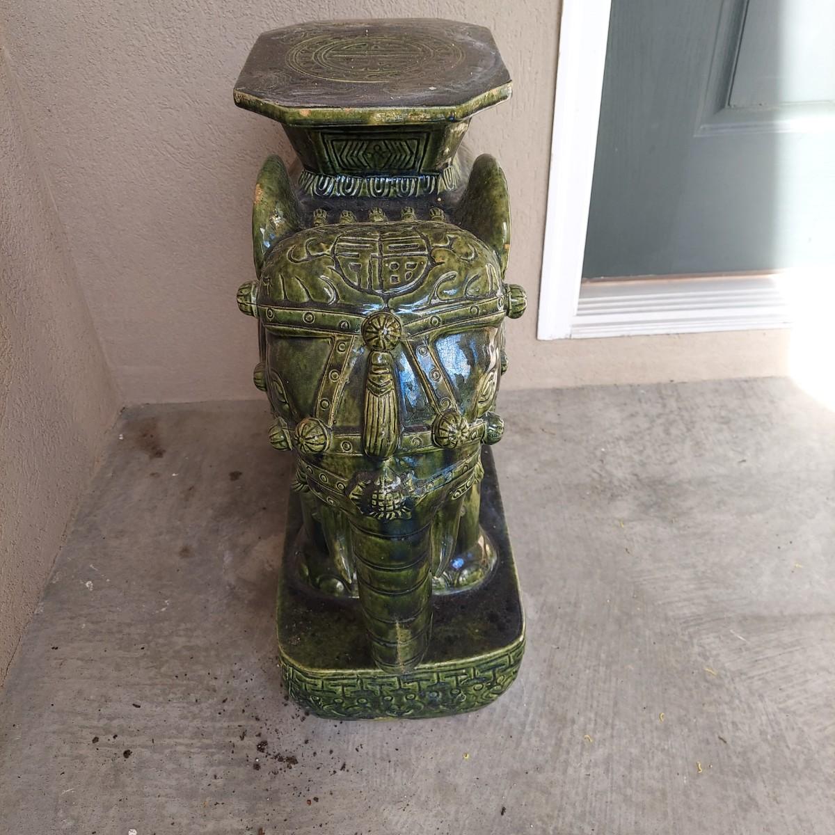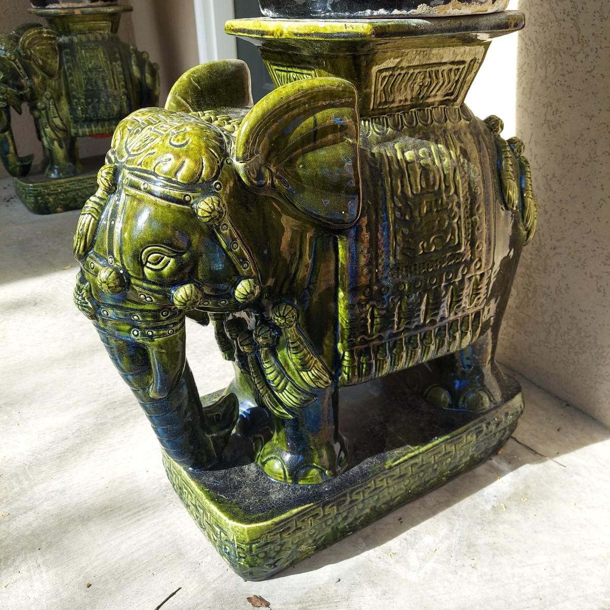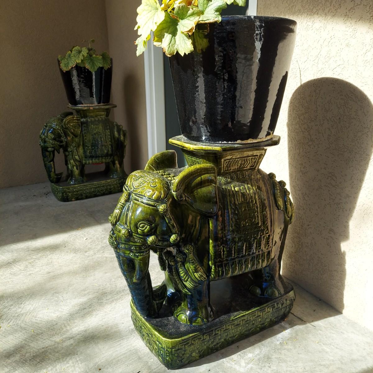 Two large green glazed elephant pedestals that each measure 11” x 21” x 23"H. Per the seller, they were purchased in Vietnam. There is some crazing and chipping as they are being used outside. Please see photos for details. The dark pots shown on top are not included but they are available in lot 74. Local Pickup Only. Winning bidder must bring assistance to help move and load this item due to its weight and/or size. These are located on the front porch with four steps down to ground level.