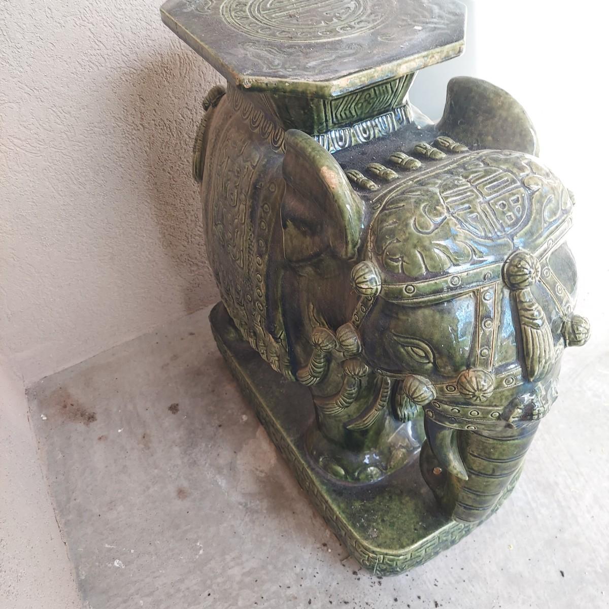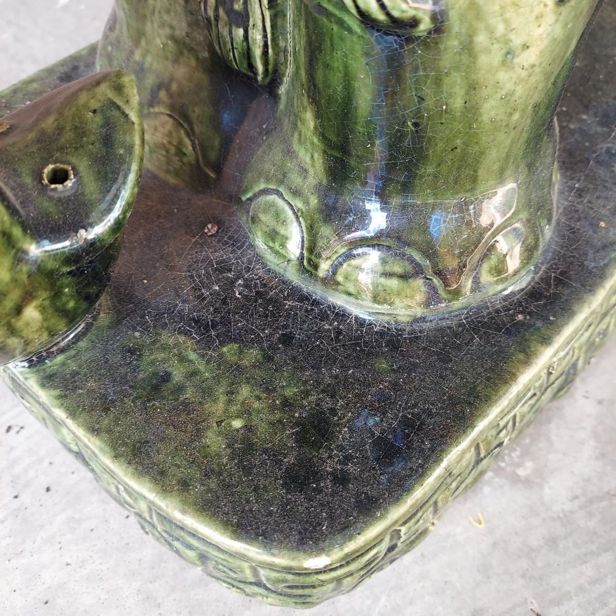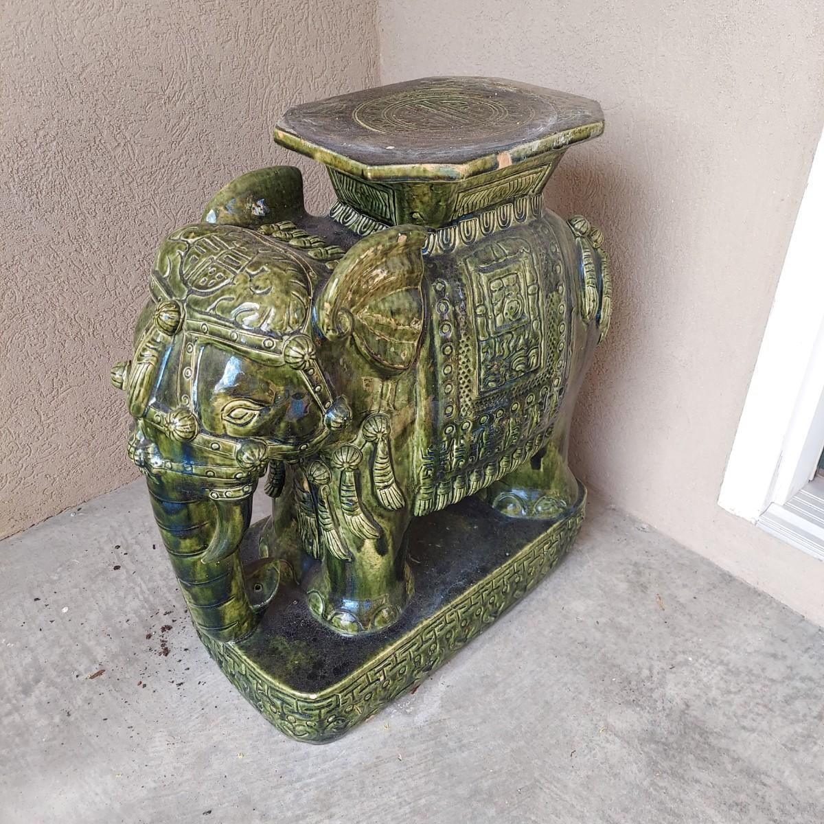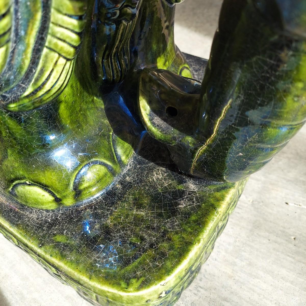 Two large green glazed elephant pedestals that each measure 11” x 21” x 23"H. Per the seller, they were purchased in Vietnam. There is some crazing and chipping as they are being used outside. Please see photos for details. The dark pots shown on top are not included but they are available in lot 74. Local Pickup Only. Winning bidder must bring assistance to help move and load this item due to its weight and/or size. These are located on the front porch with four steps down to ground level.