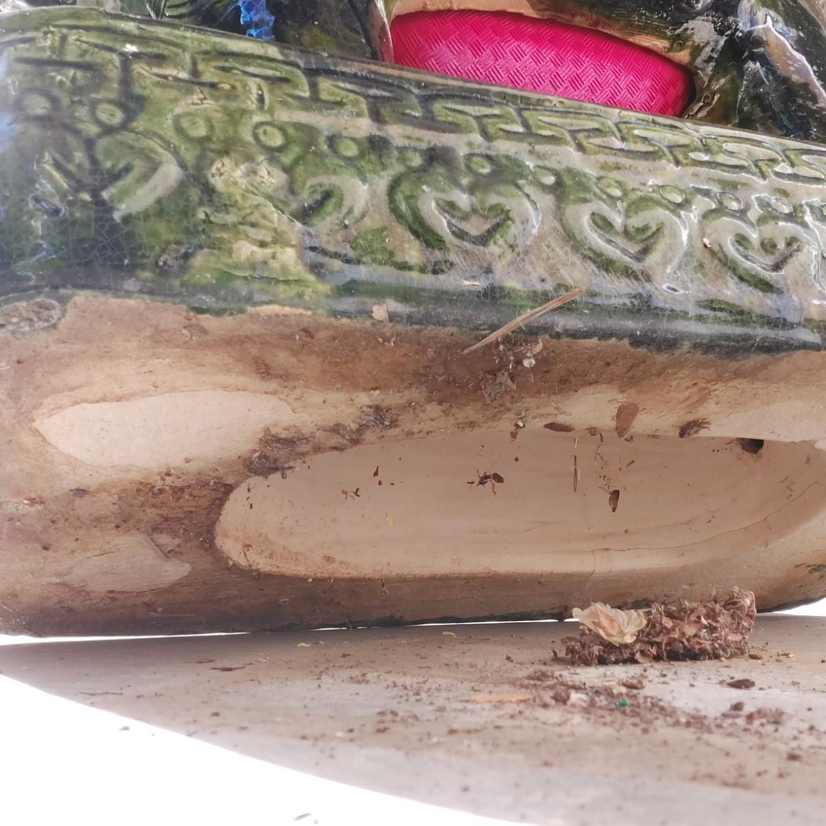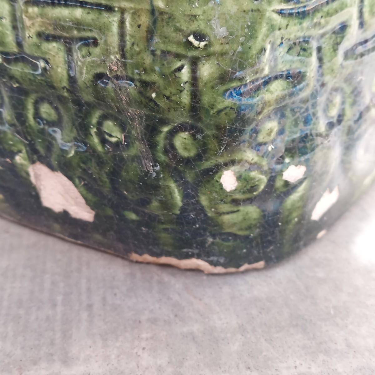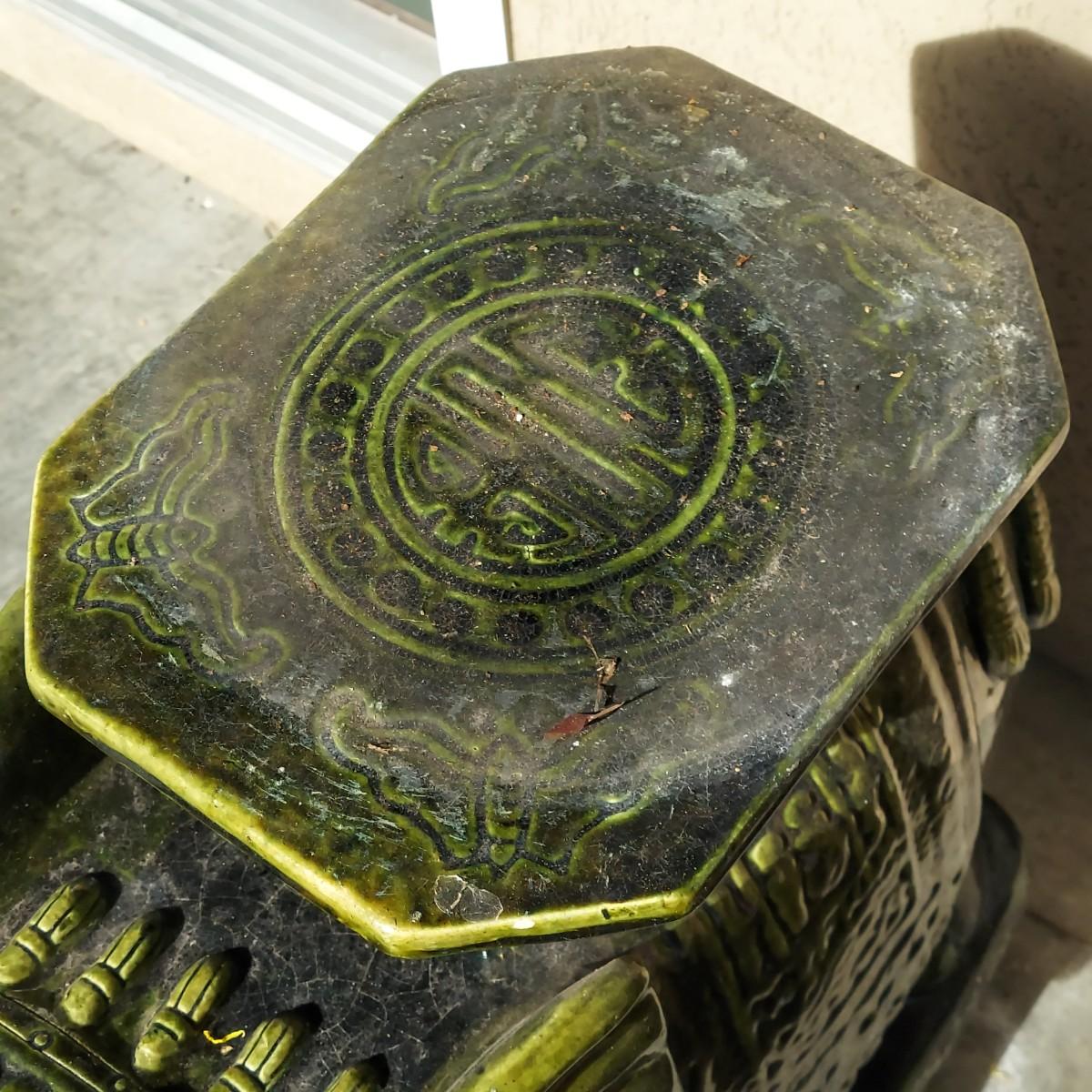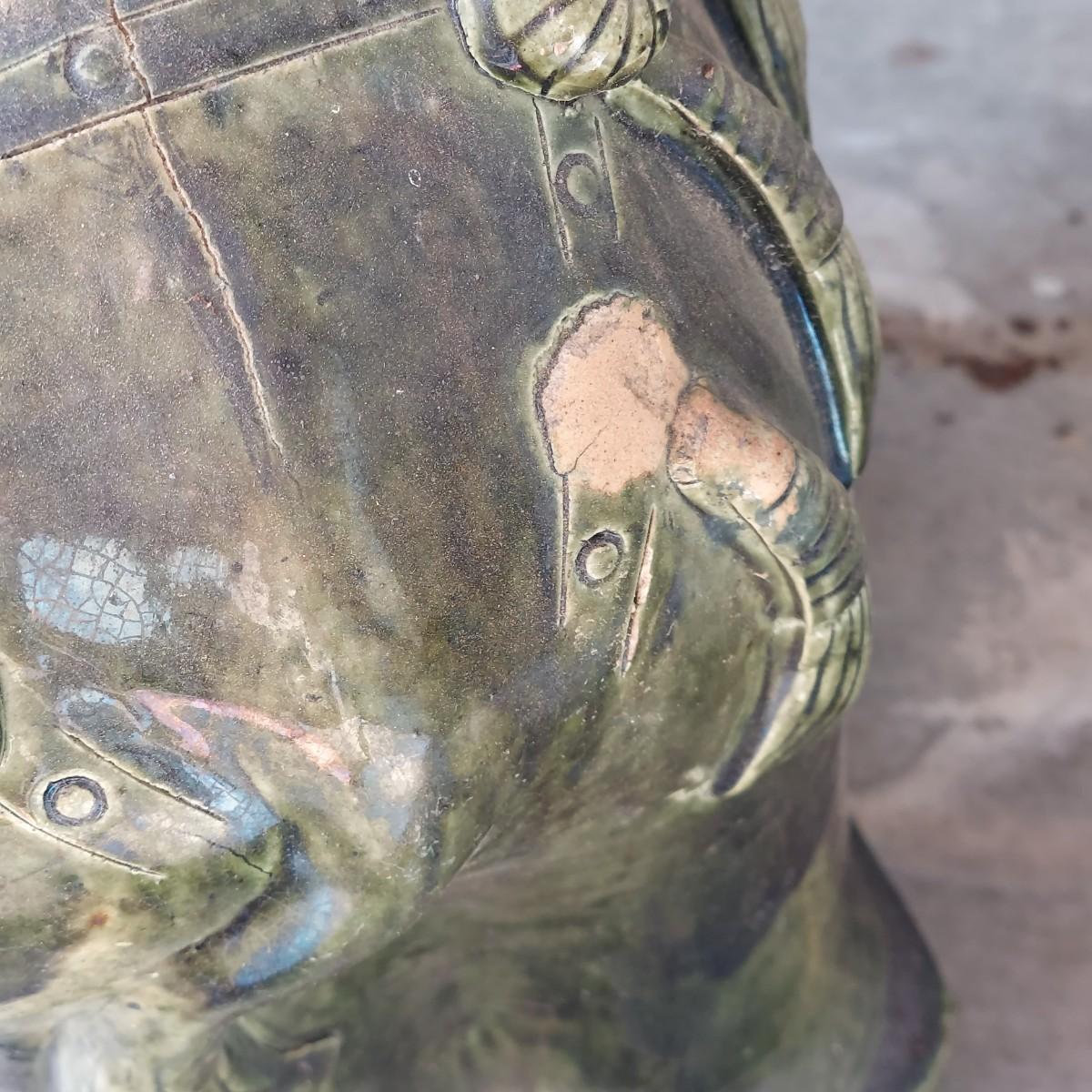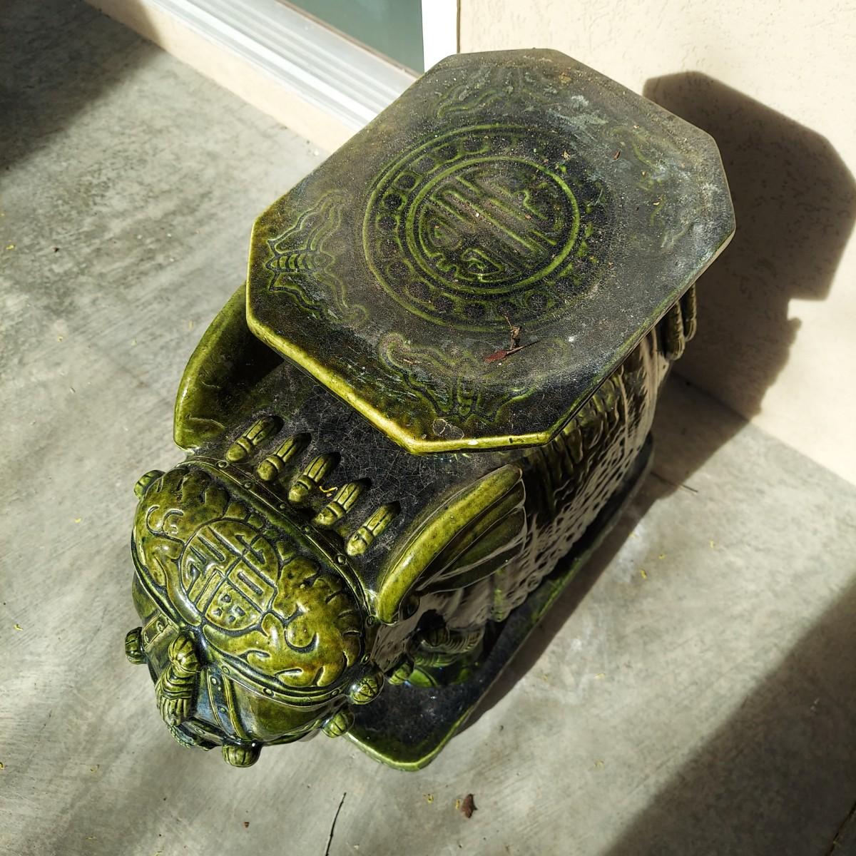 Two large green glazed elephant pedestals that each measure 11” x 21” x 23"H. Per the seller, they were purchased in Vietnam. There is some crazing and chipping as they are being used outside. Please see photos for details. The dark pots shown on top are not included but they are available in lot 74. Local Pickup Only. Winning bidder must bring assistance to help move and load this item due to its weight and/or size. These are located on the front porch with four steps down to ground level.