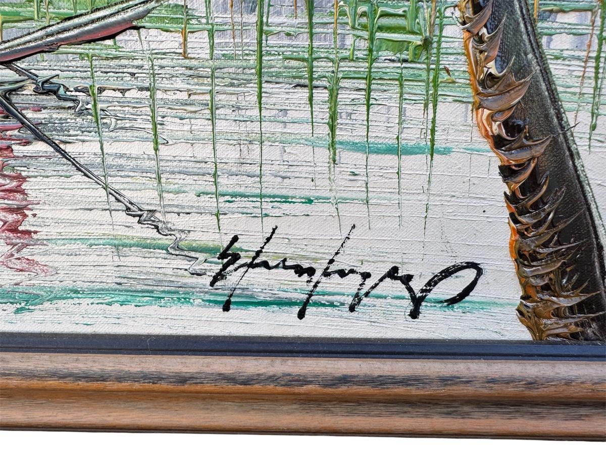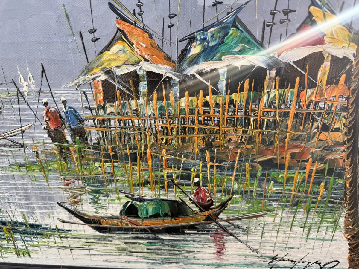 Vietnamese “river village” scene—oil on canvas with heavy palette-knife impasto