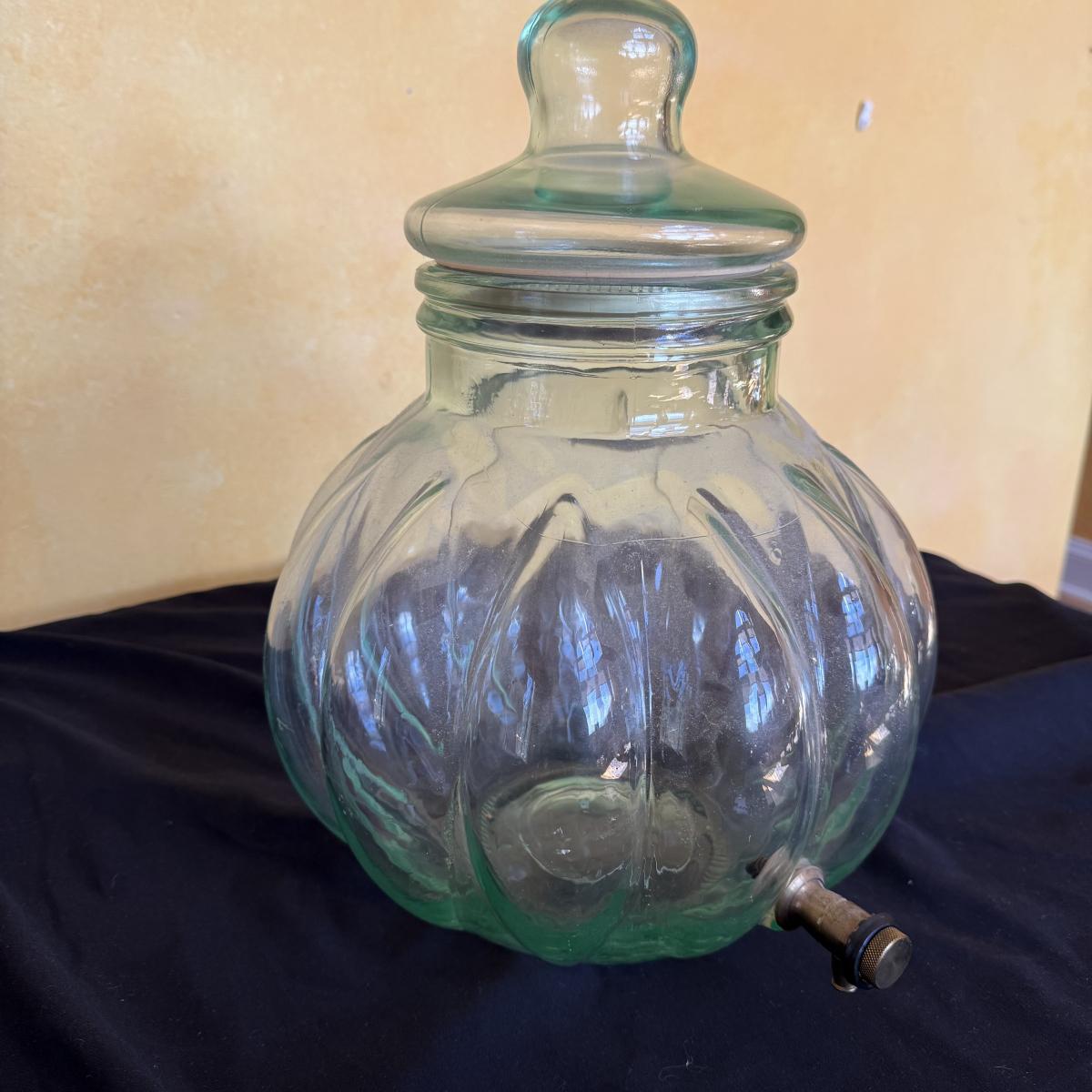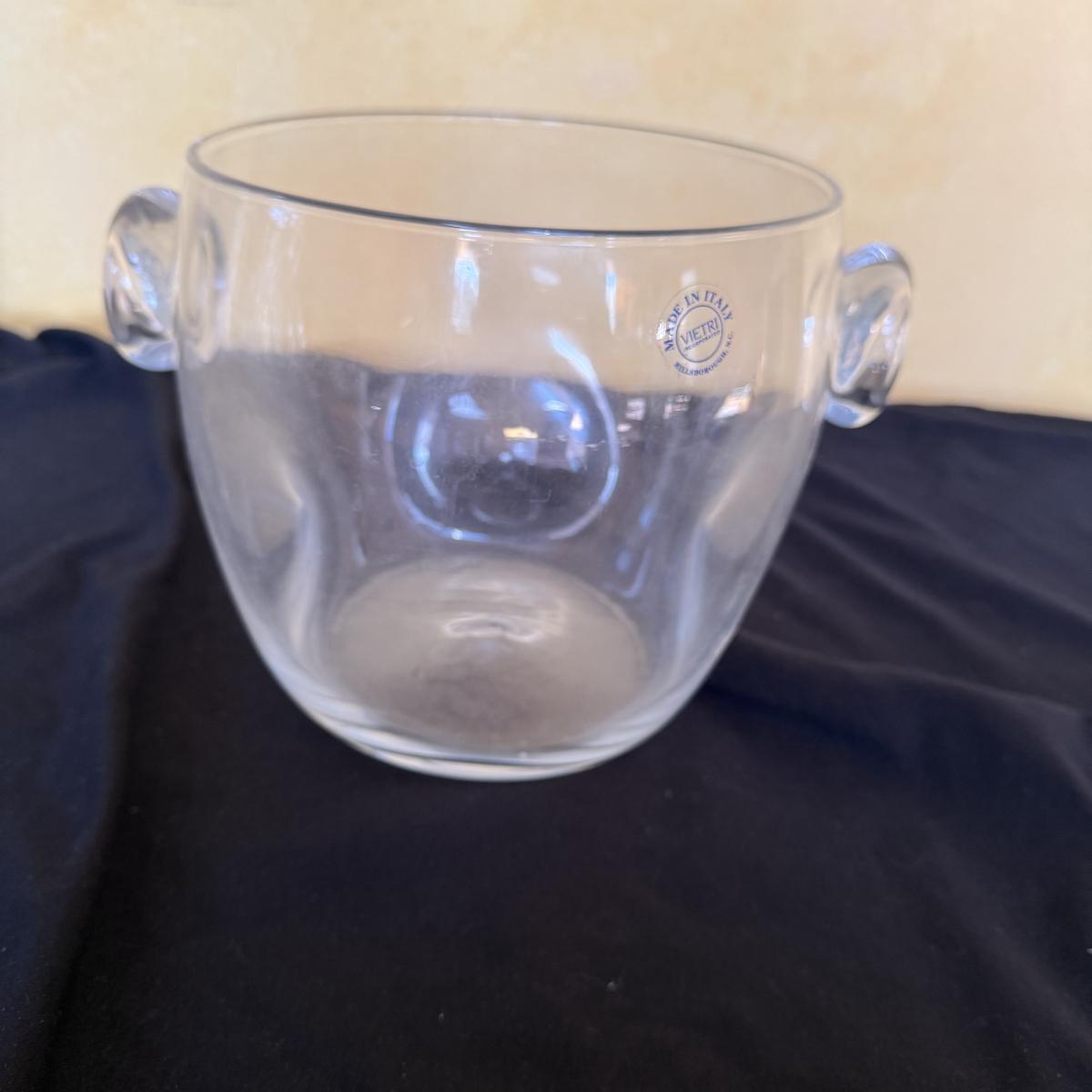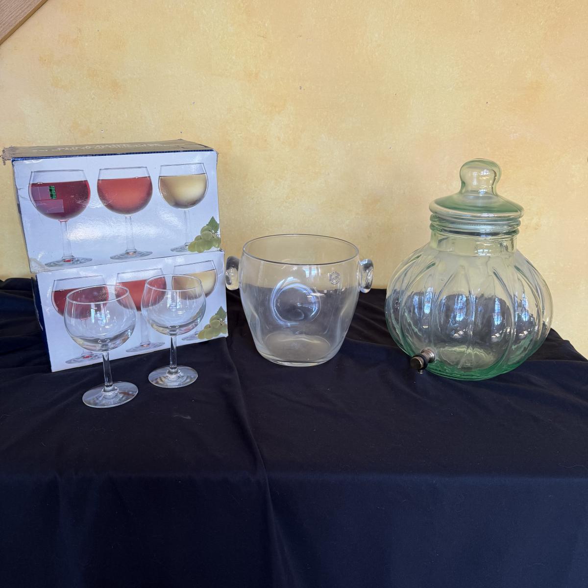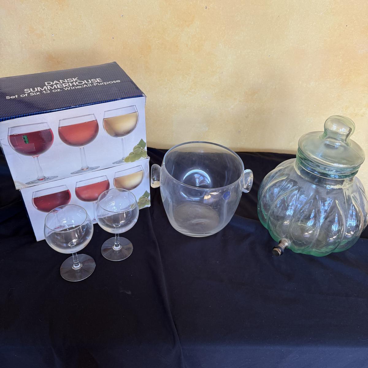This lot contains several dinner party must haves!! First we have a VIETRI champagne bucket. This lovely piece is made of glass and is stamped by VIETRI, see pictures for details. It measures 5”D at the base 8”D at the mouth and stands 7.5”H. Next is a very neat green-glass pumpkin beverage dispenser. This item has a lid and “Made in Italy” stamped on the bottom. Last in this lot is two, sets of six 13oz wine glasses for a total of 12 glasses. They come in their original boxes and stand 6.5”H. There is a chip on the base of one of the glasses. See pictures for details. Local pick up only.