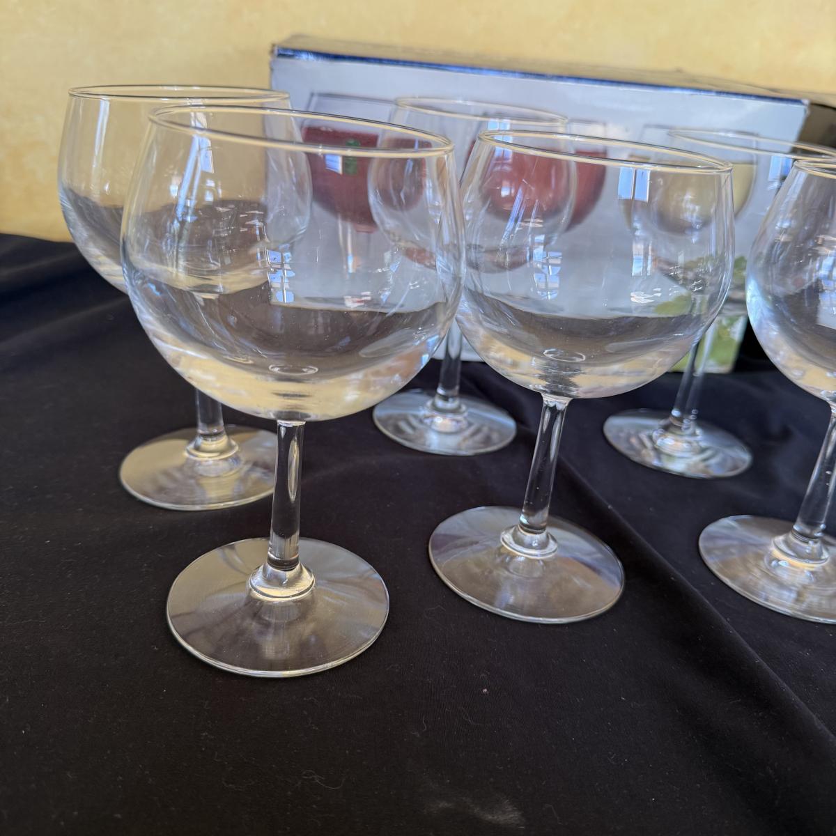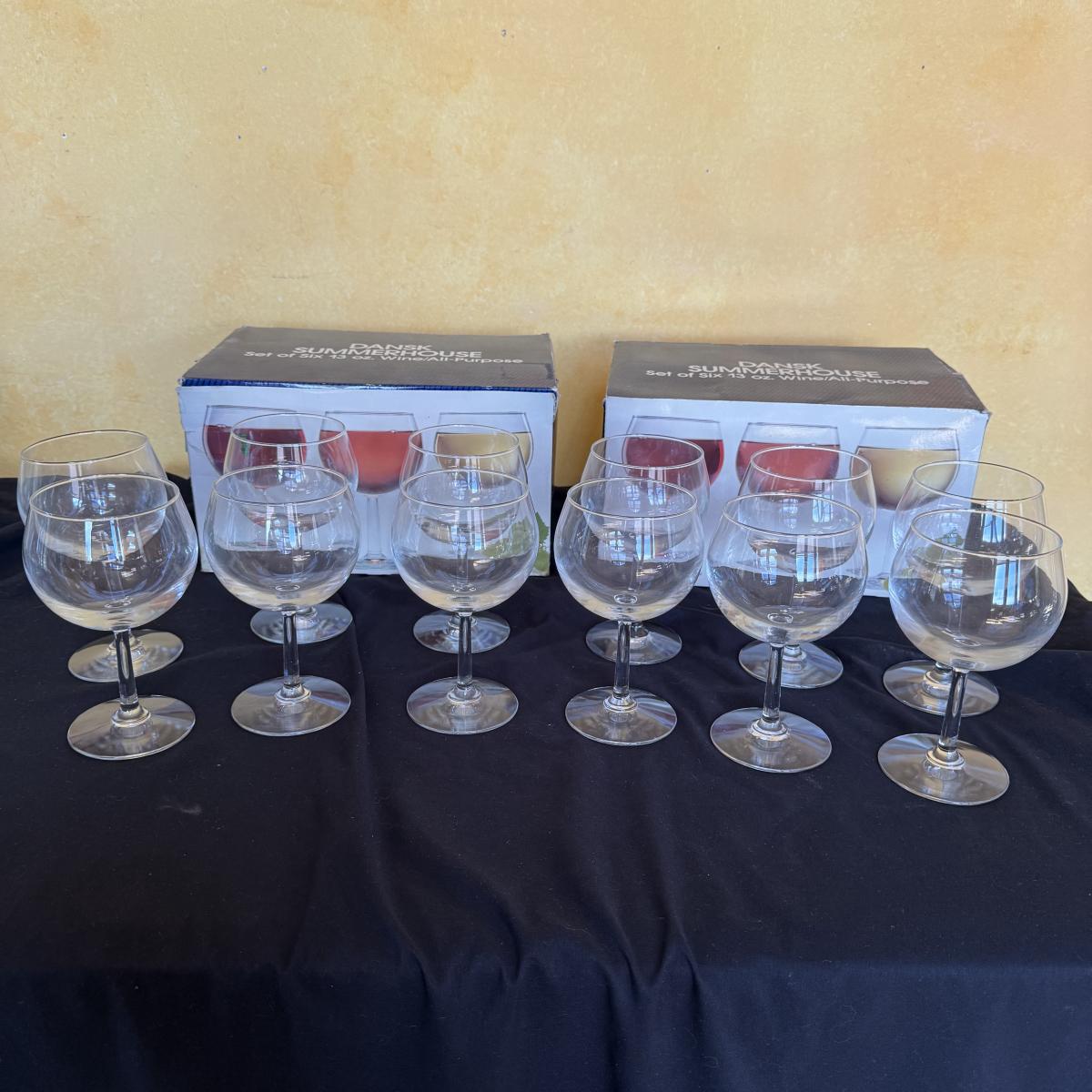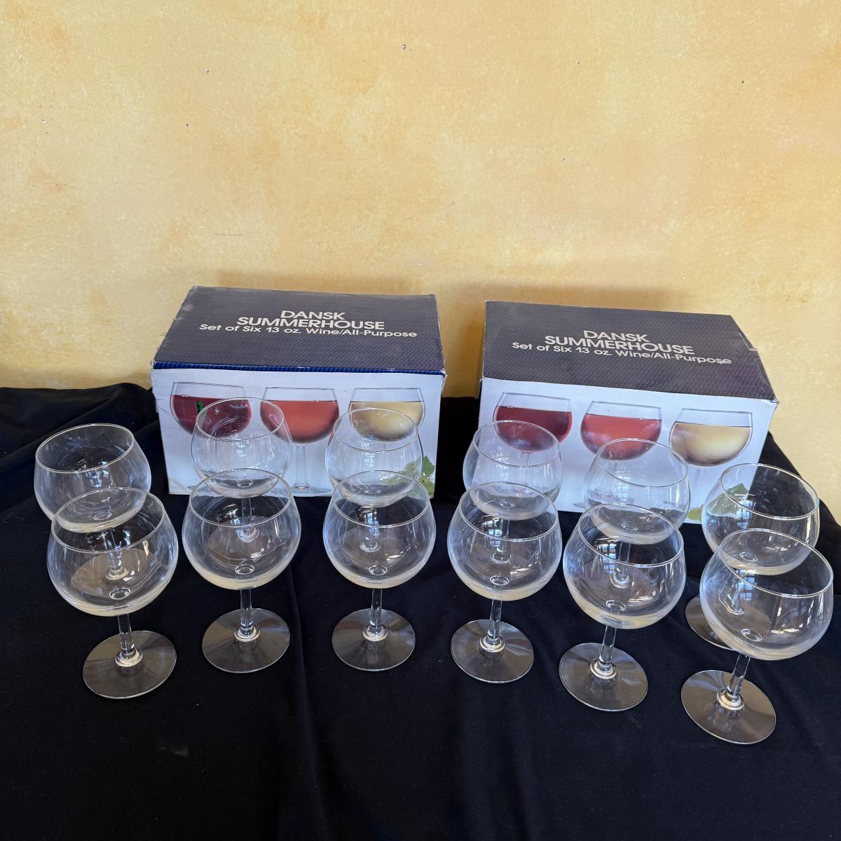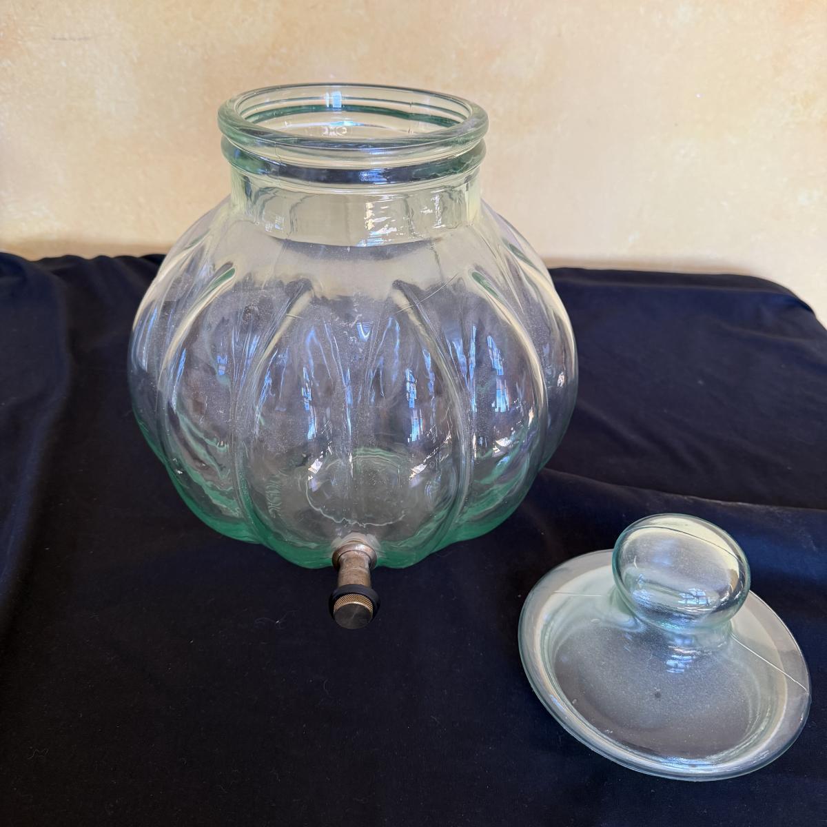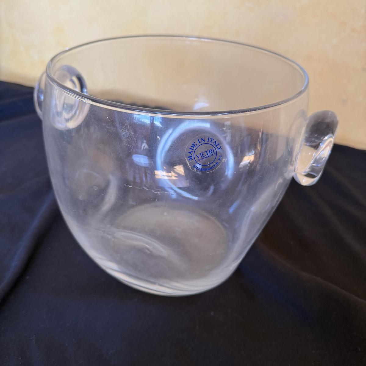 This lot contains several dinner party must haves!! First we have a VIETRI champagne bucket. This lovely piece is made of glass and is stamped by VIETRI, see pictures for details. It measures 5”D at the base 8”D at the mouth and stands 7.5”H. Next is a very neat green-glass pumpkin beverage dispenser. This item has a lid and “Made in Italy” stamped on the bottom. Last in this lot is two, sets of six 13oz wine glasses for a total of 12 glasses. They come in their original boxes and stand 6.5”H. There is a chip on the base of one of the glasses. See pictures for details. Local pick up only.