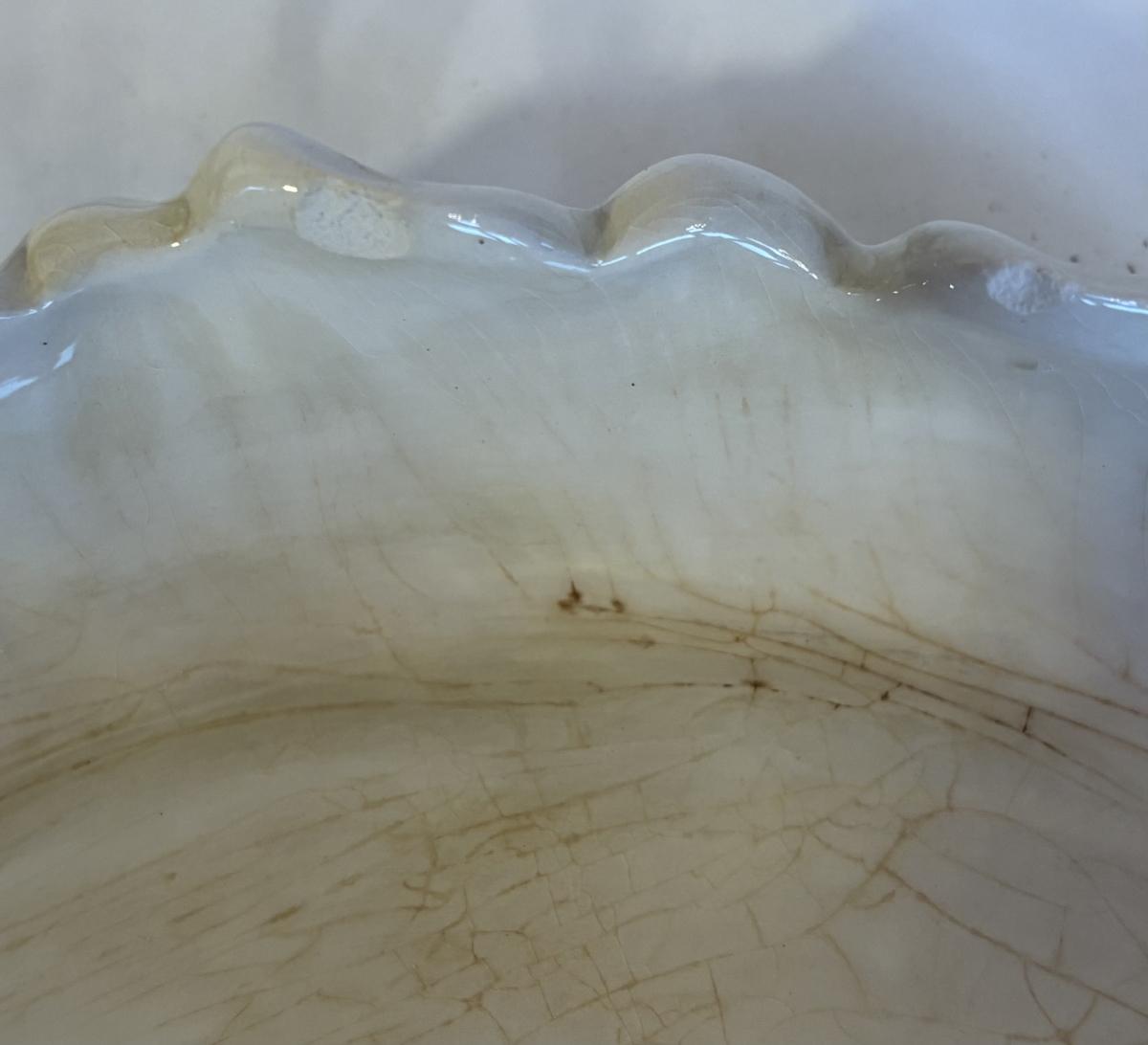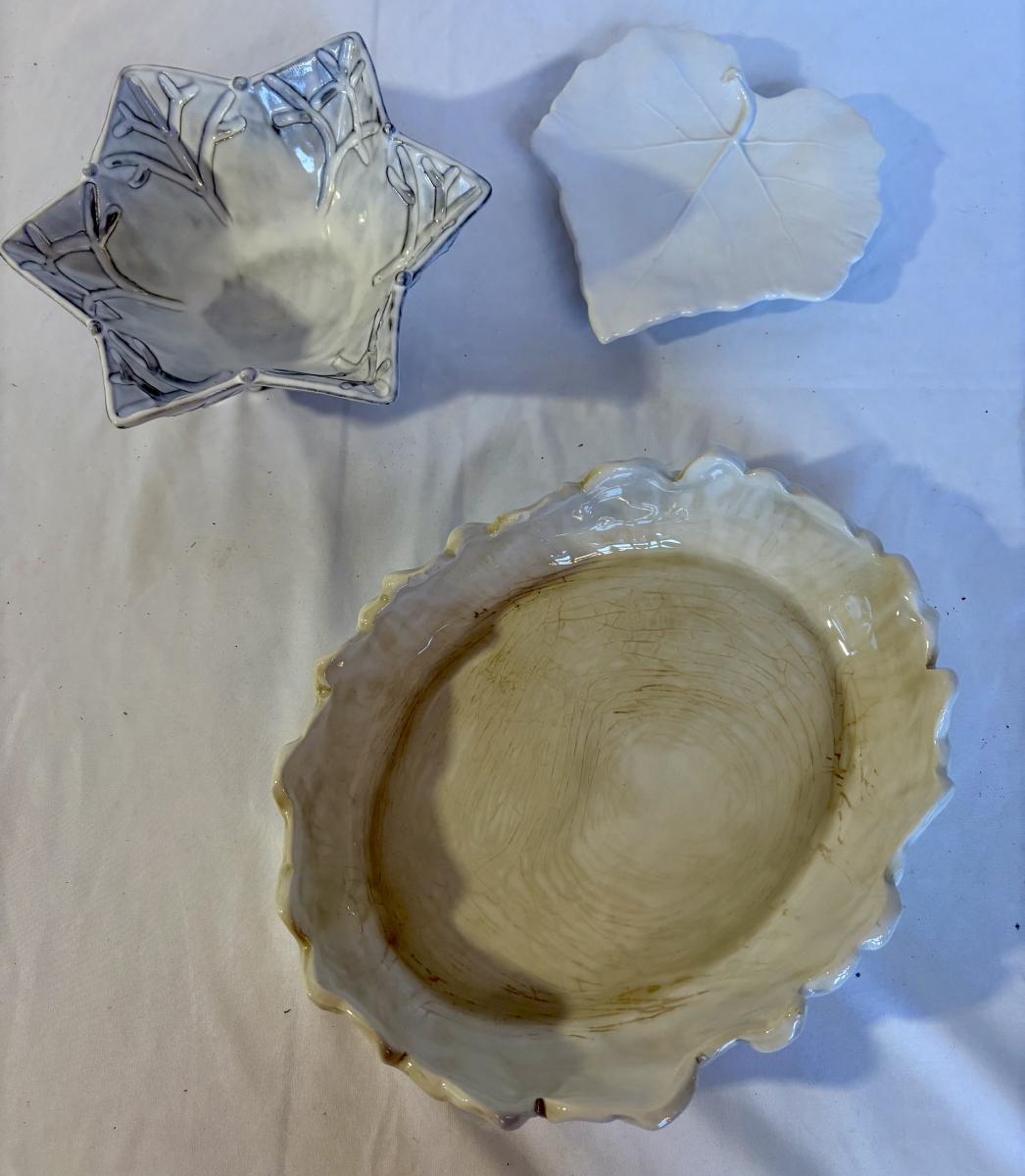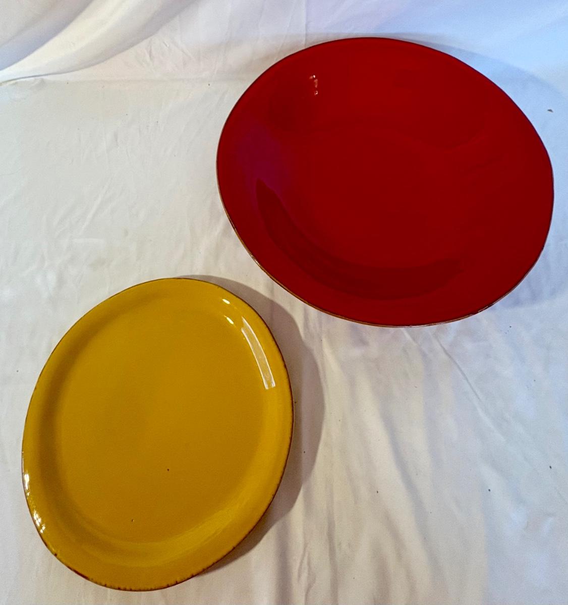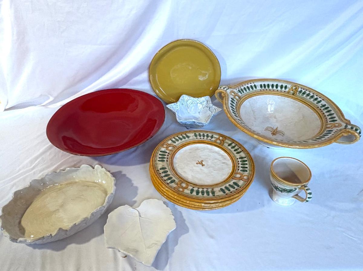 Mixed pieces with a rustic feel. Red bowl is 15” in diameter and 3” deep. Four matching plates are 11.5”. Small leaf is approximately 6.5” x 6”. Shipping available.