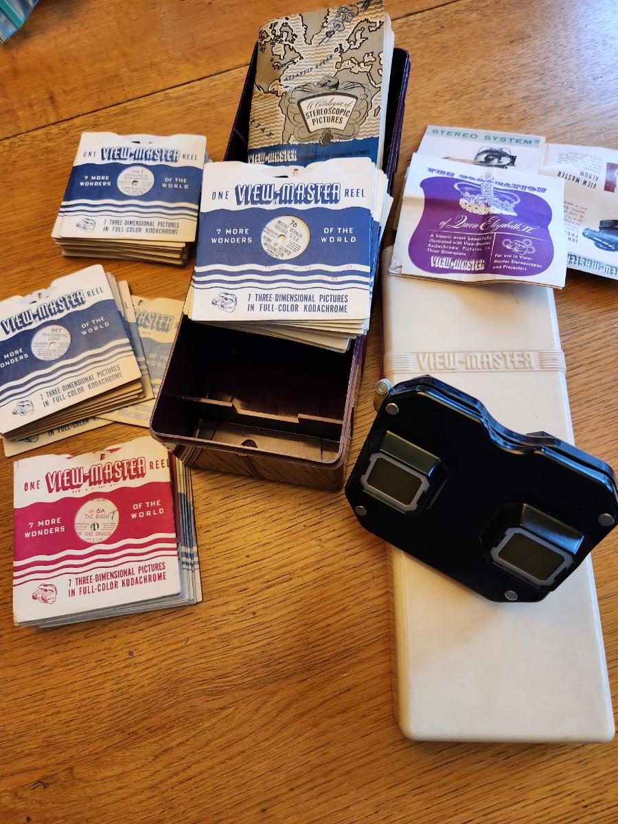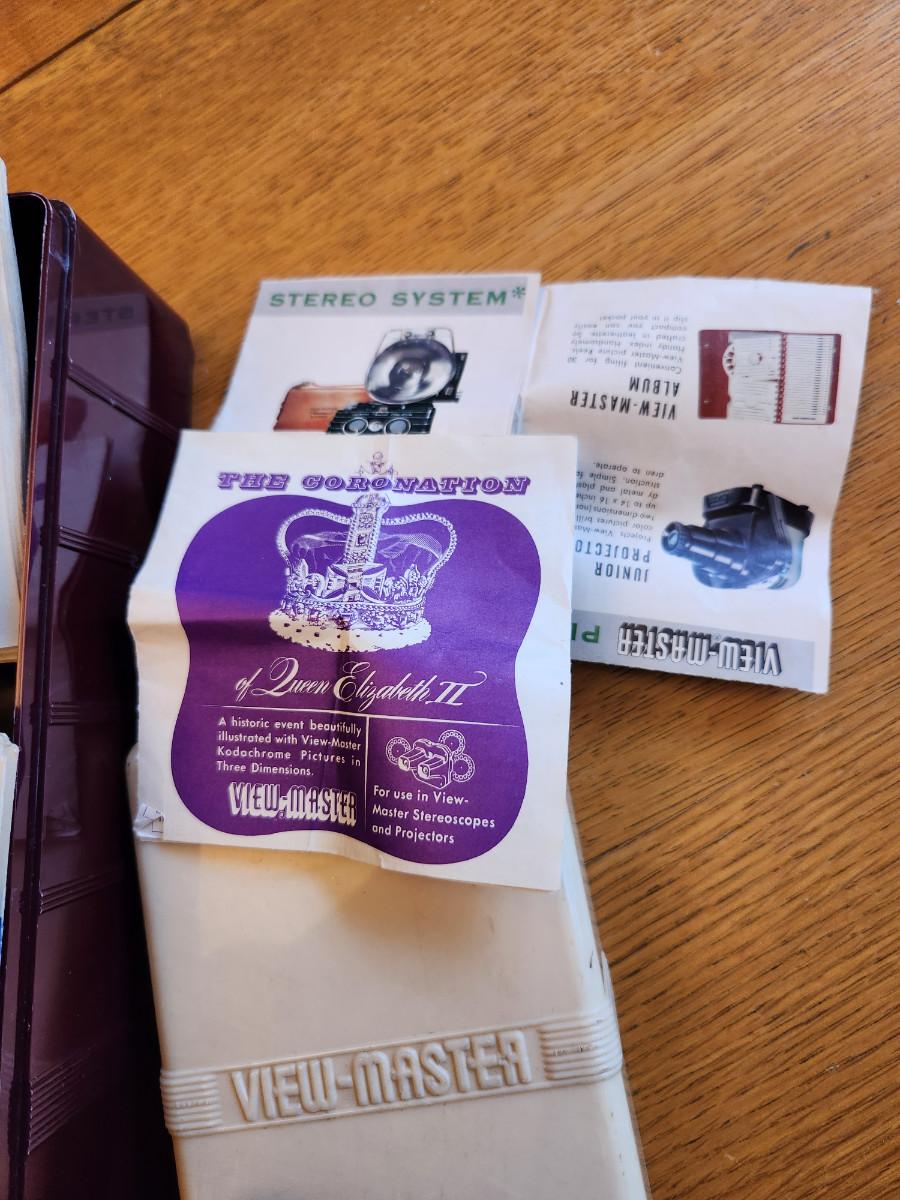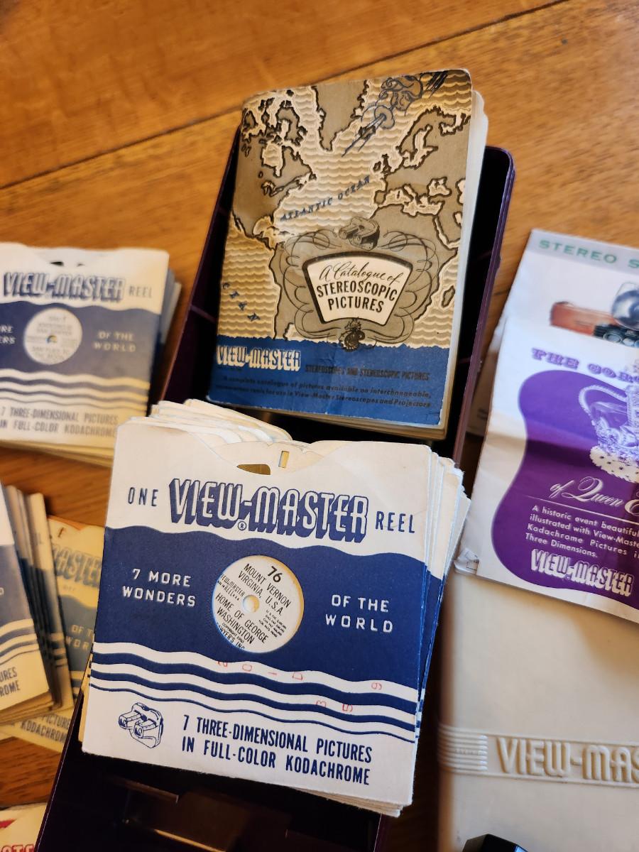 This auction lot is for a vintage View-Master Collection. This collection includes the View-Master and about 54 various reels and sets of reels. Reels show Fairy Tales, Bible Stories, Coronation of Queen Eliazbeth, American Tourist Sites and Children's Tales including "Little Black Sambo." Several catalogs plus index cards. All contained in a View-Master File Box.