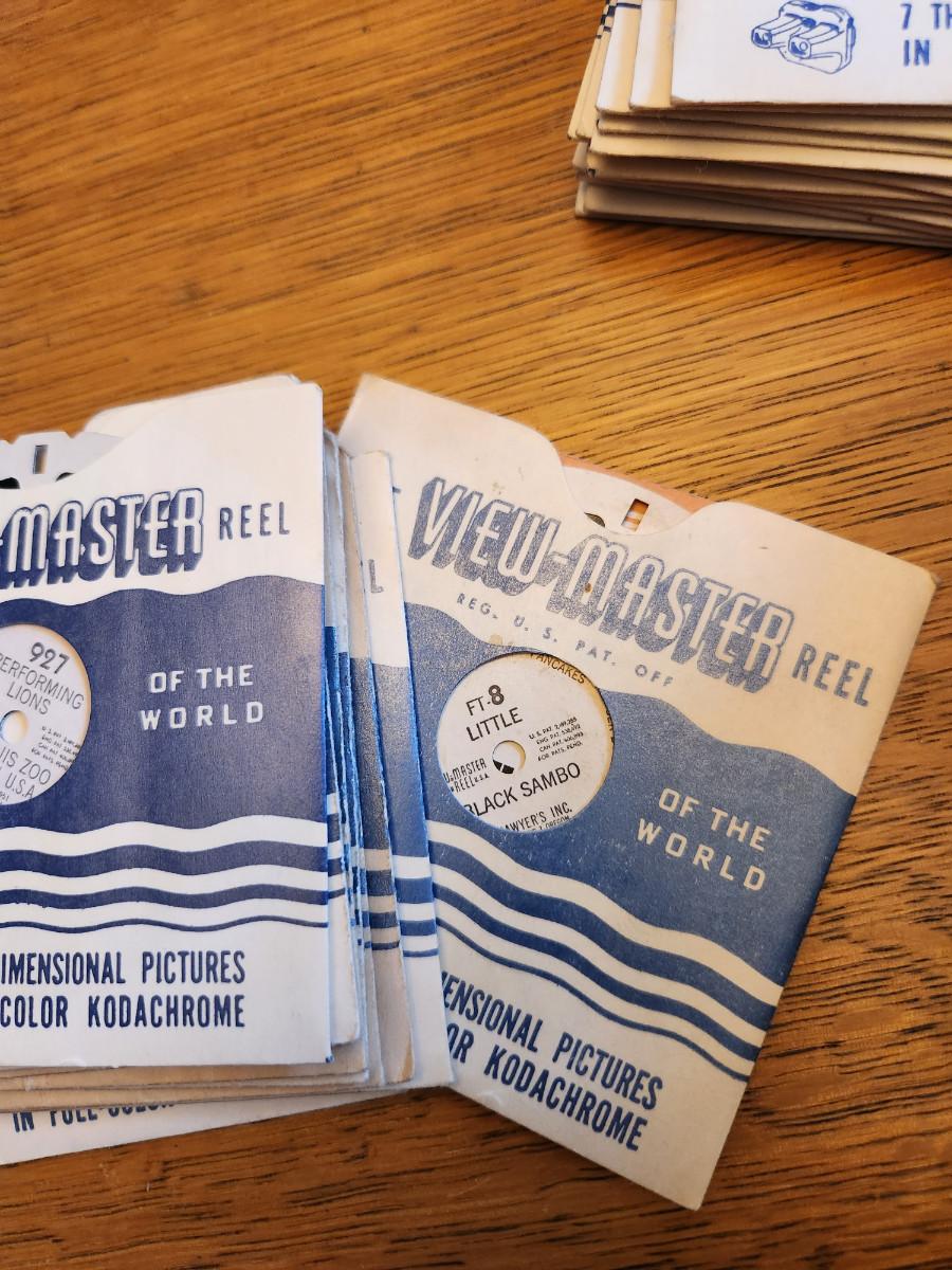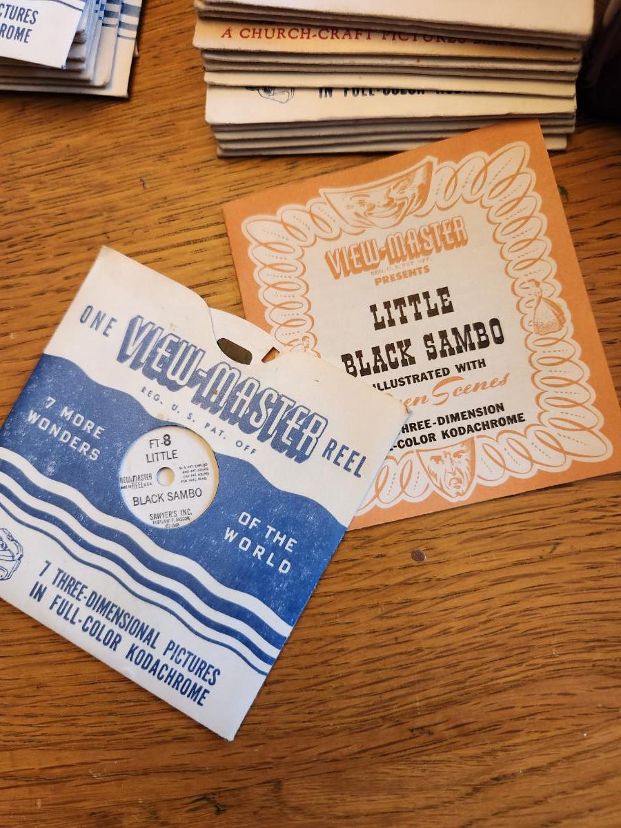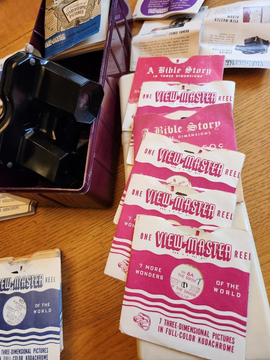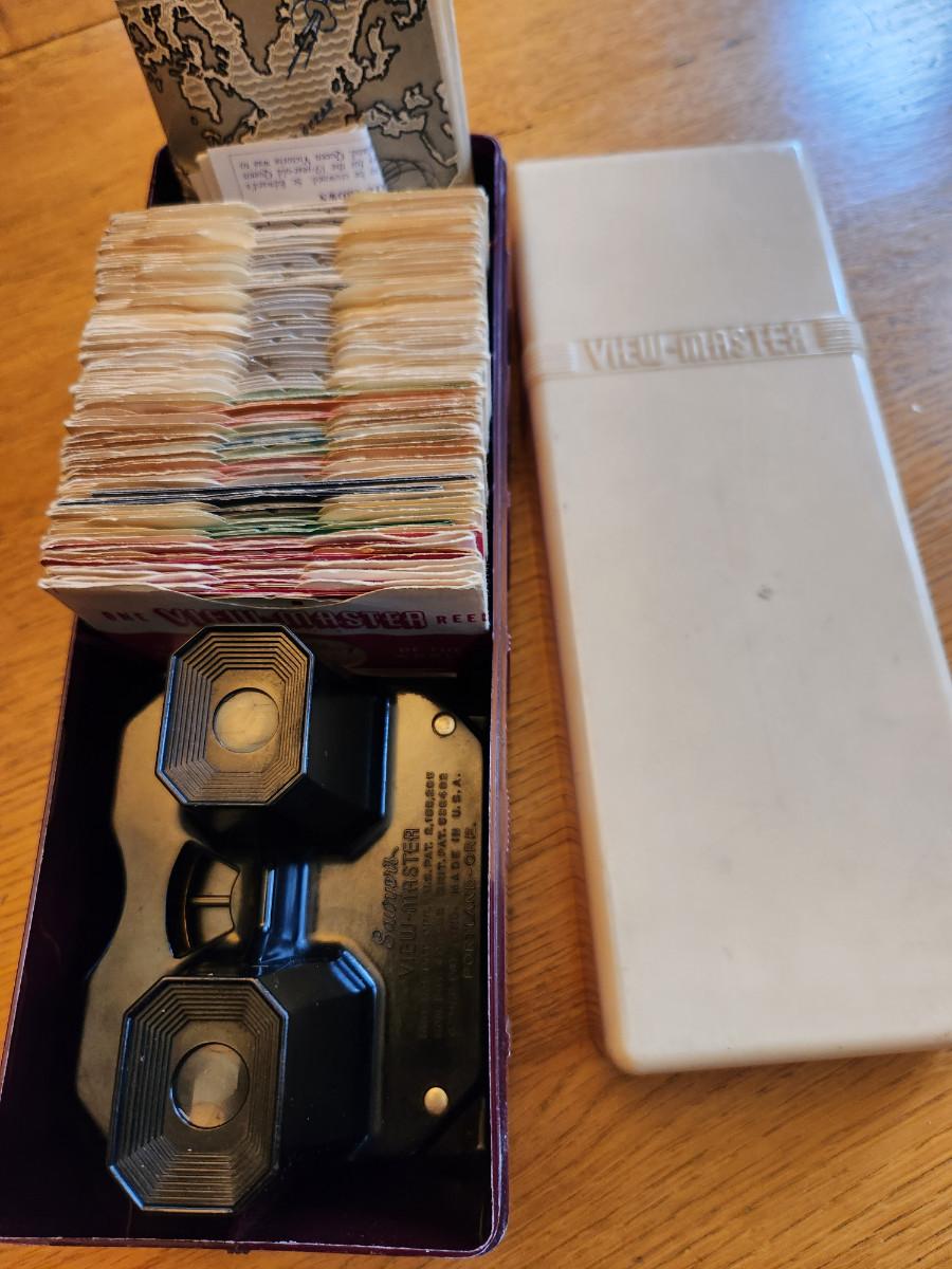 This auction lot is for a vintage View-Master Collection. This collection includes the View-Master and about 54 various reels and sets of reels. Reels show Fairy Tales, Bible Stories, Coronation of Queen Eliazbeth, American Tourist Sites and Children's Tales including "Little Black Sambo." Several catalogs plus index cards. All contained in a View-Master File Box.