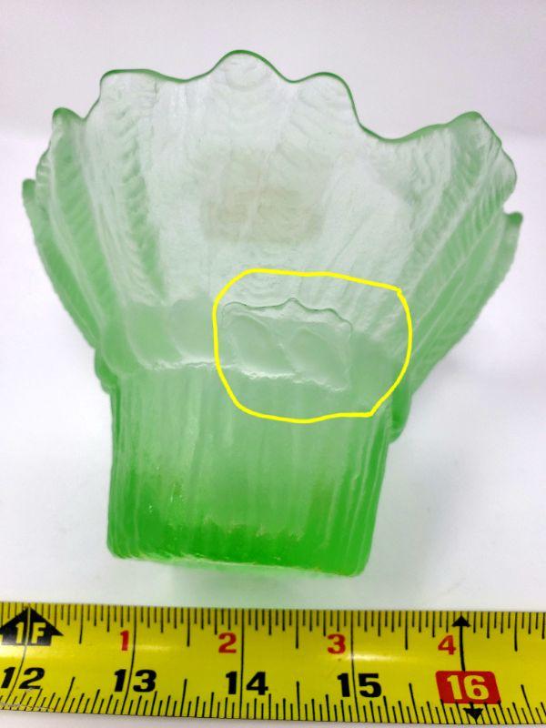Small area marked in photo looks like a flaw in the glass, it doesn't go through, the other side is smooth. Beautiful color and will look amazing with a fresh bouquet of spring flowers!