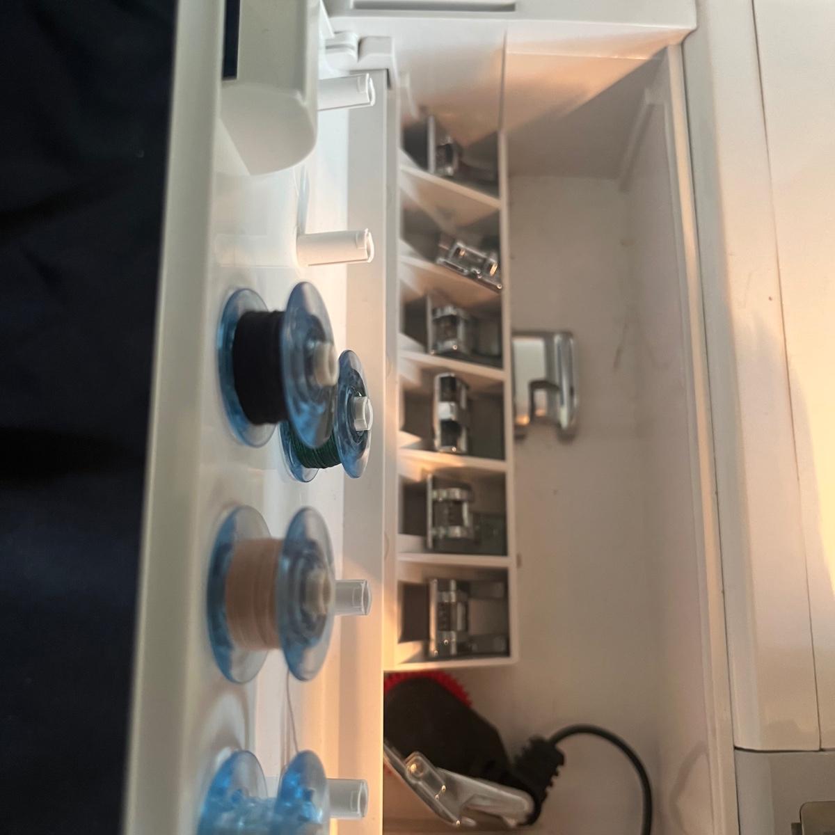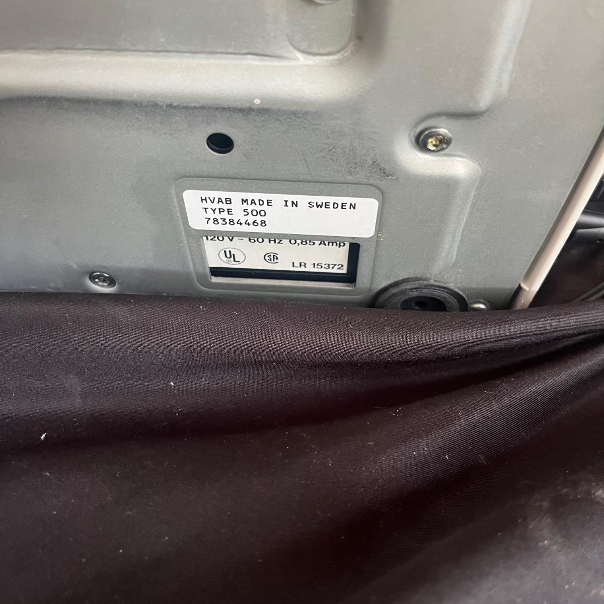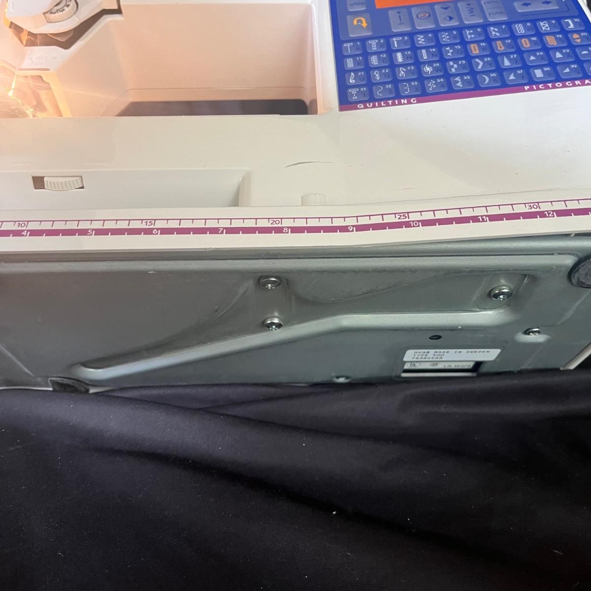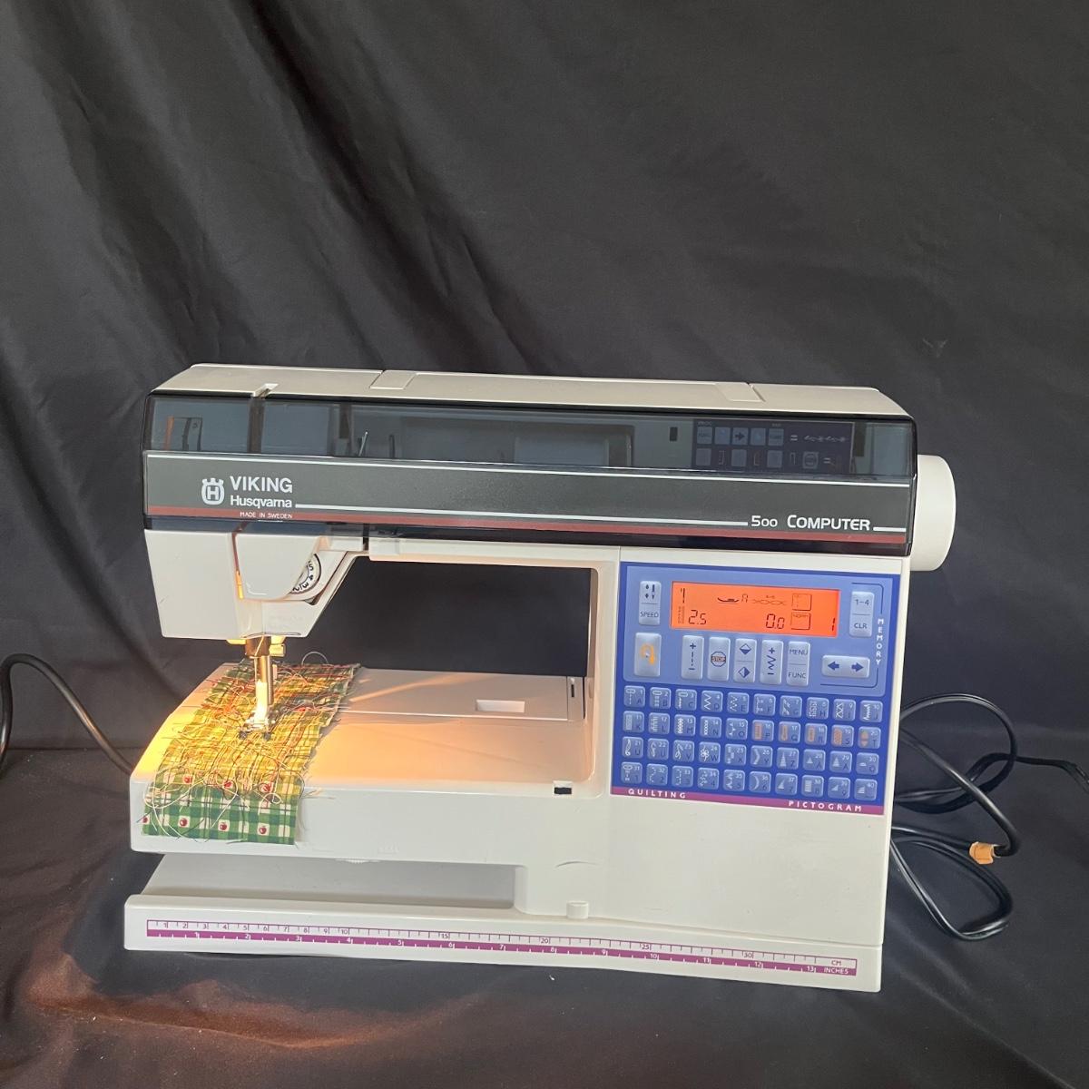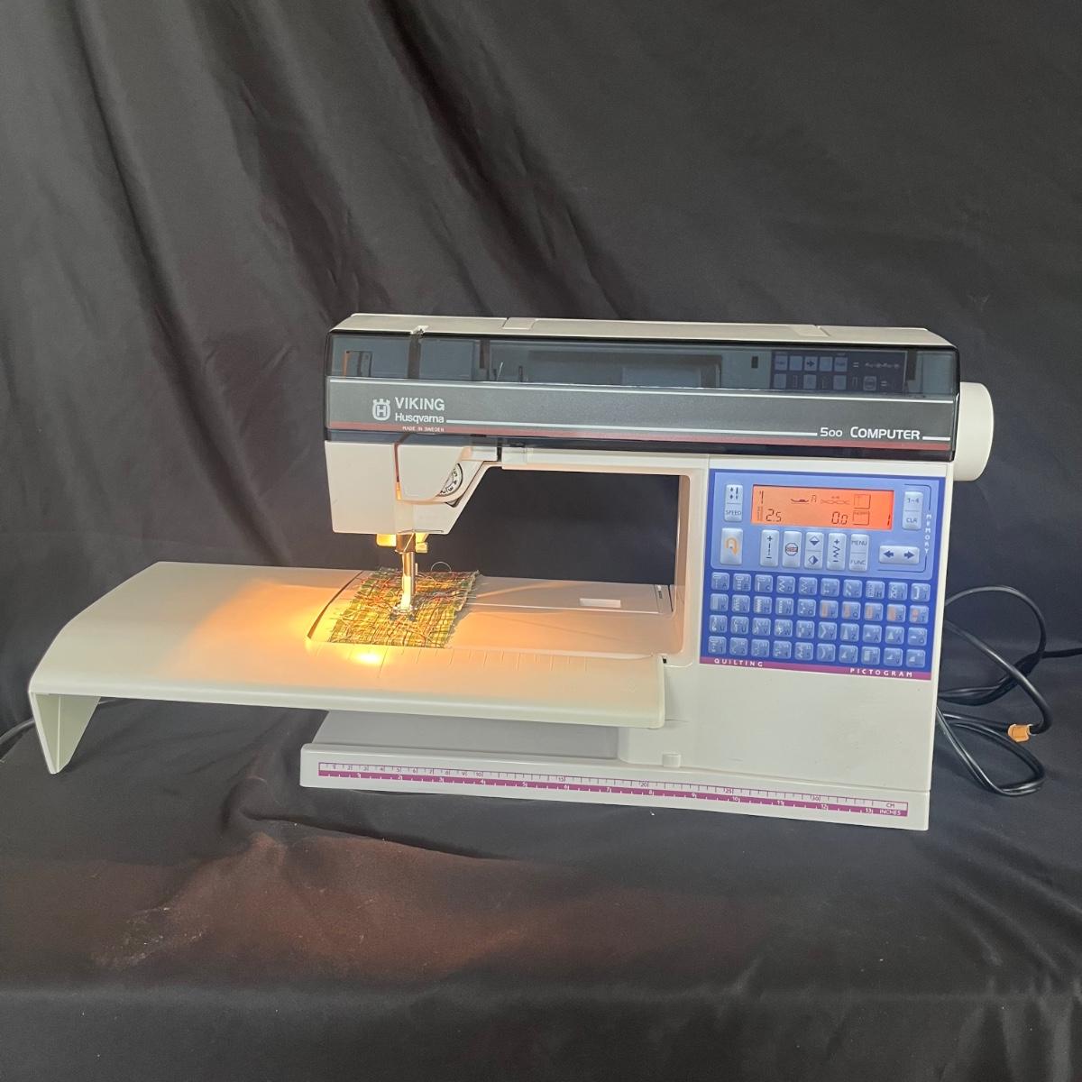 Lot includes a Husqvarna Viking 500 Computer sewing machine with foot pedal and carrying case and accessories. Machine powered on when plugged in. Machine measures 7” x 15” x 12”.