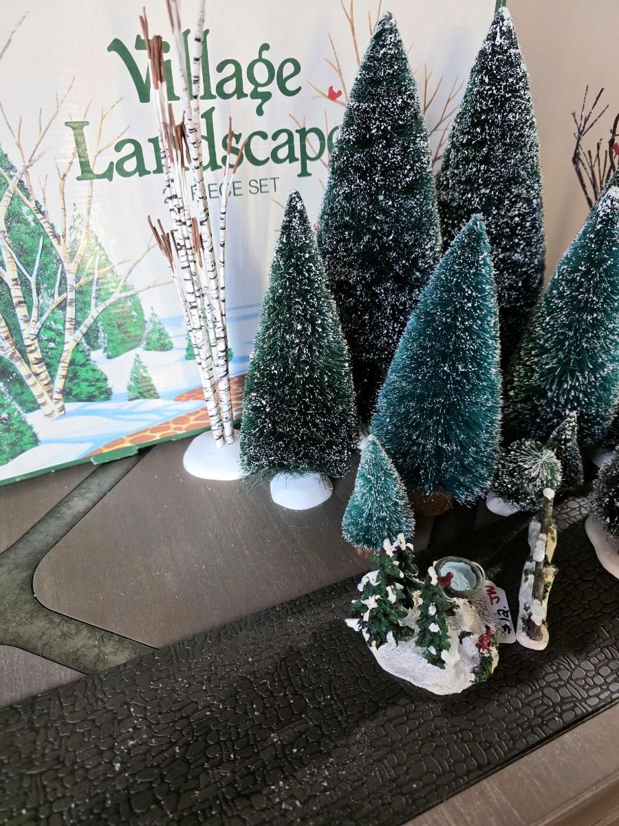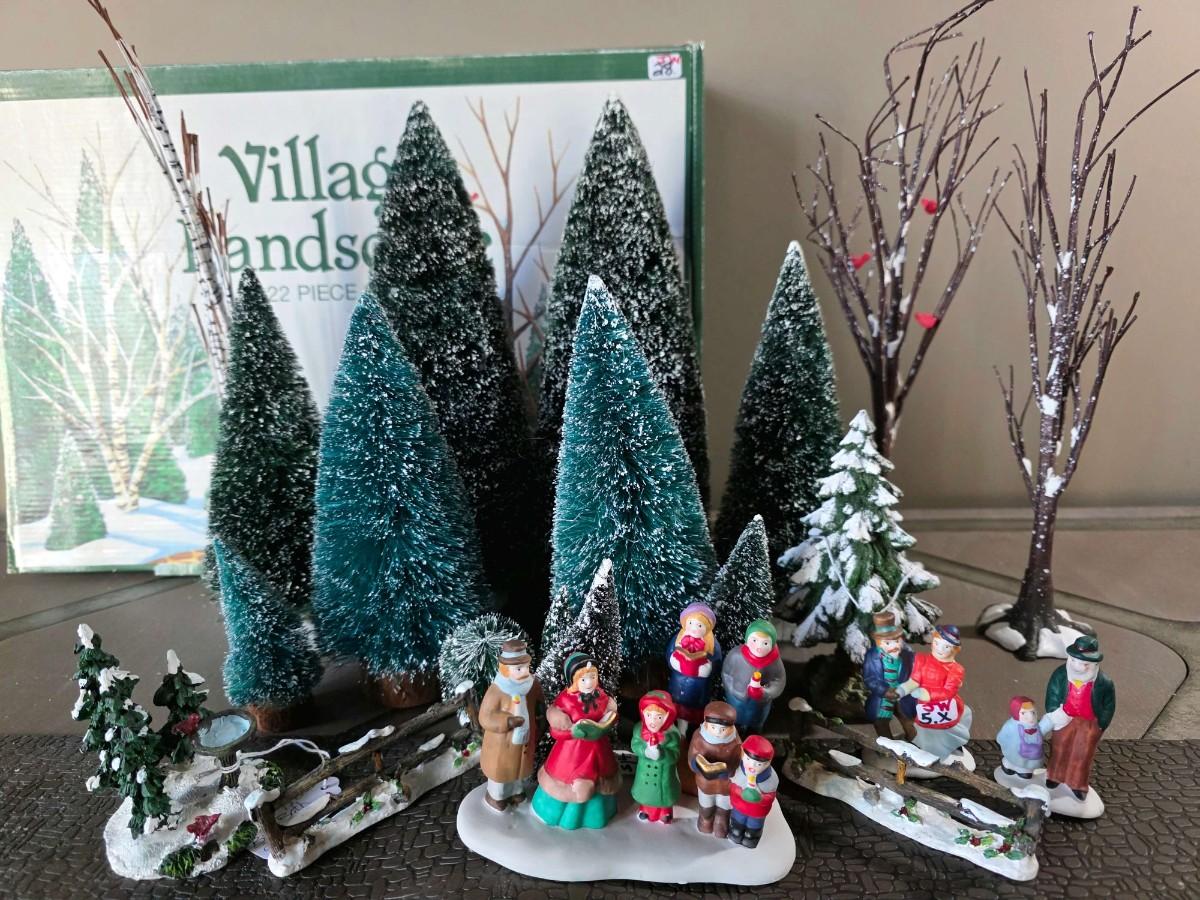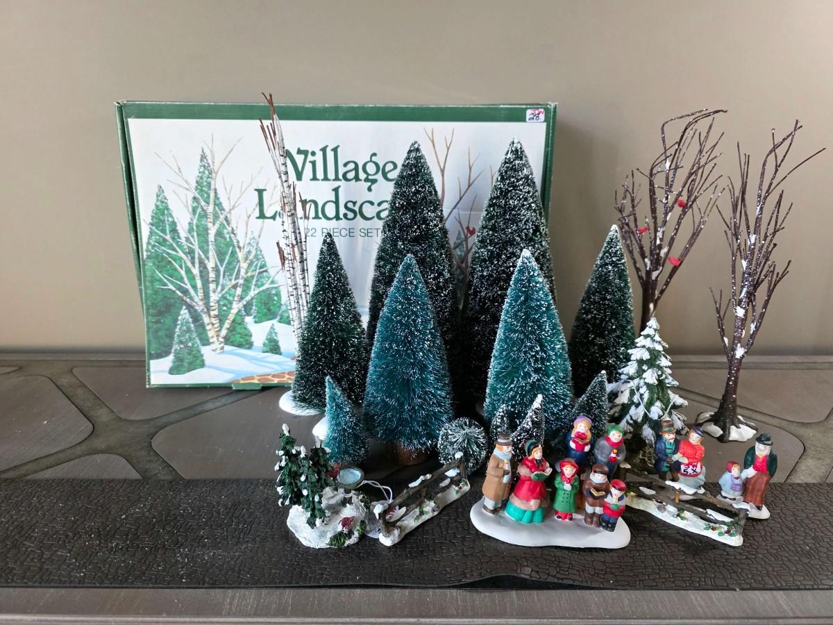 Dept. 56 "Village Landscape" includes 14 of 22 original landscape pieces in original box and miscellaneous figures and fence pieces. no boxes.