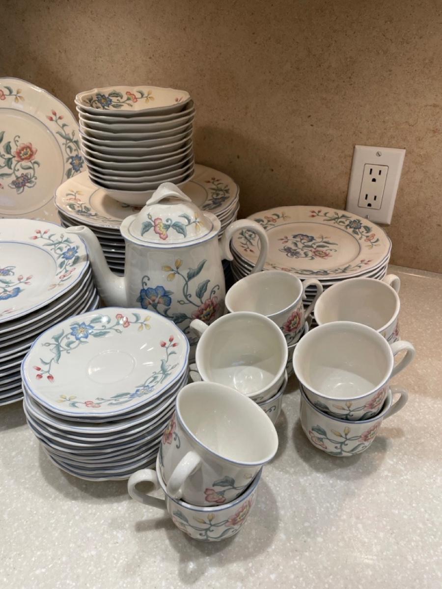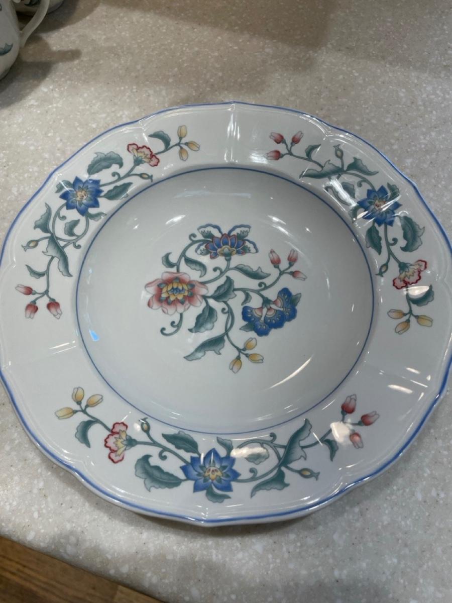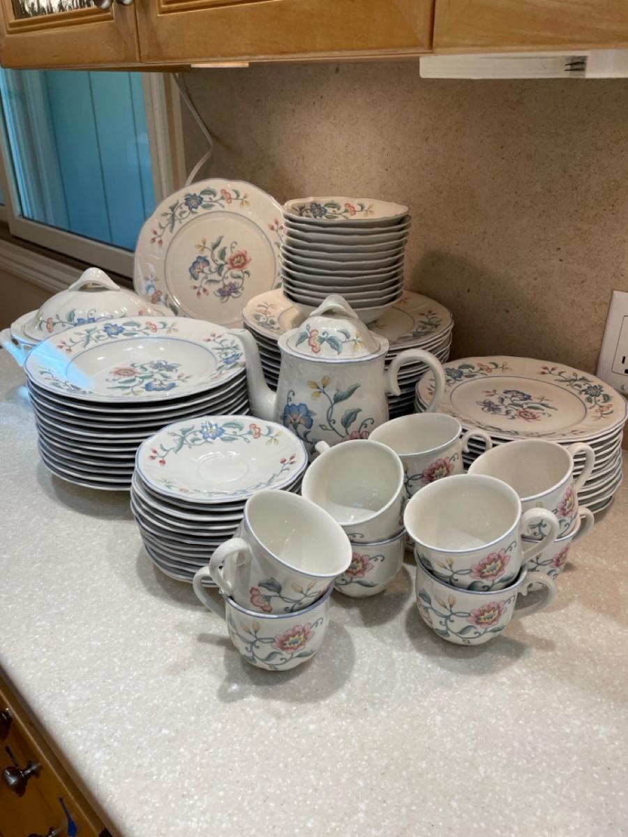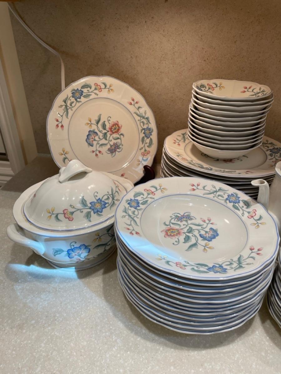 15 dinner, 11 salad, 12 soup bowls, 12 fruit bowls, 12 saucer, 10 cups, soup tureen, coffee pot