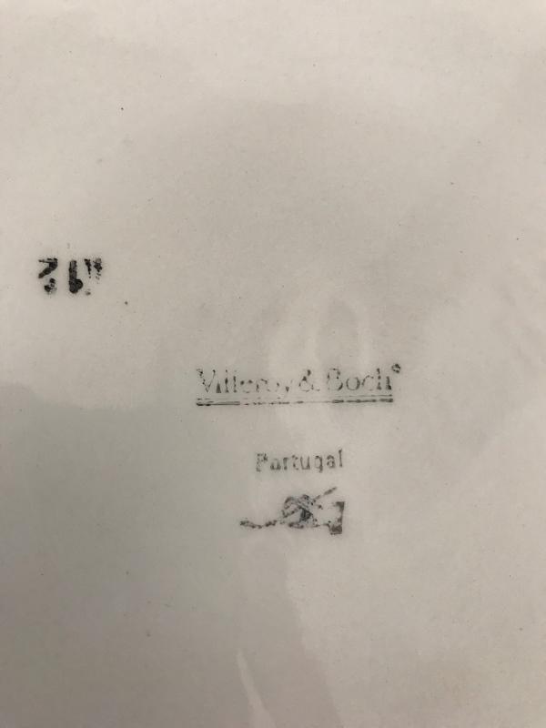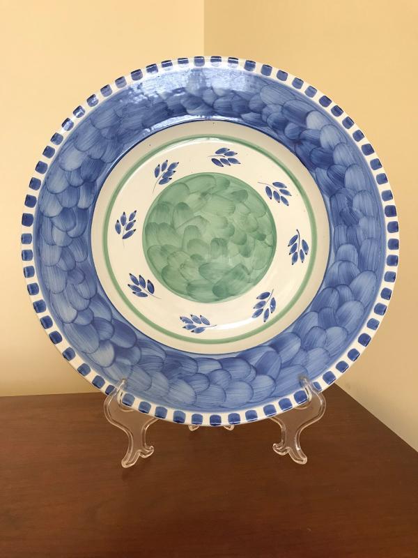Very nice Villeroy & Boch large decorative hand painted plate or platter in the "Blue Leaf" pattern. Made in Portugal. Features wide blue border with green center accented with blue leaves. Includes large clear plastic plate stand. 17" D