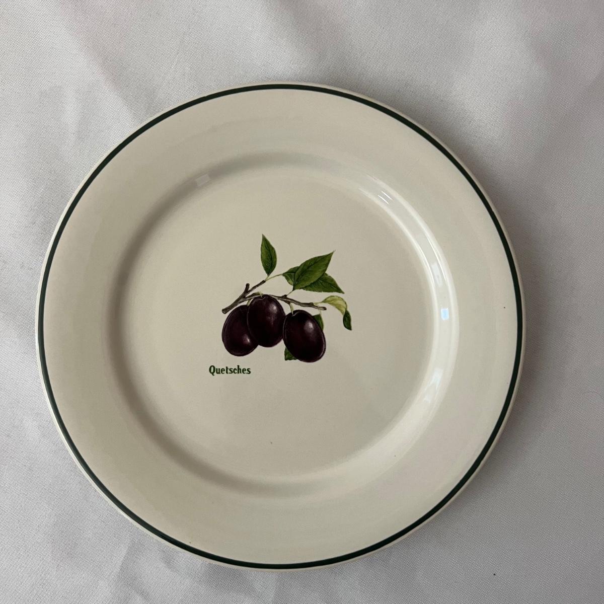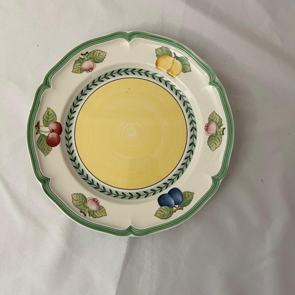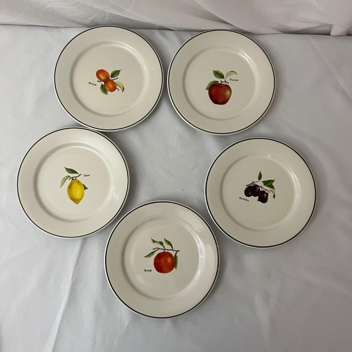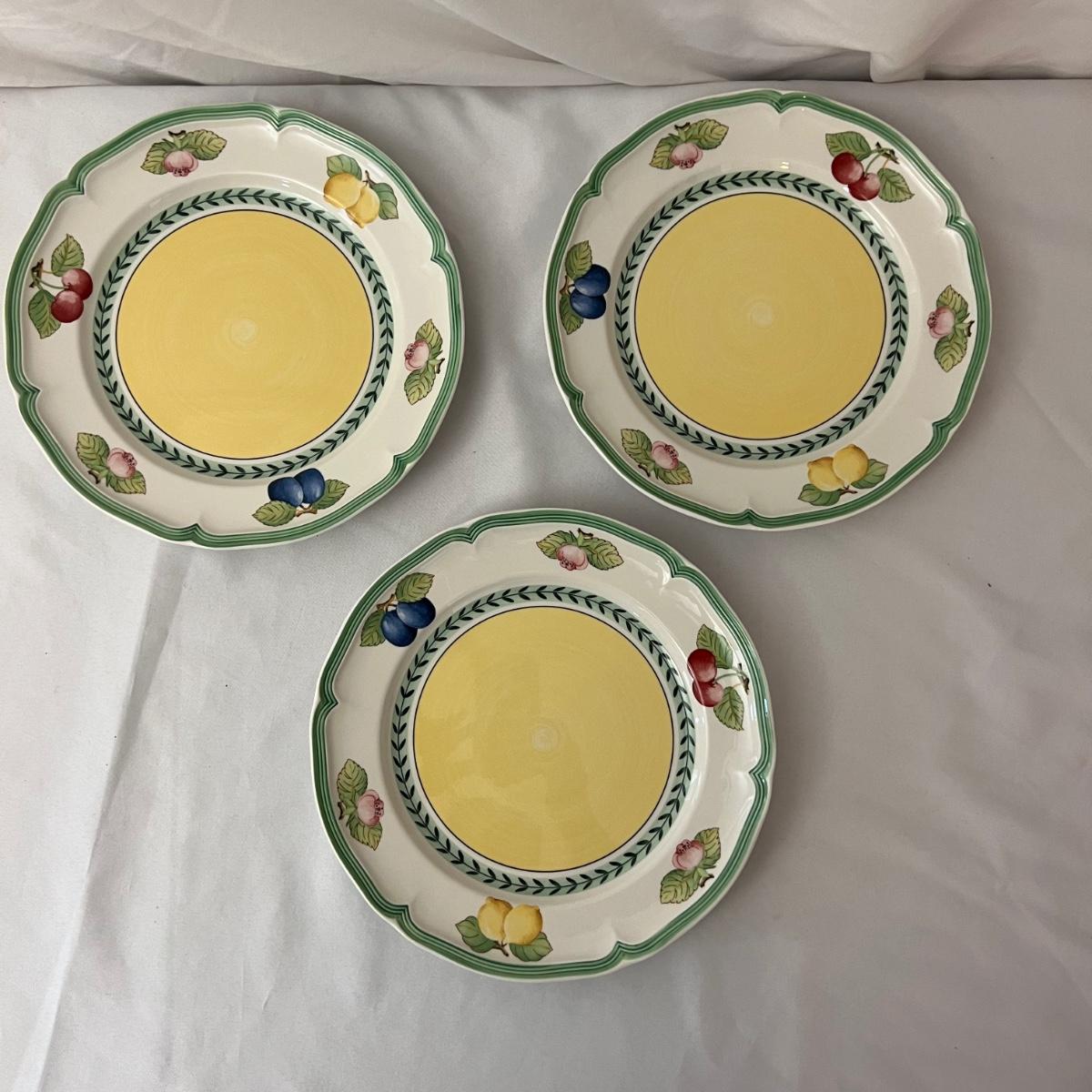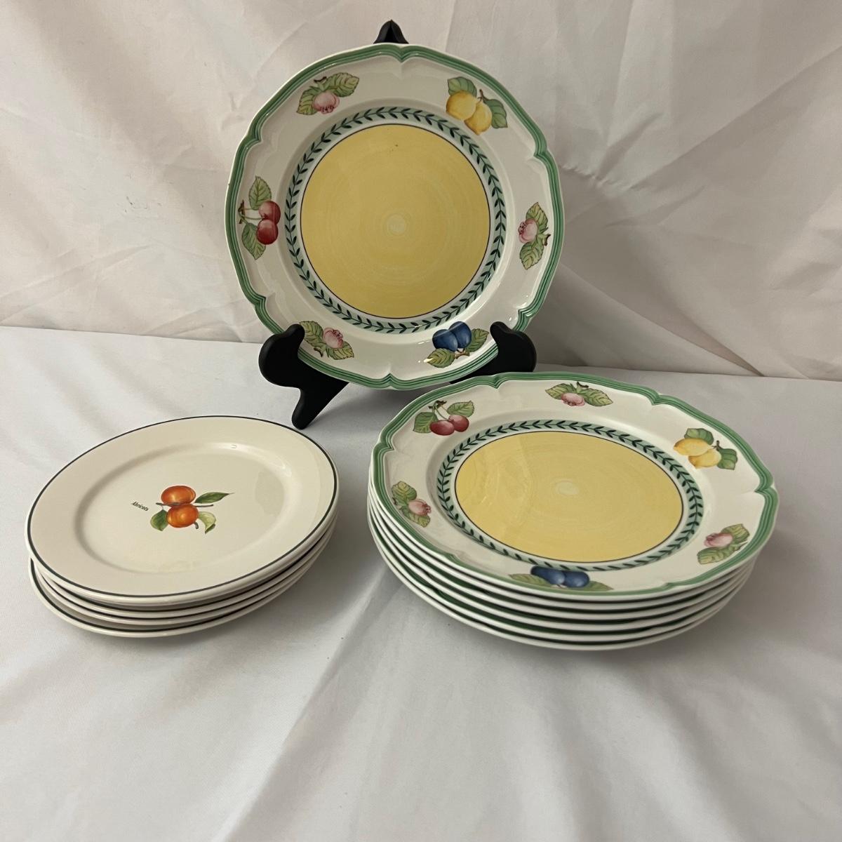 Seven Villeroy & Boch French Garden pattern dinner plates measuring 10.25”D x 1”H. Five Ulster ceramic fruit theme plates measure 8”D x .75”H.