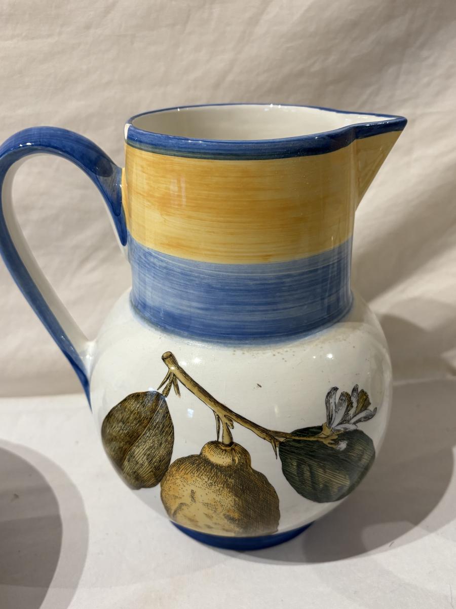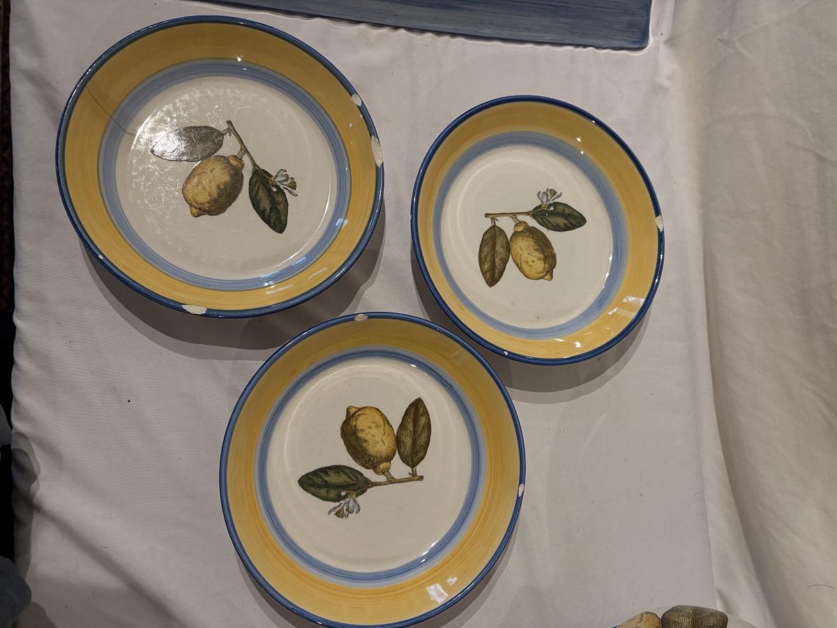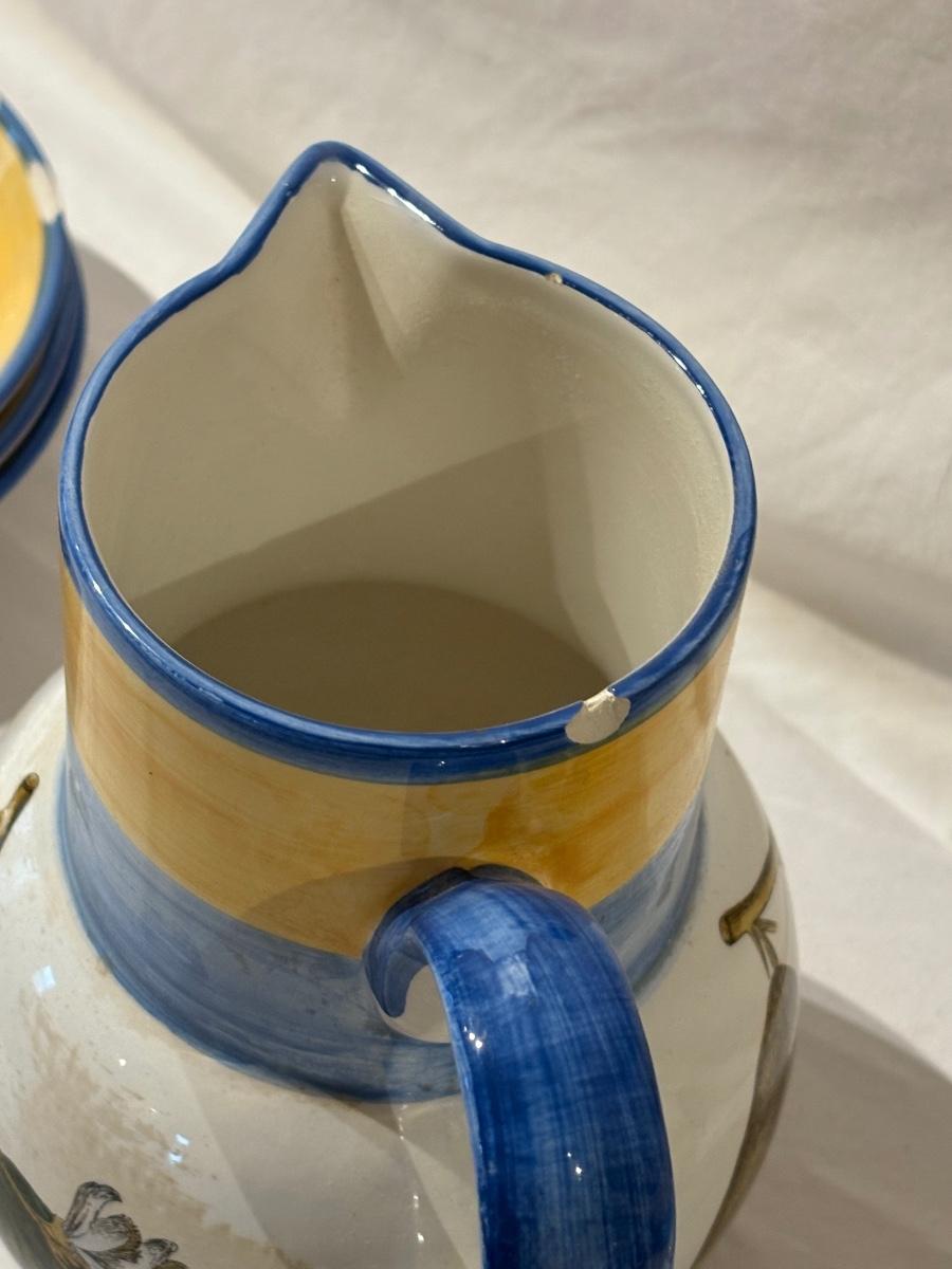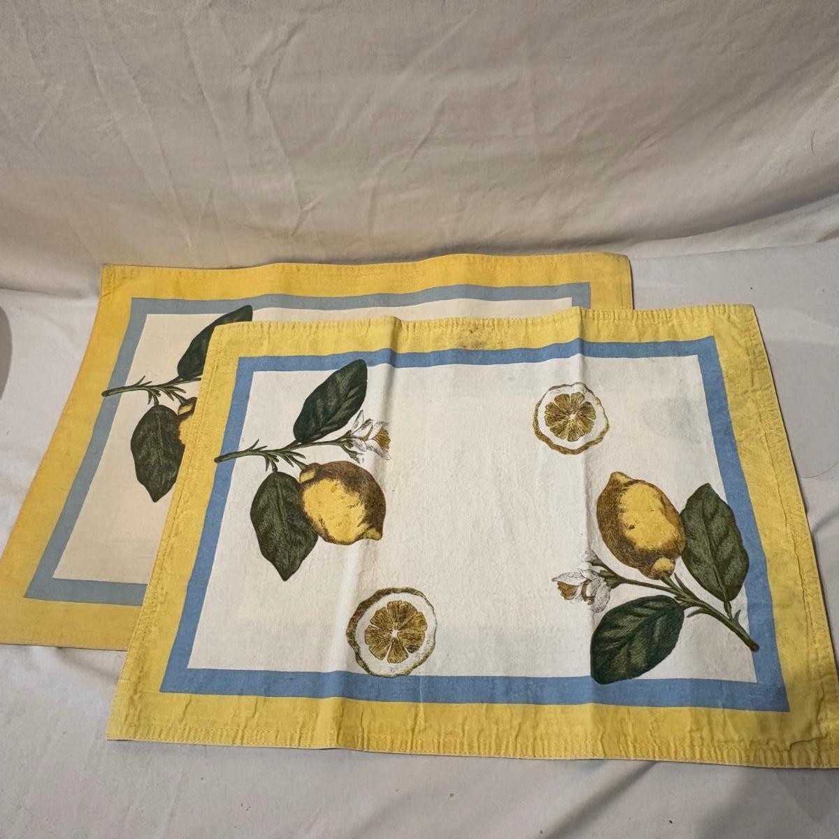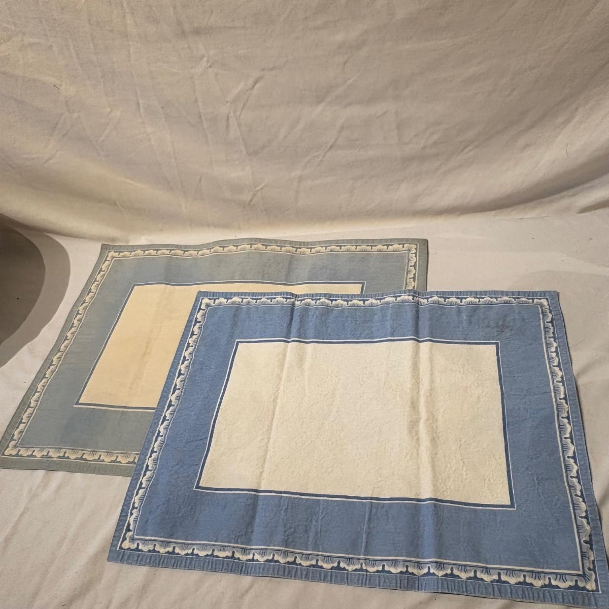 Amarillo pattern pottery set includes three 7.5” plates (all chipped see pictures), two pitchers and more. Tray measures 18” x 12” x1.5H” Bowl is 11.5” in diameter x 6.25”H. Pitchers are 7” at widest point and 8.5”H”. The placemats are 18”x 13” and one is sun-faded. Shipping available.