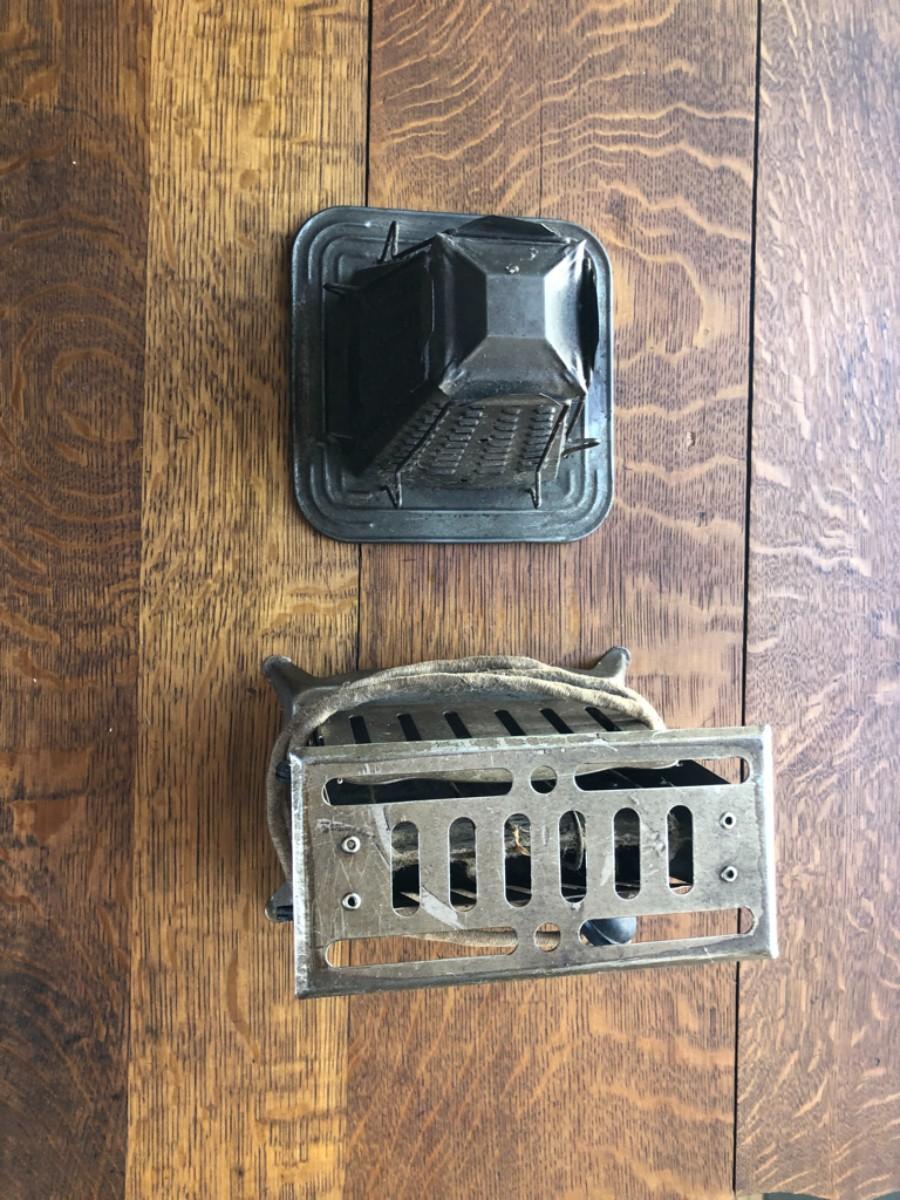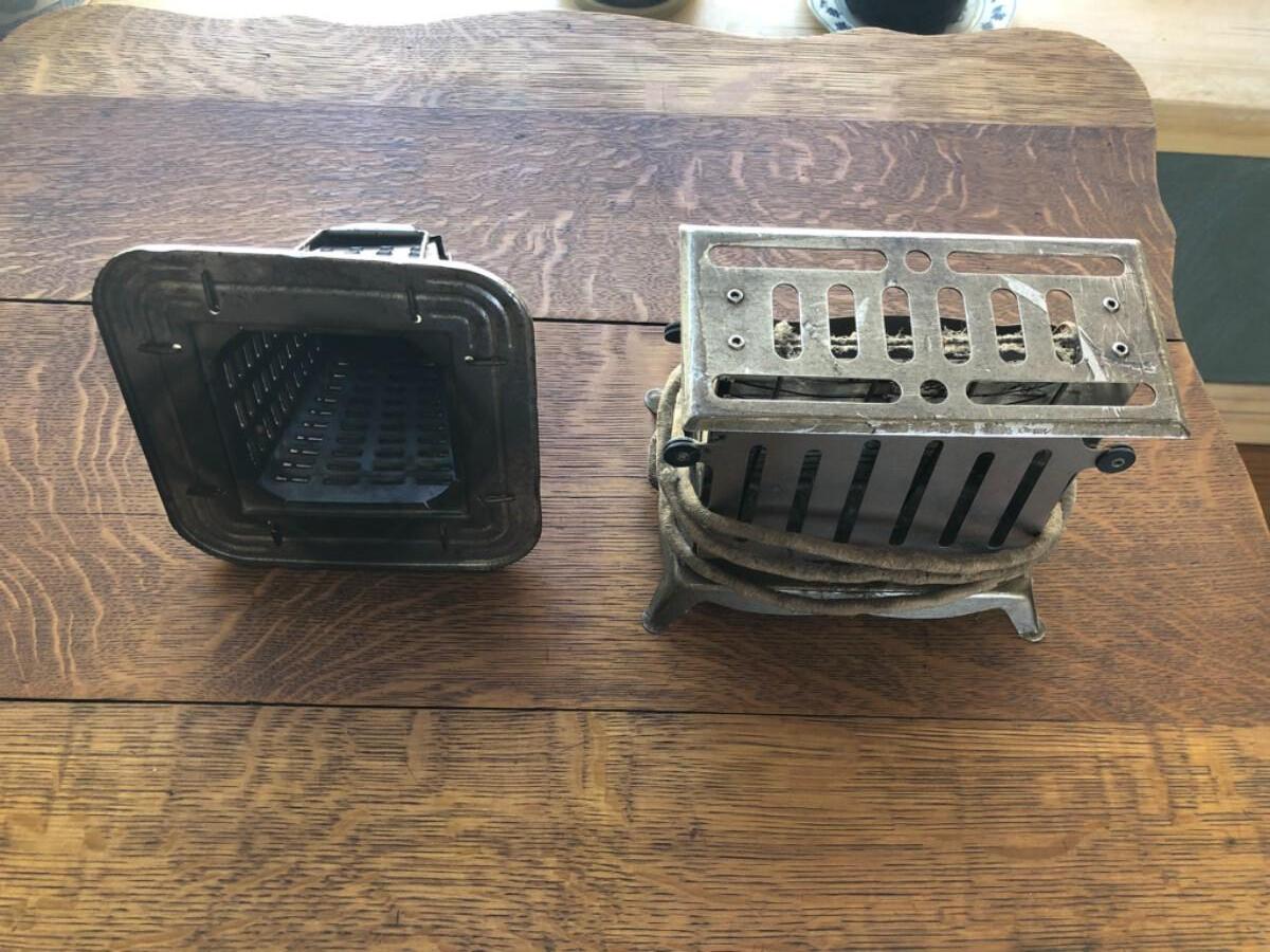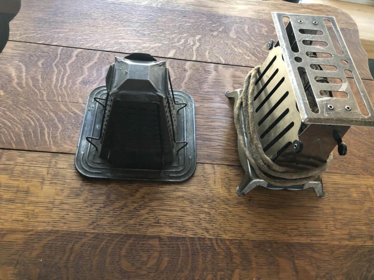 One vintage toaster is by Dominion Electrical MFG. CO and the other is unmarked. Both are in good condition.