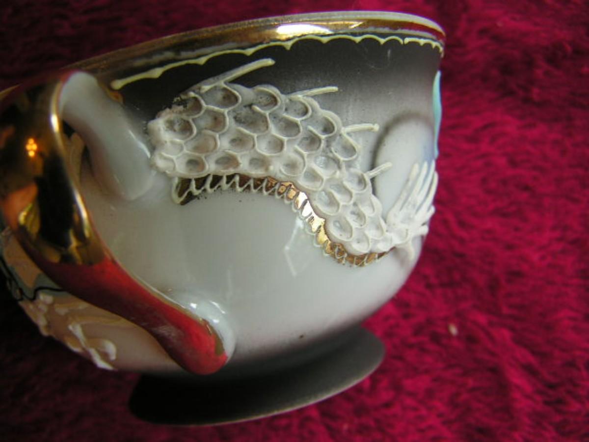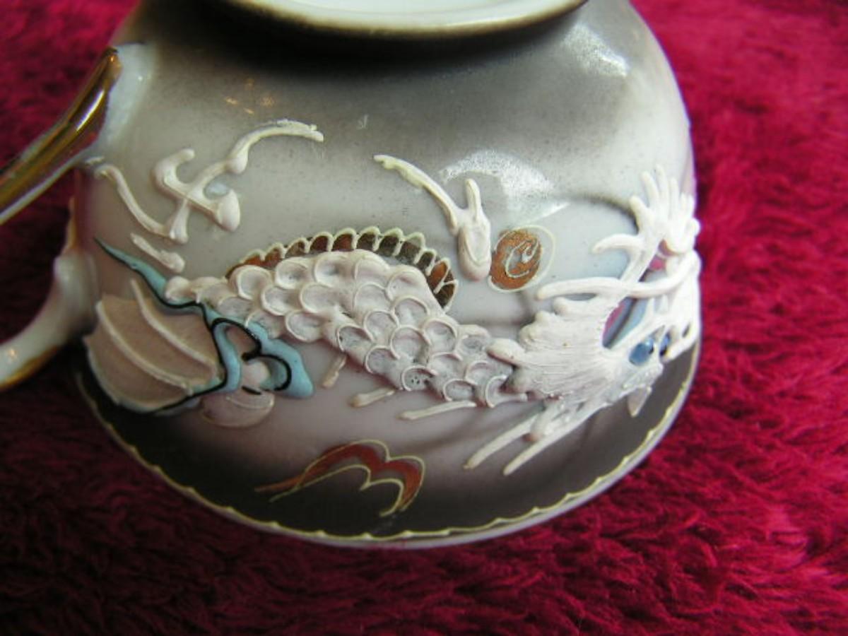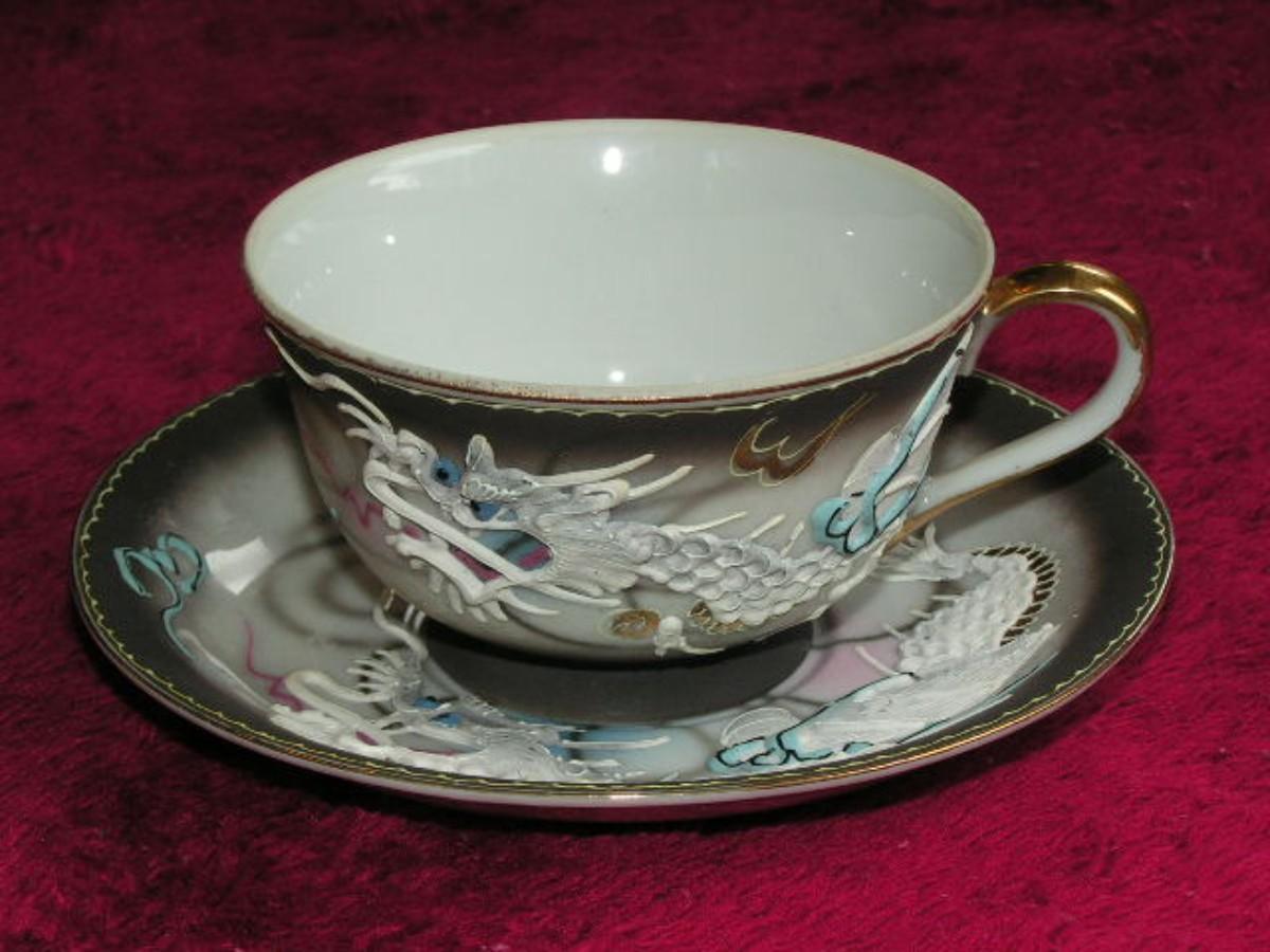 Vinage/antique Japanese Dragonware hand painted porcelain teacup & saucer set. Traditional Japanese motif. Moriage technique of raised enamel dots & lines. Intricately decorated and gold trimmed. Time period - late 1800s to mid 20th century.