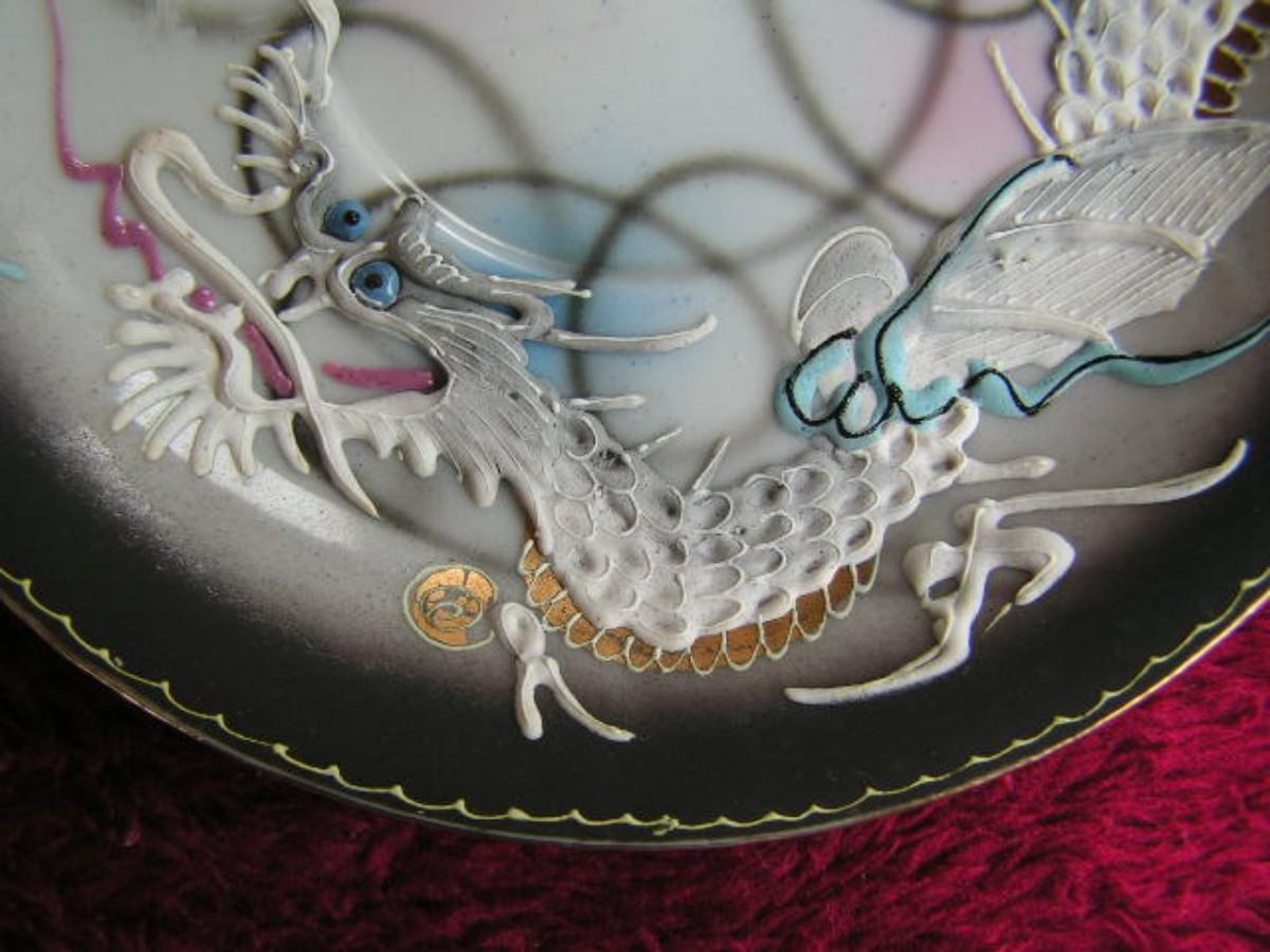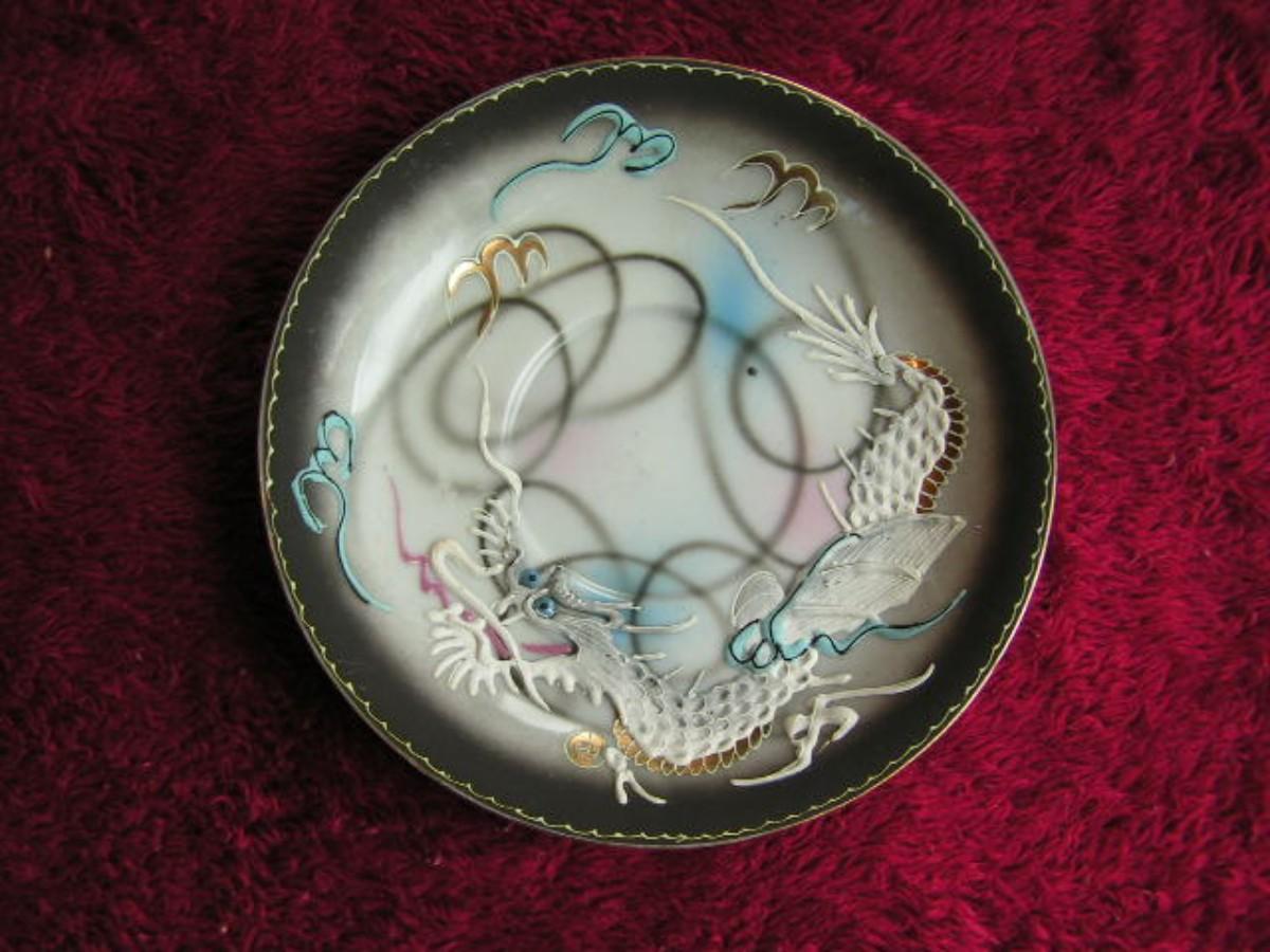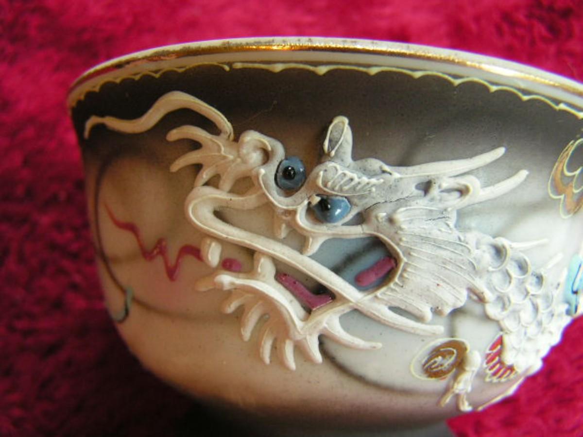 Vinage/antique Japanese Dragonware hand painted porcelain teacup & saucer set. Traditional Japanese motif. Moriage technique of raised enamel dots & lines. Intricately decorated and gold trimmed. Time period - late 1800s to mid 20th century.