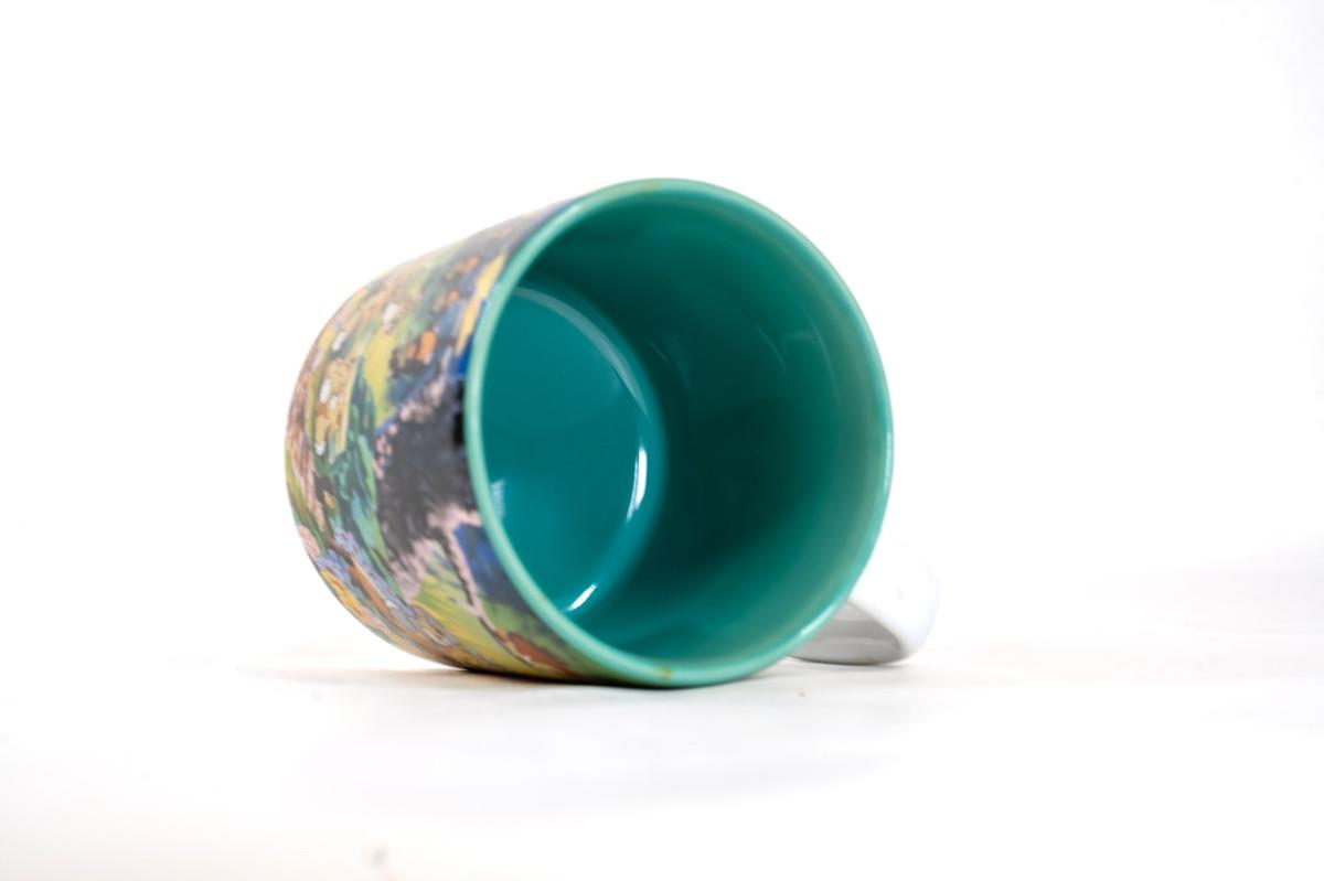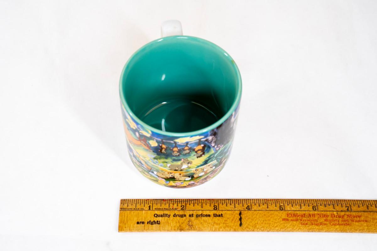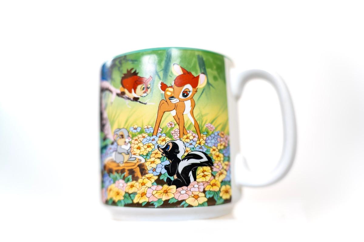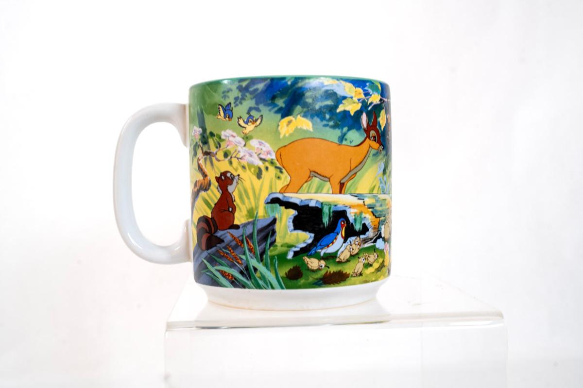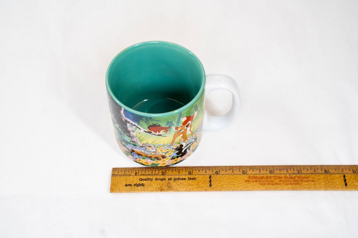 Disney store Bambi collectible mug. This mug features scenes from the movie Bambi with characters including Bambi, Thumper the rabbit, Flower the skunk , and the Friend Owl. Its a ceramic mug with a teal-colored interior.