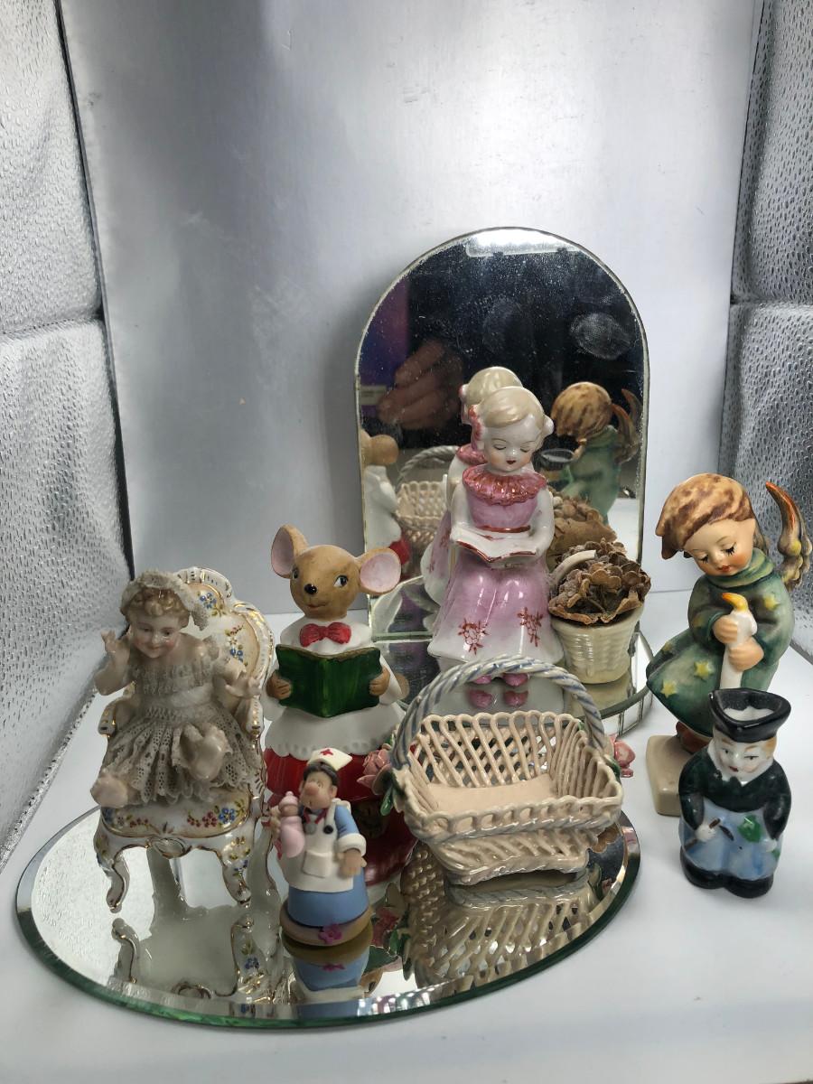 Mini Toby, Nurse with bottle, reading Mouse, mini ceramic basket . Gleeful child, Hummels,