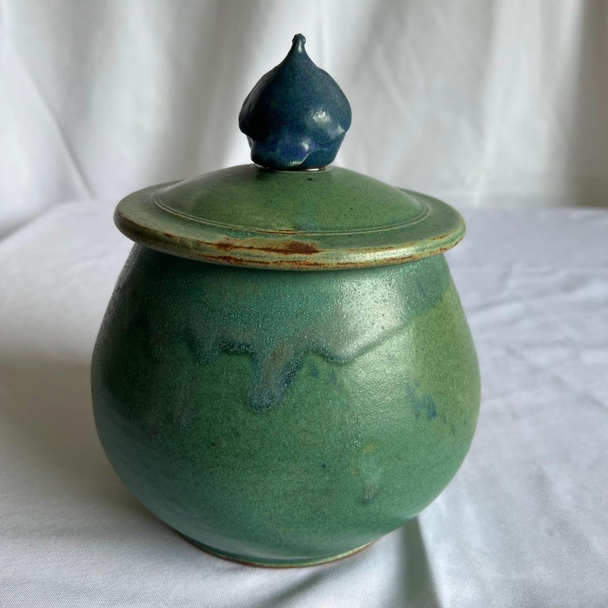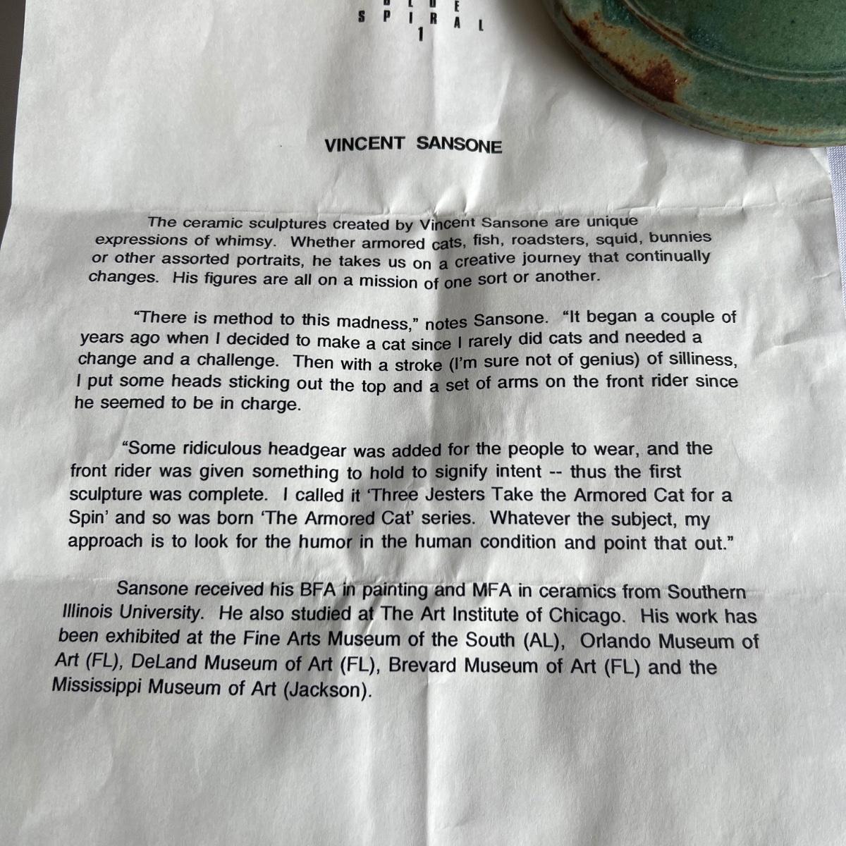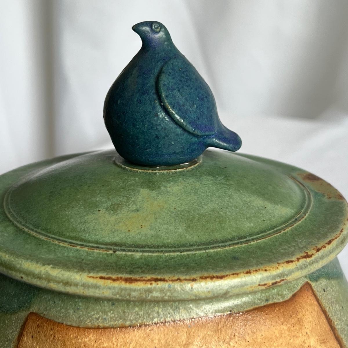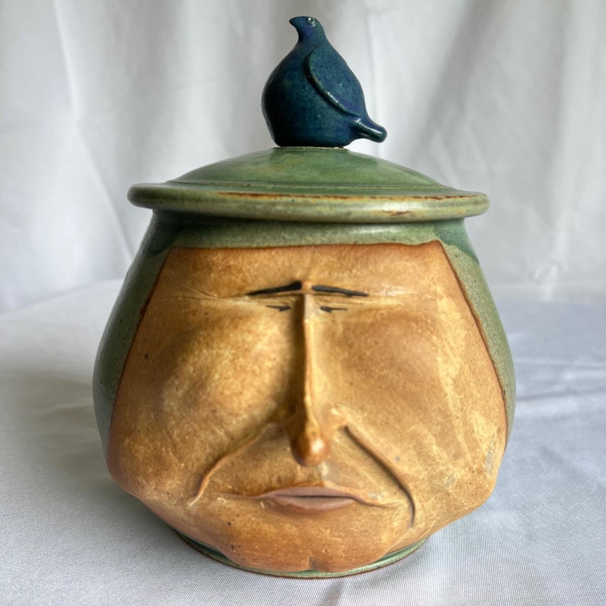 This ceramic sculpture created by Vincent Sansone comes with paperwork. A quaint blue bird adorns the lid.