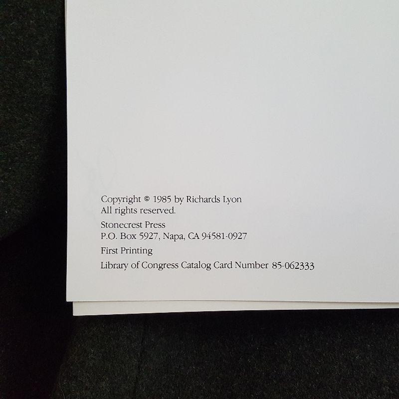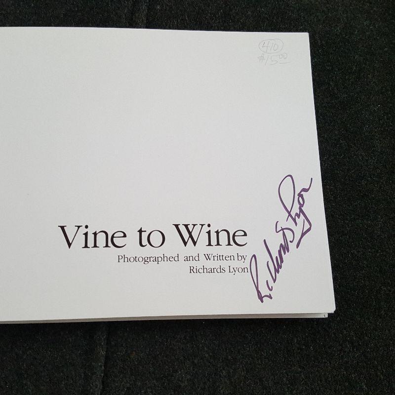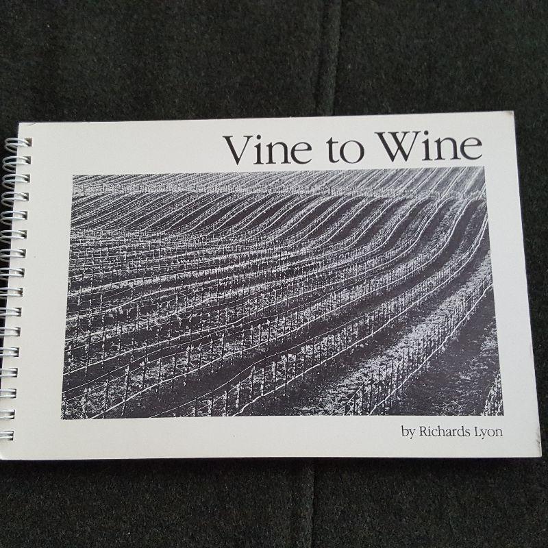 This auction lot is for a nice, clean copy of the out-of-print book entitled Vine To Wine. This 120 page spiral-bound book is a wonderful look at the work and world of the vintner. Photographed and written by Richard Lyons - and autographed. A nice clean and enjoyable copy - there is a gifting inscription on the inside of the front cover: To Lila - with love - Xmas 1985.