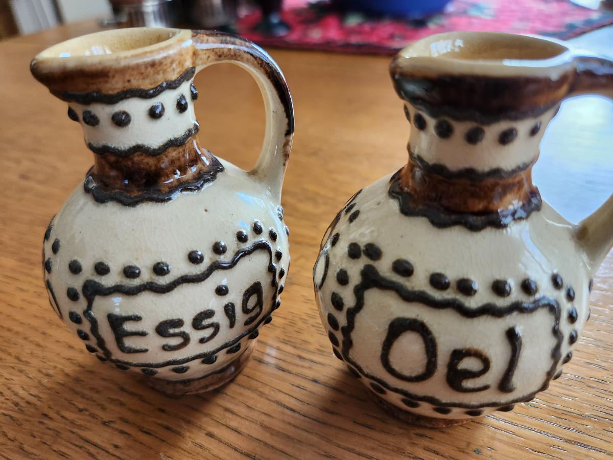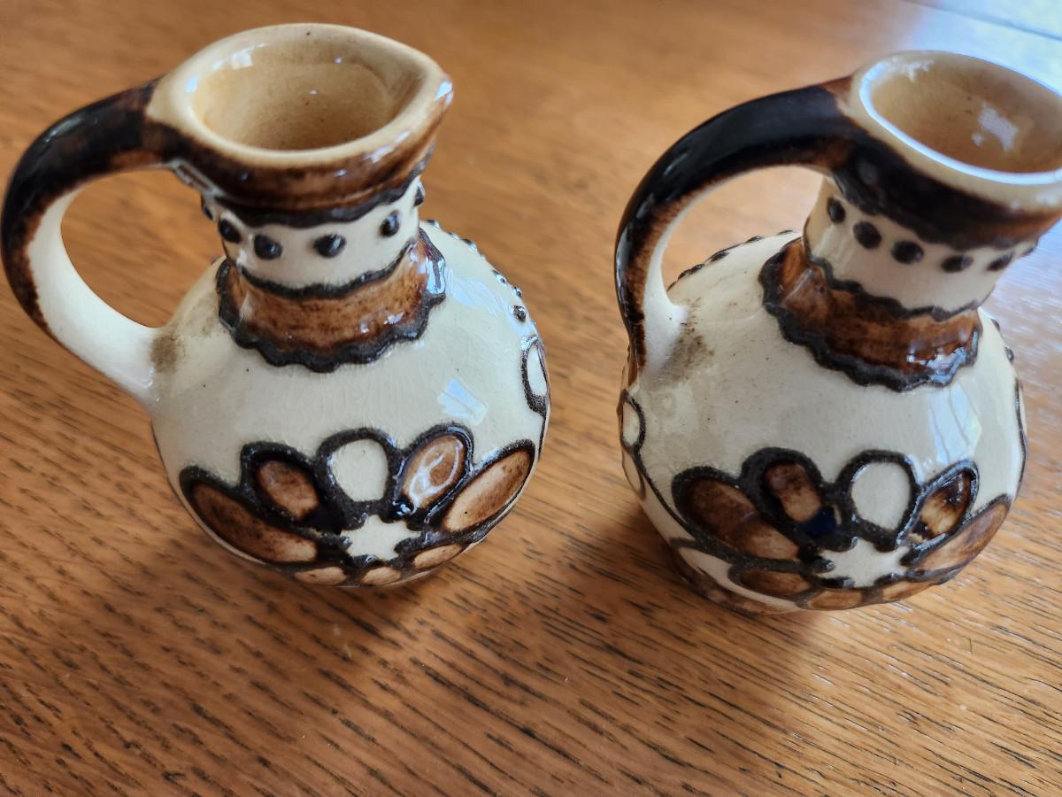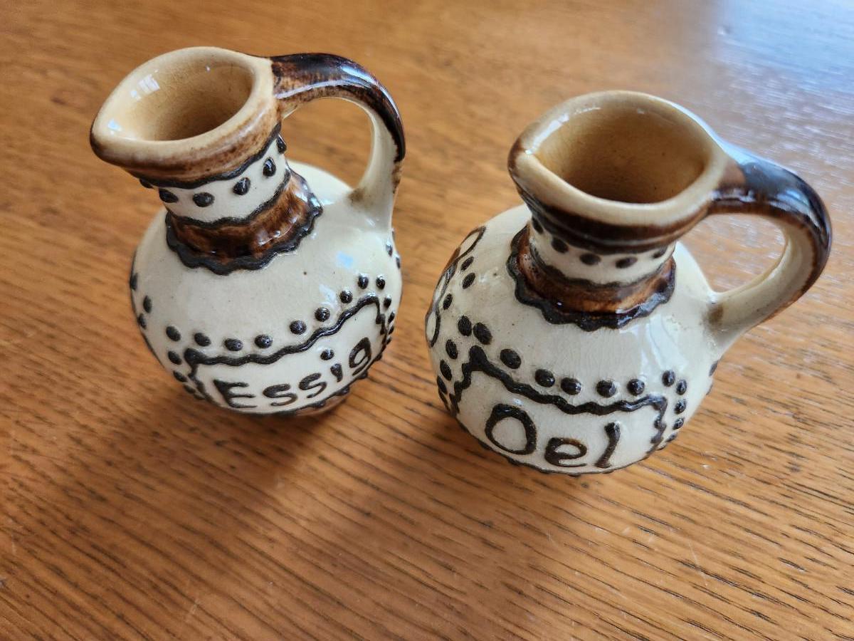 This auction lot is for a set of Vintage Vinegar & Oil Cruets. These cruets are constructed of a nice pottery with a unique glaze and applied decoration. The original cork stoppers are missing but the cruets are ready for action or display on a kitchen shelf.