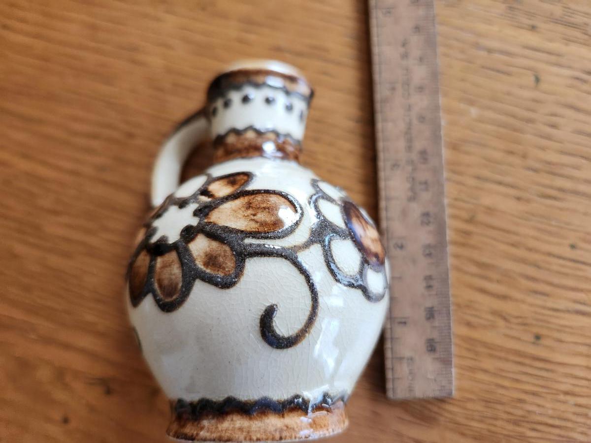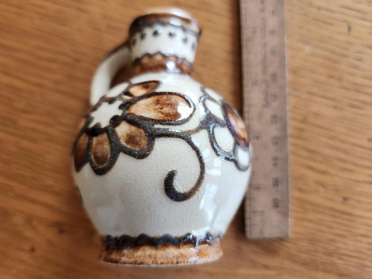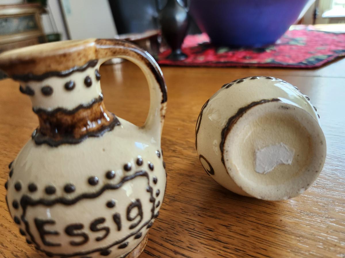This auction lot is for a set of Vintage Vinegar & Oil Cruets. These cruets are constructed of a nice pottery with a unique glaze and applied decoration. The original cork stoppers are missing but the cruets are ready for action or display on a kitchen shelf.