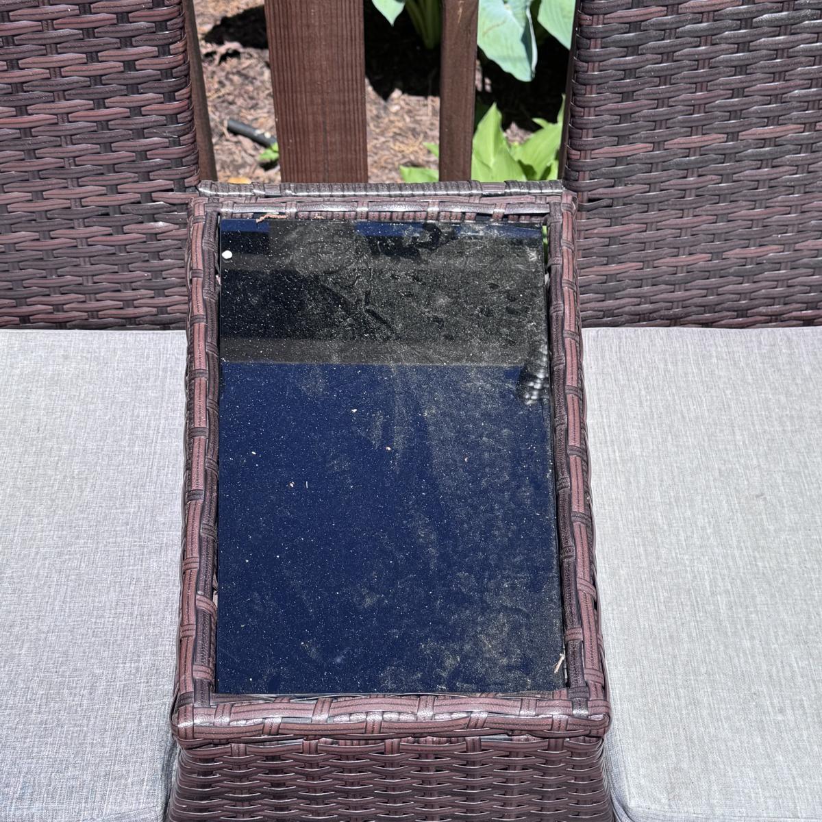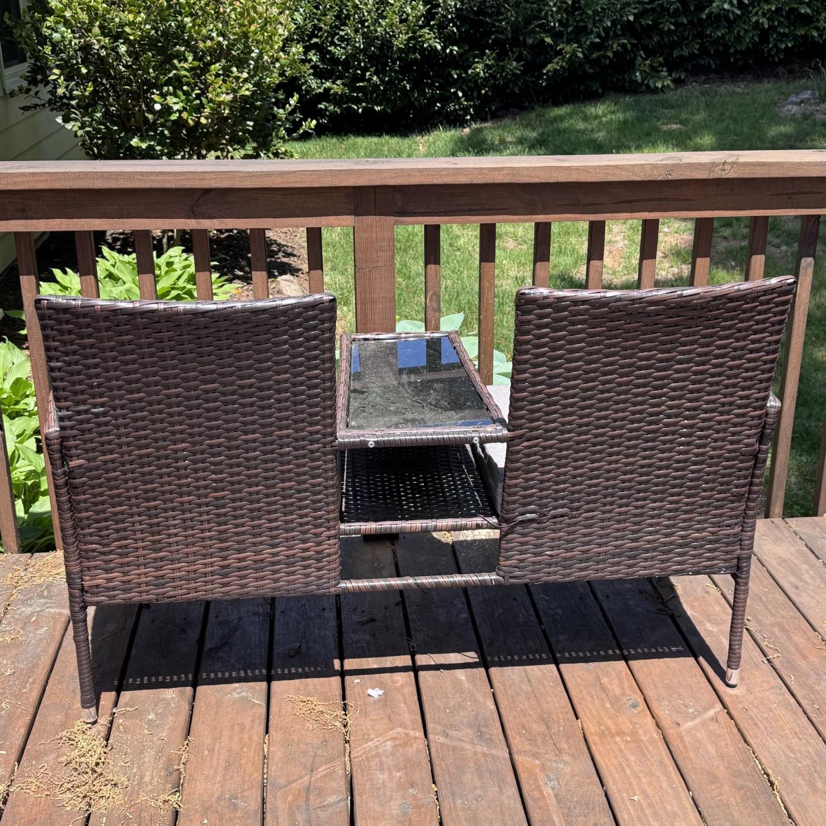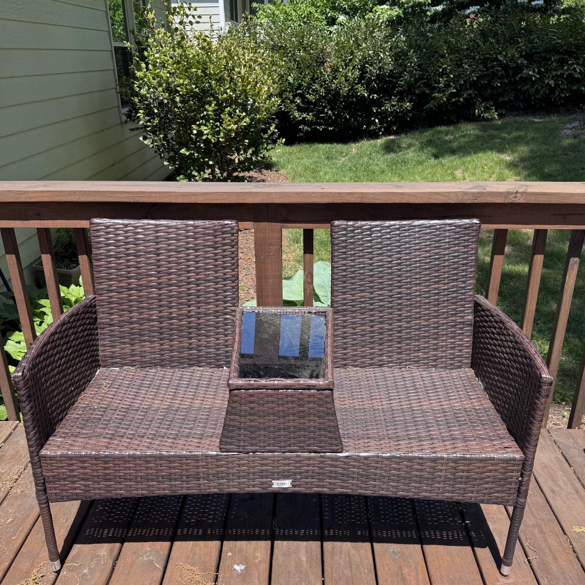 This lot includes a VINGLI wicker outdoor loveseat with two removable cushions. The loveseat appears to be wicker in a synthetic material. The middle console has a removable glass sheet. The cushions appear to have removable, outdoor style, washable covers. The loveseat measures 51” x 20” x 33”H with a seat height of 18”H. Local pickup only.