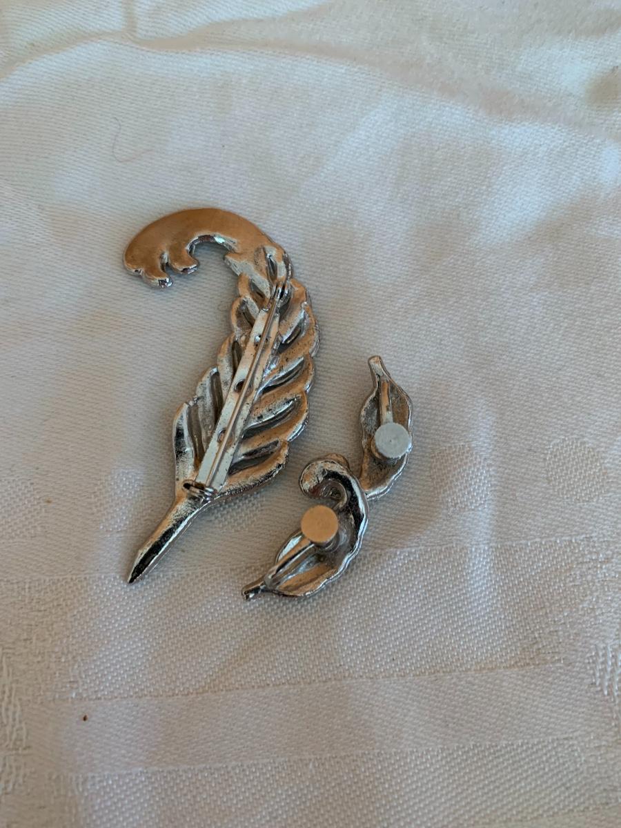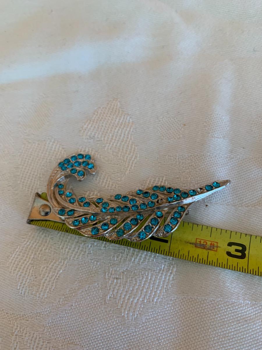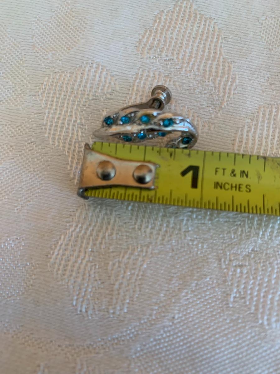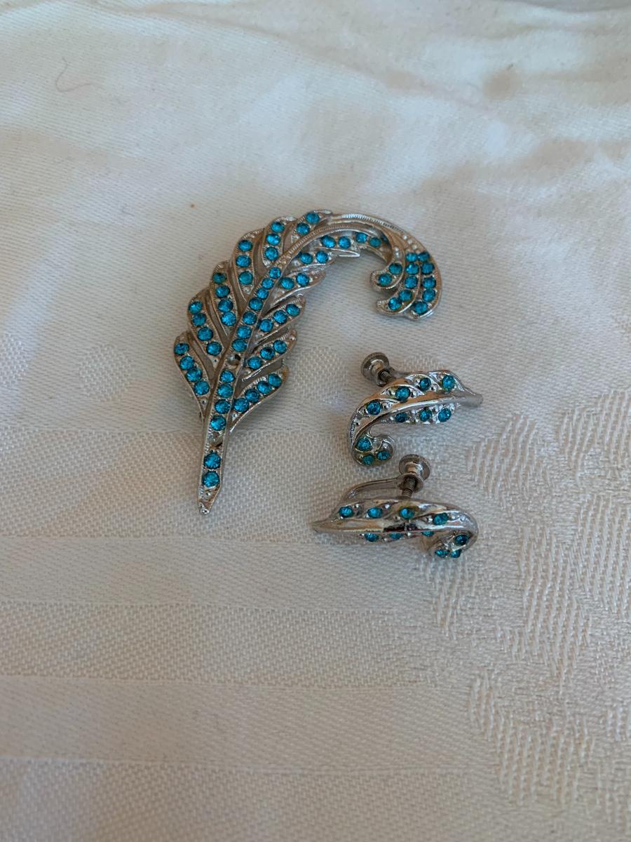 Lovely silver colored metal with light blue stone, comes with matching screw on earrings