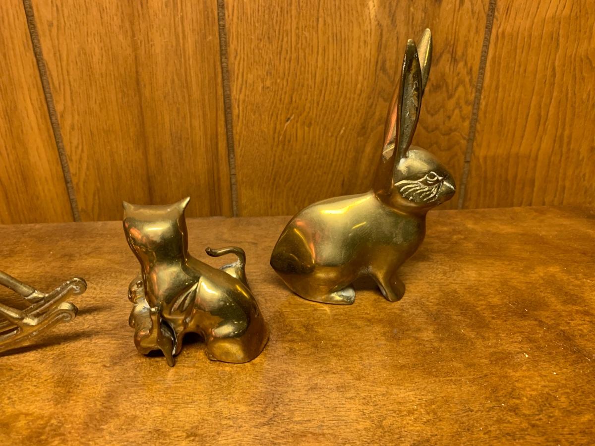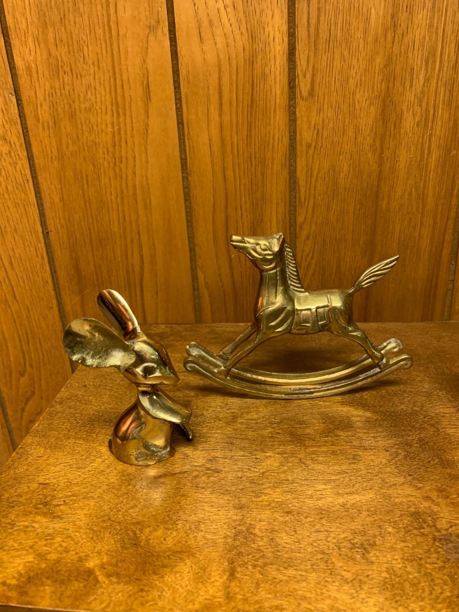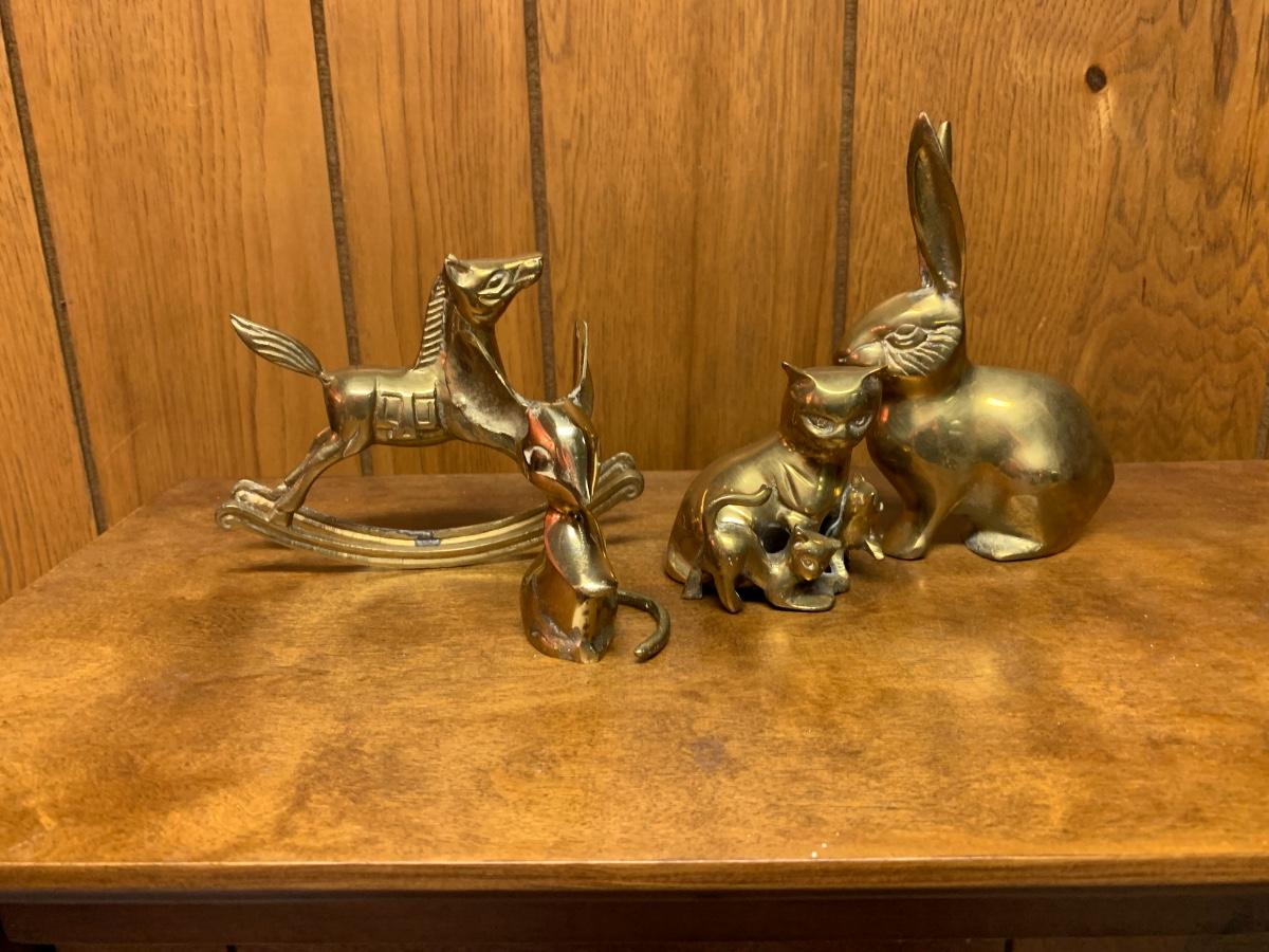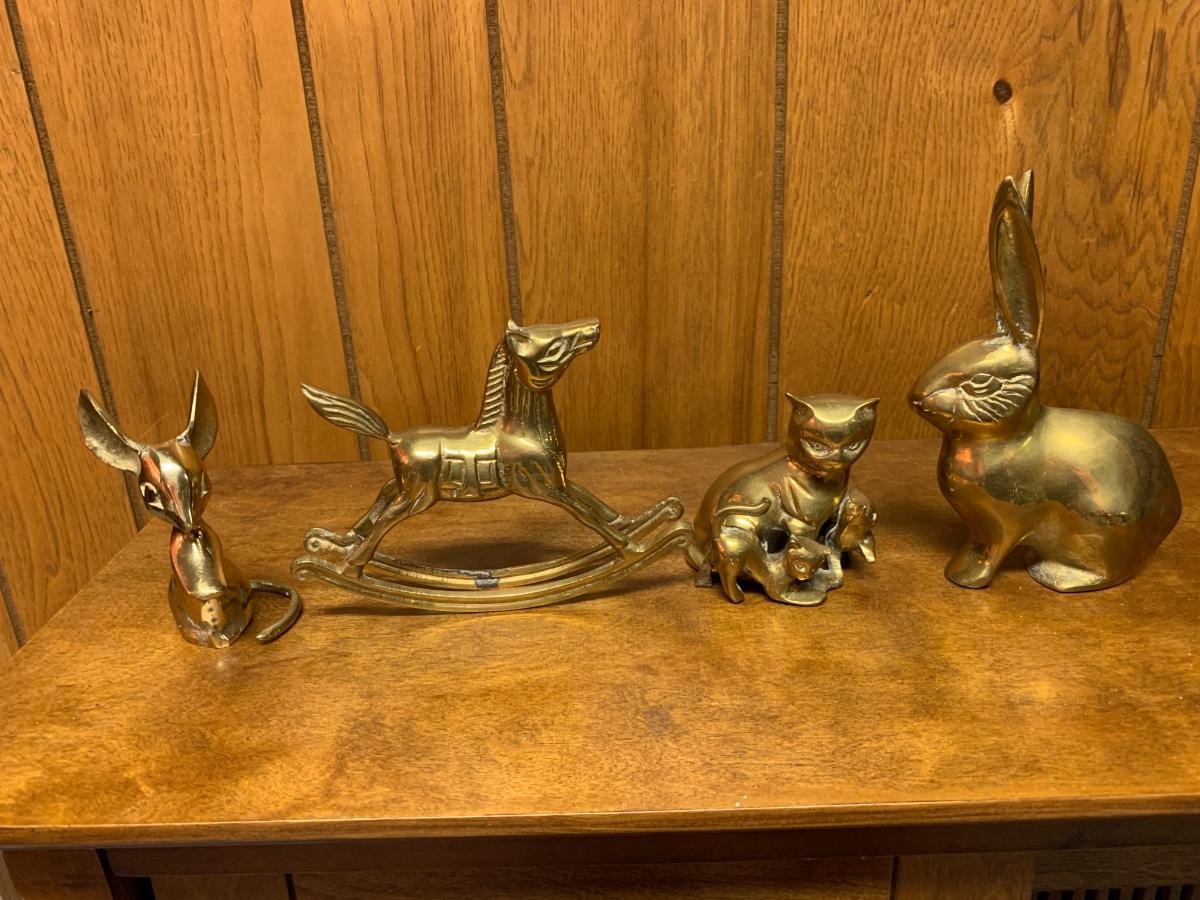 Rocking horse, bunny, mouse and momma cat with kittens. Perfect group for any animal lover. Solid brass.