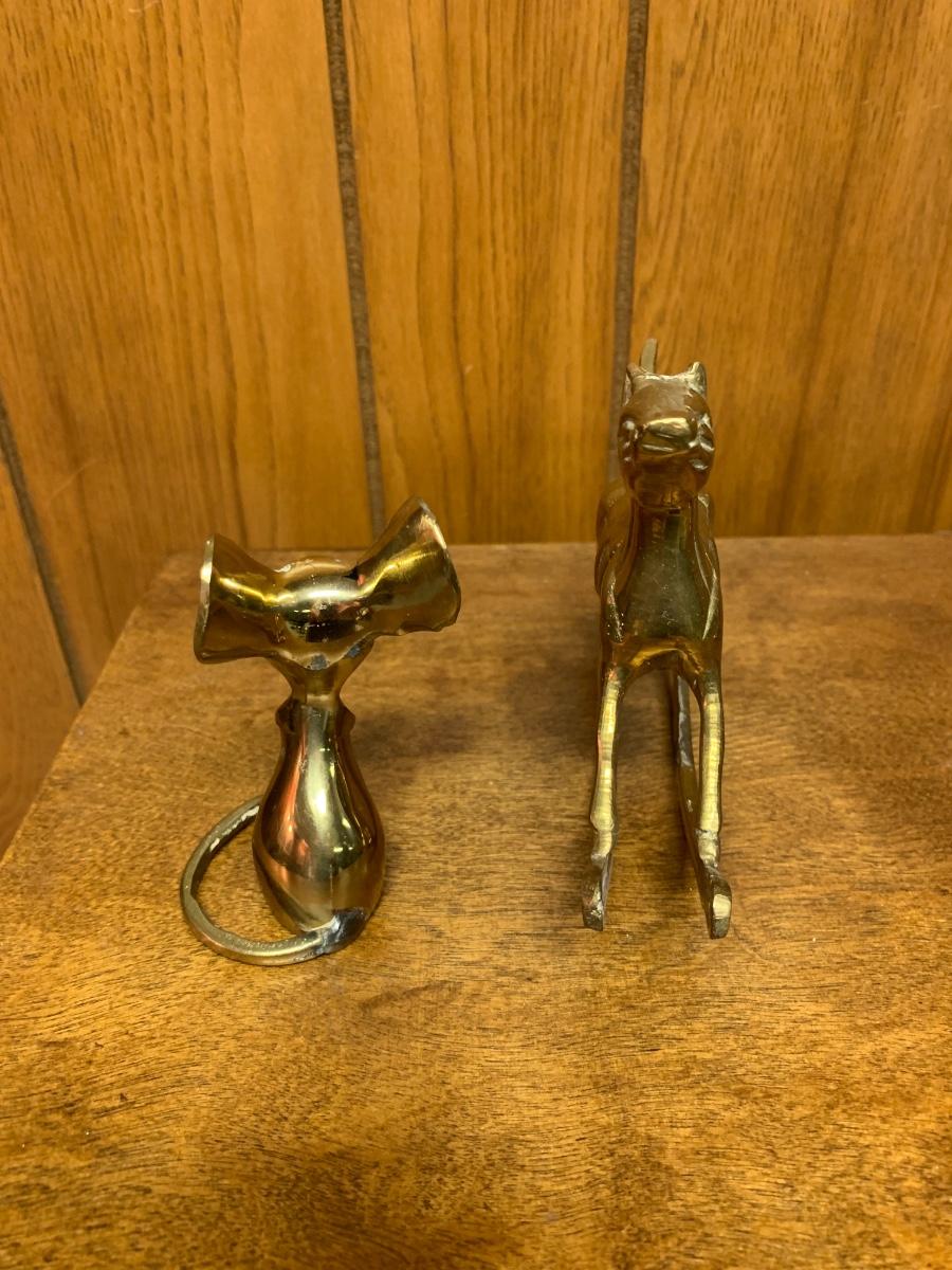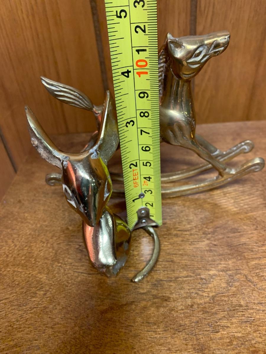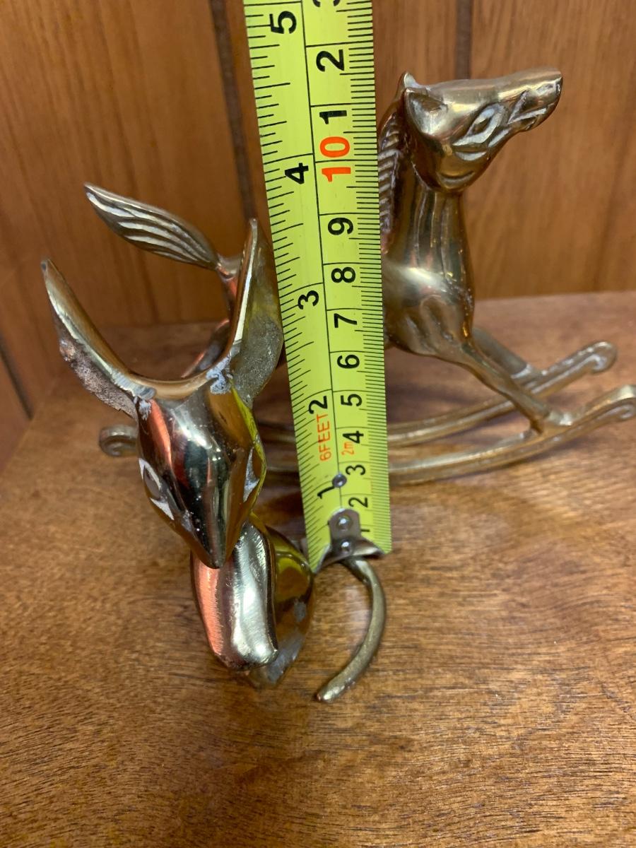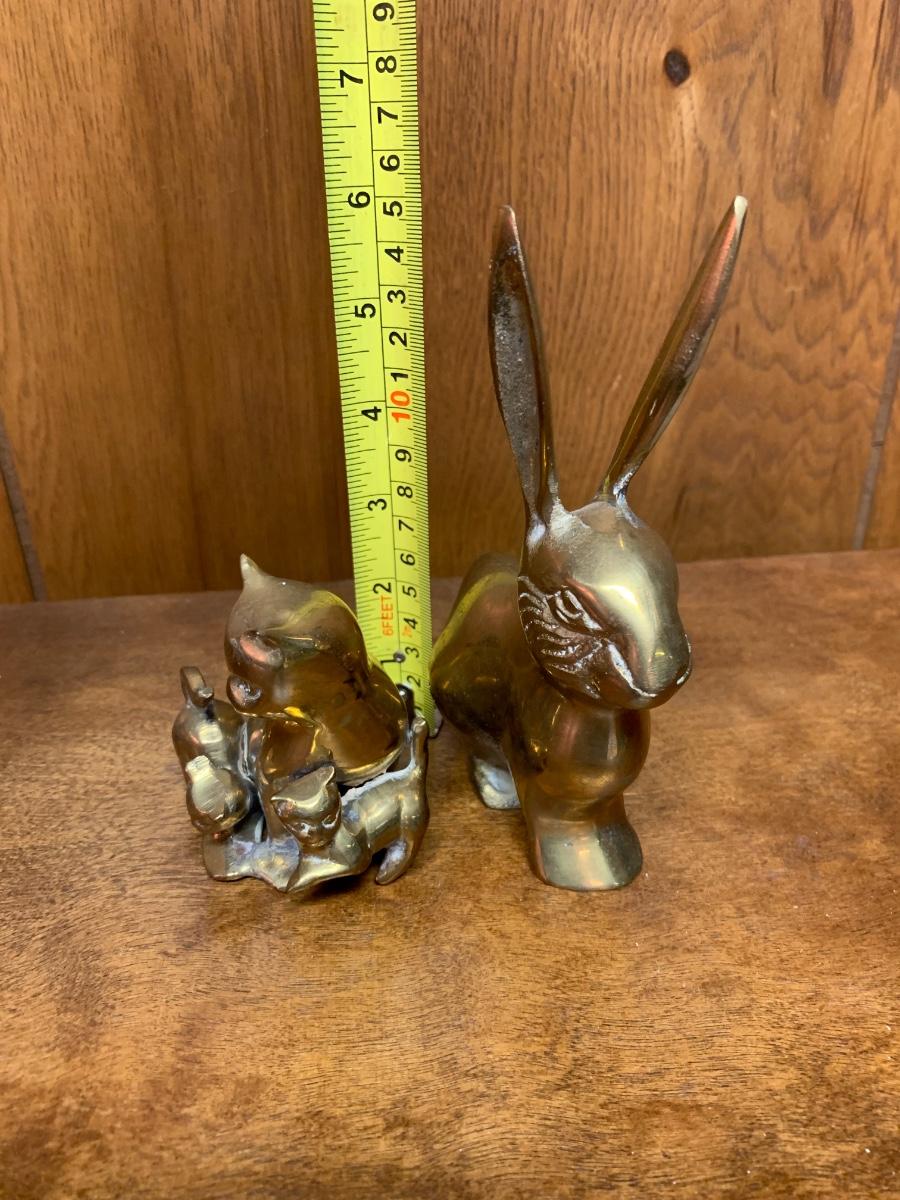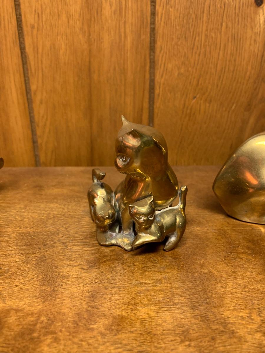 Rocking horse, bunny, mouse and momma cat with kittens. Perfect group for any animal lover. Solid brass.