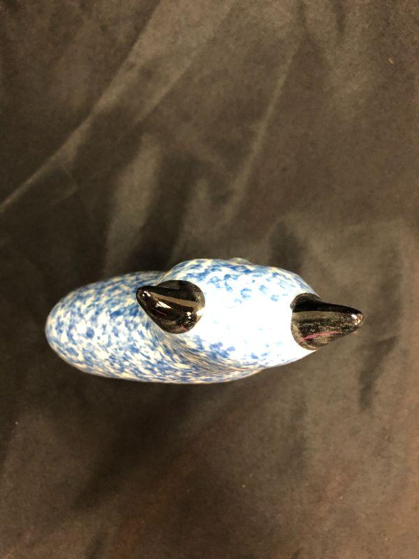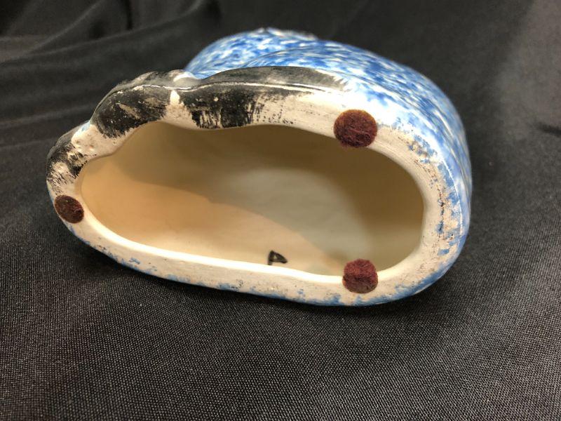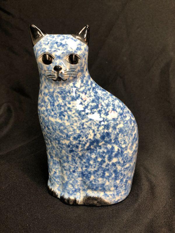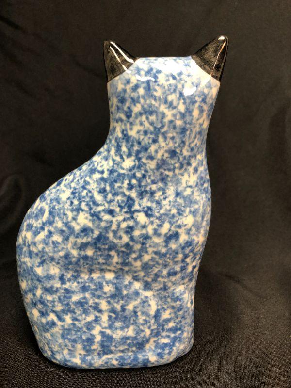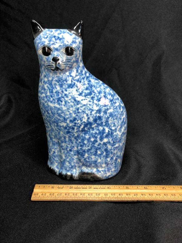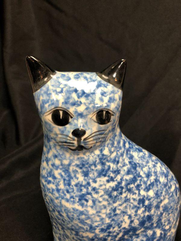 Vintage 10" Tall Ceramic Cat Figurine Blue/White Spongeware Black Ears