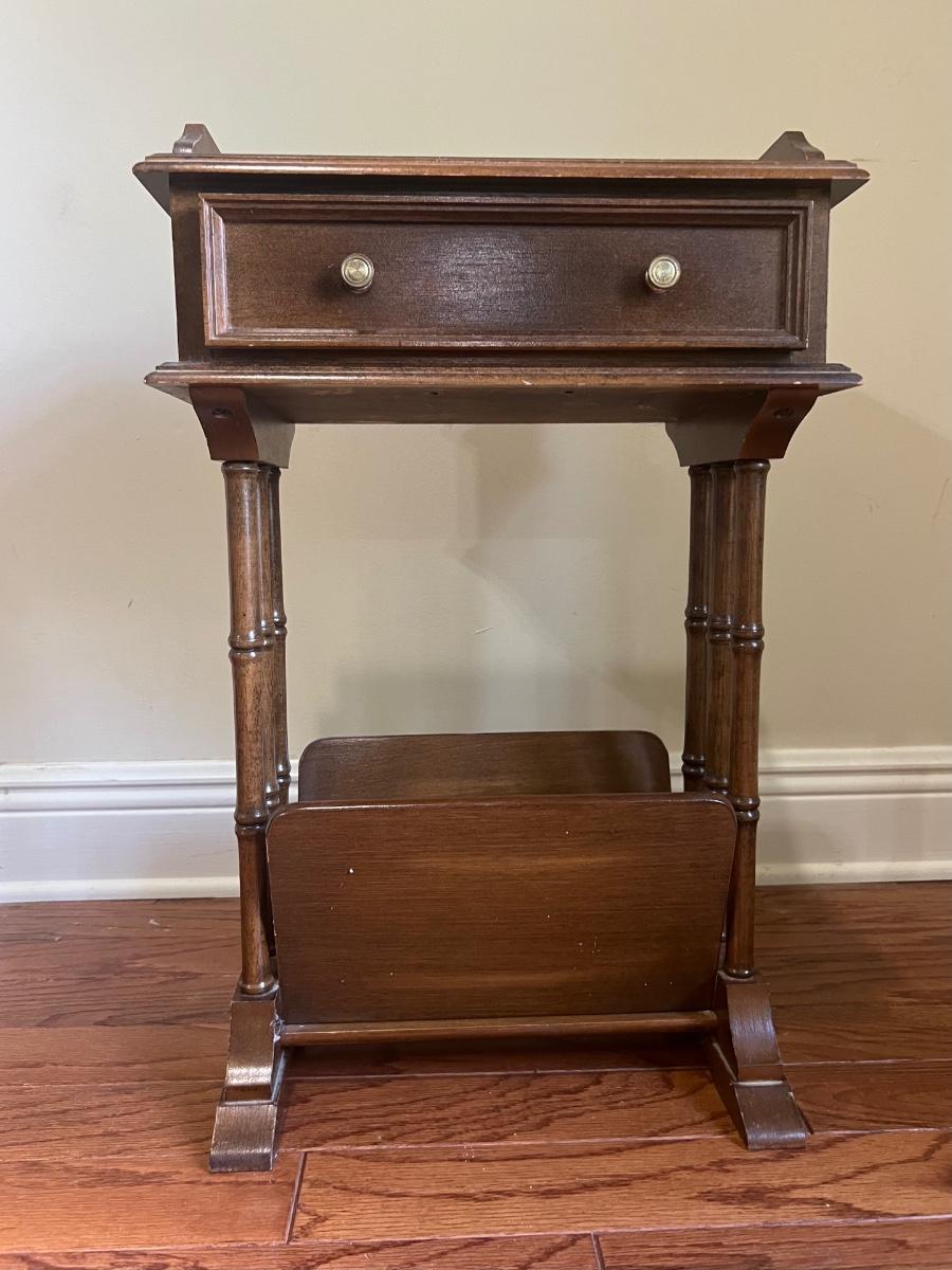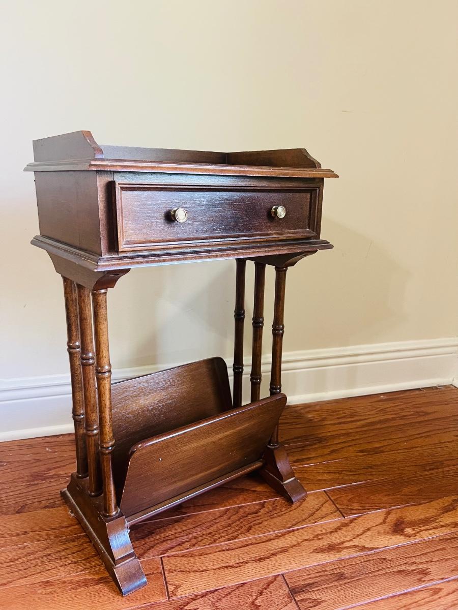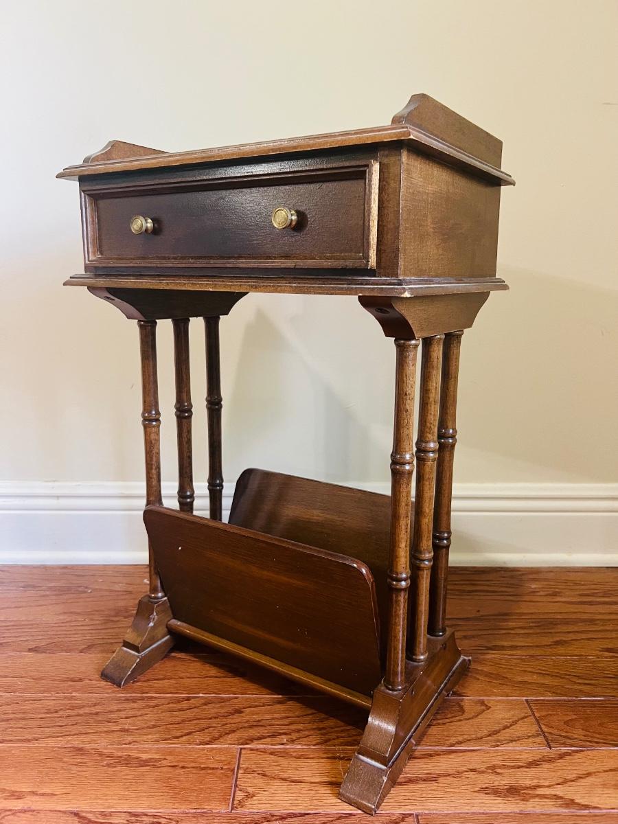 Vintage side table/magazine rack with drawer. Measures 23 1/2 tall, 16 inches wide and 10 inches deep.