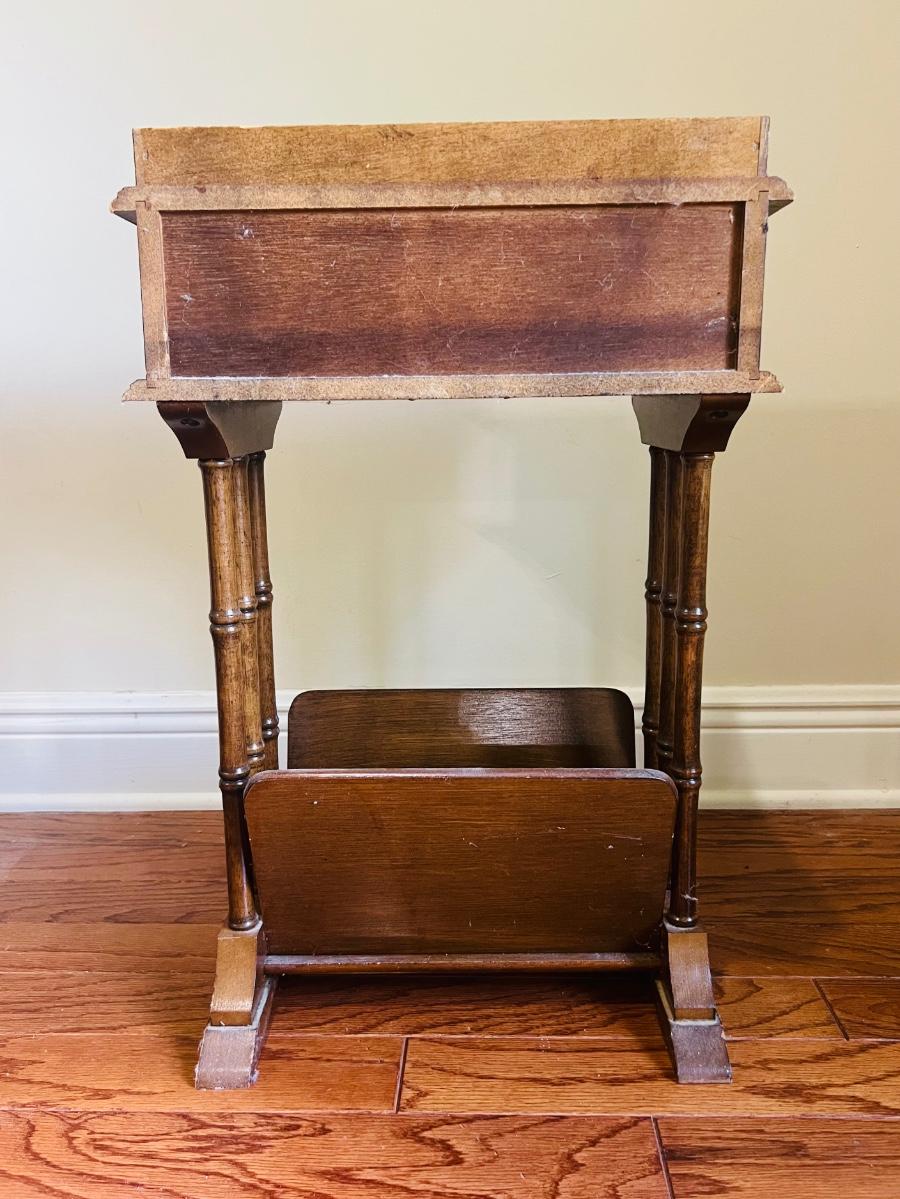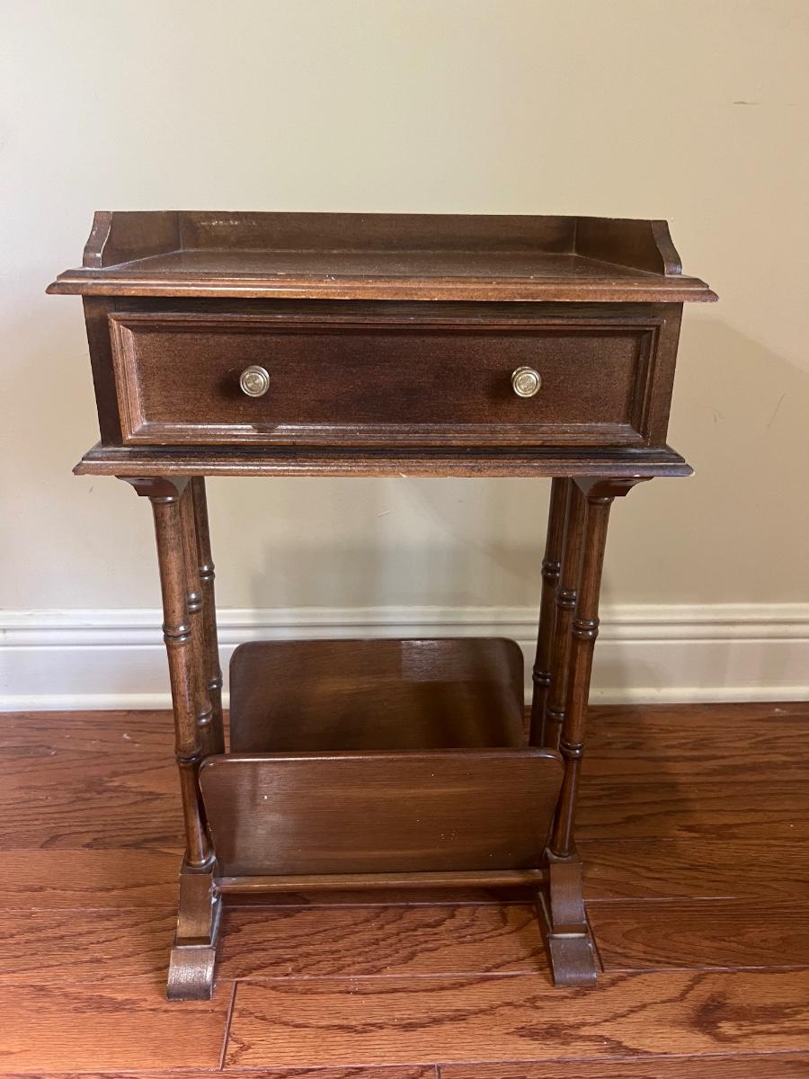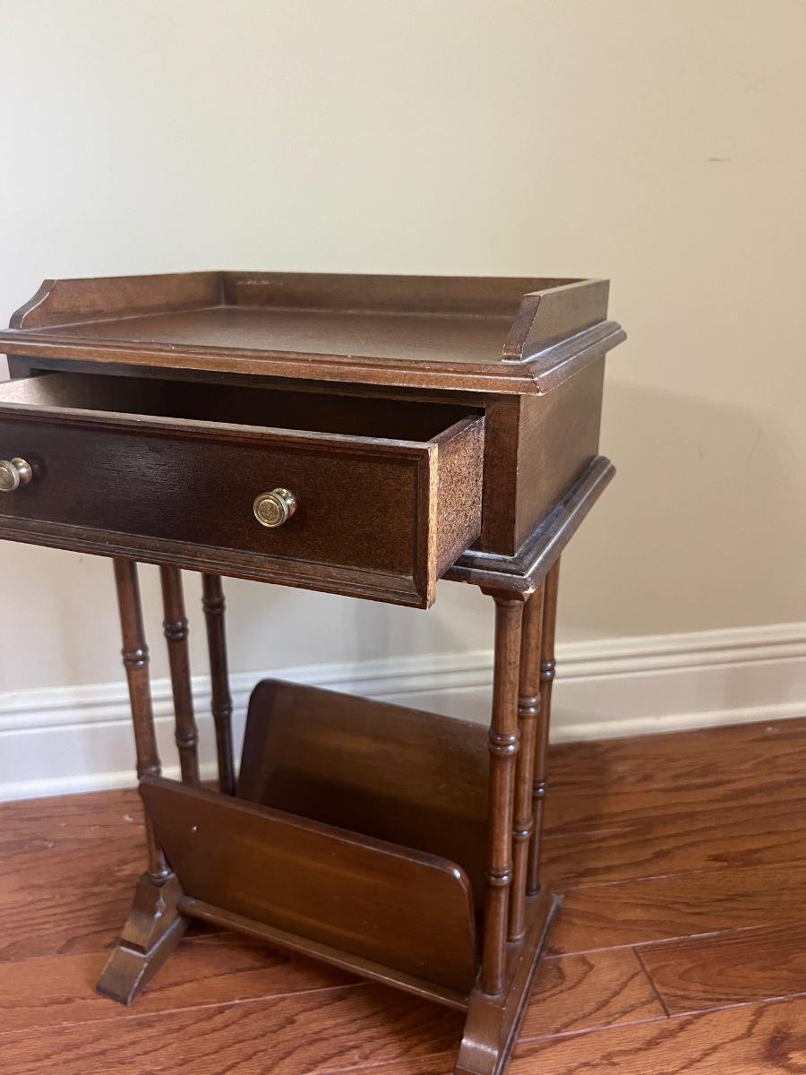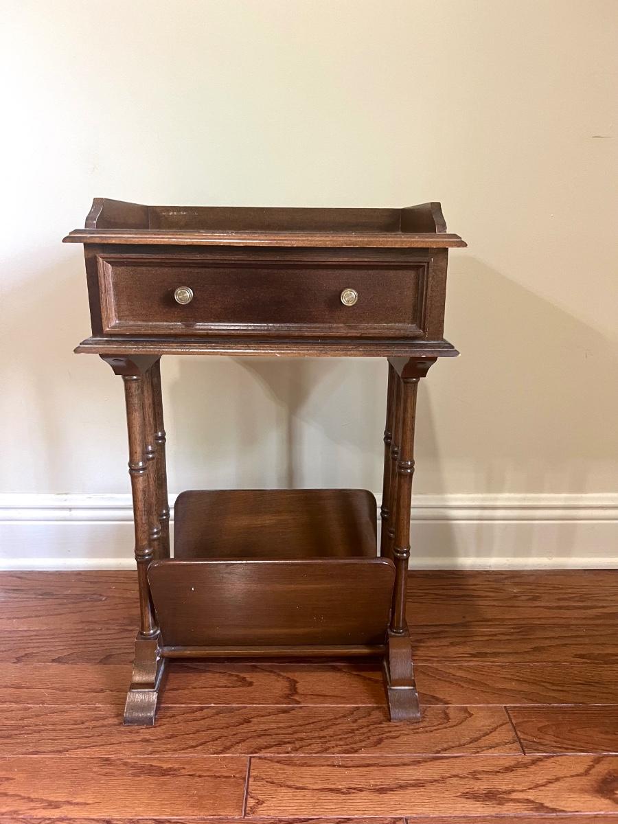 Vintage side table/magazine rack with drawer. Measures 23 1/2 tall, 16 inches wide and 10 inches deep.