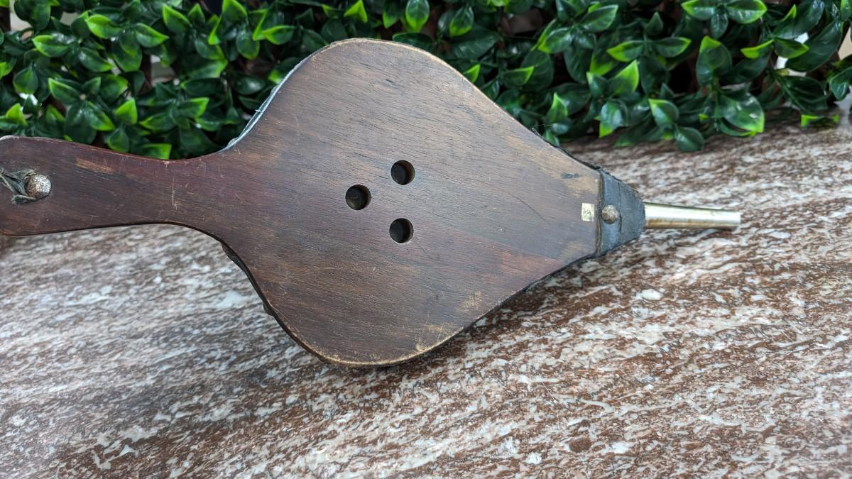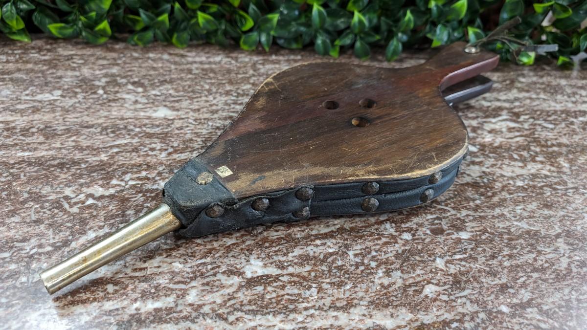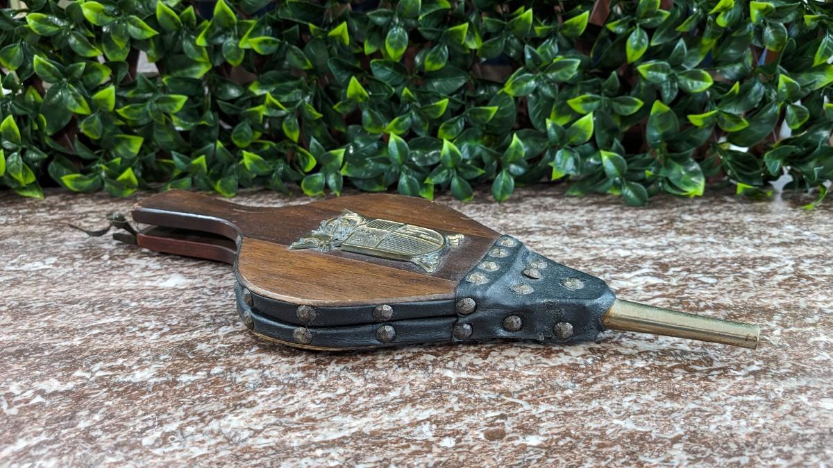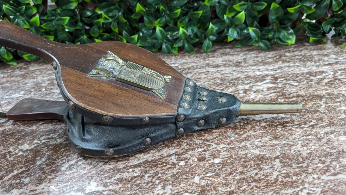 Vintage Fireplace Bellows Works Wood Leather Metal Coat of Arms