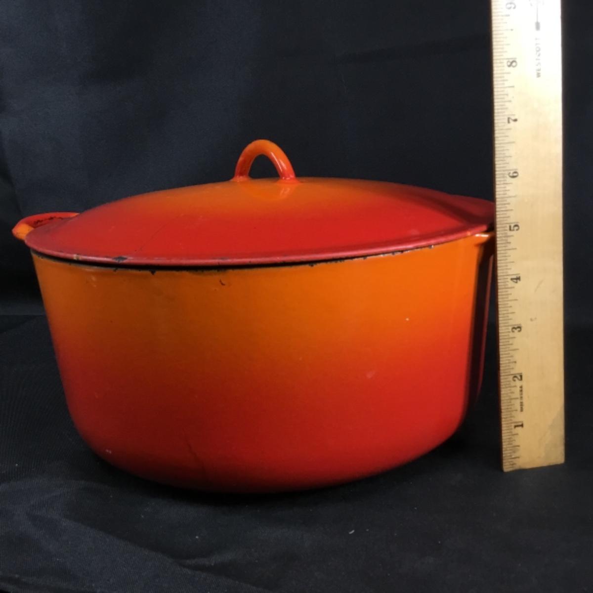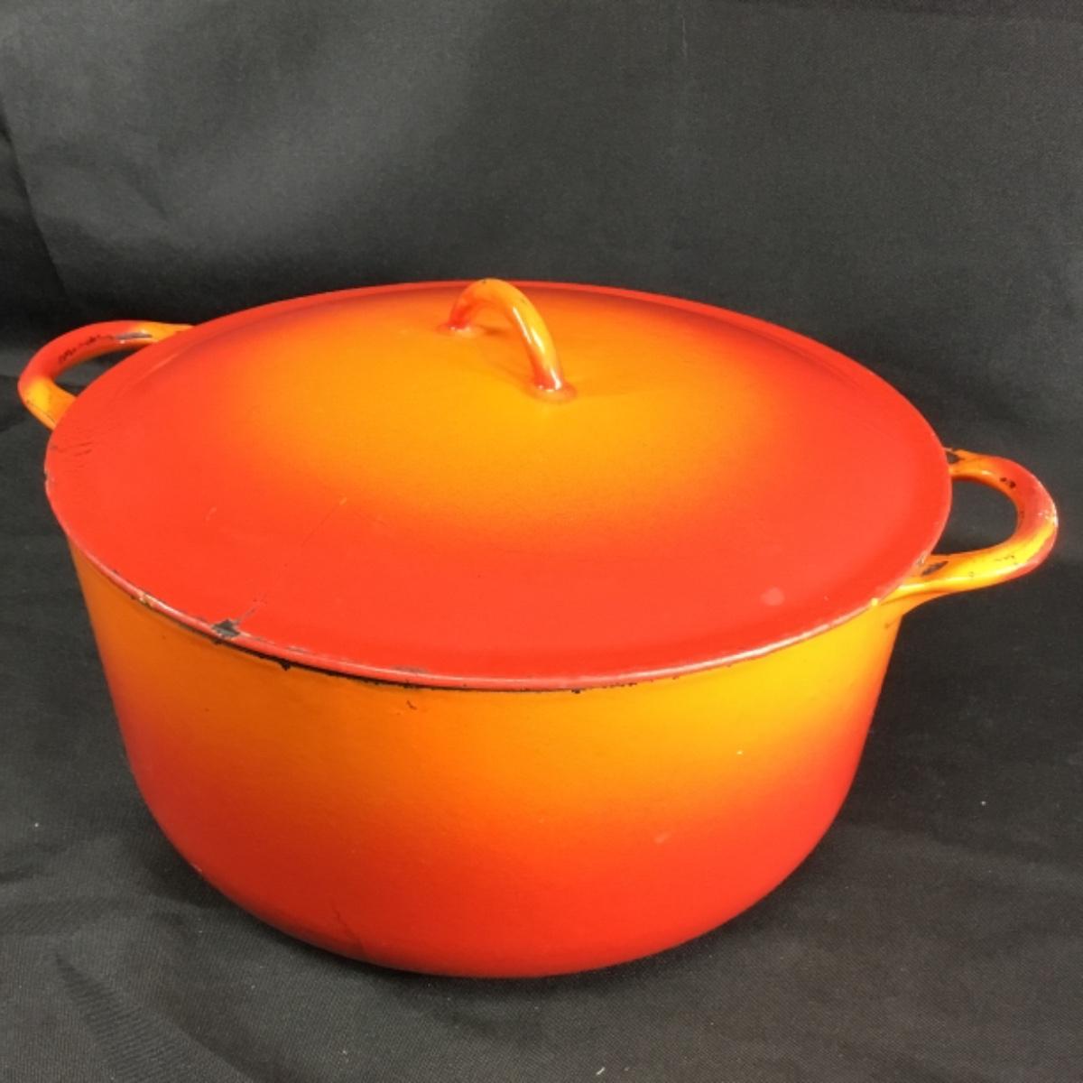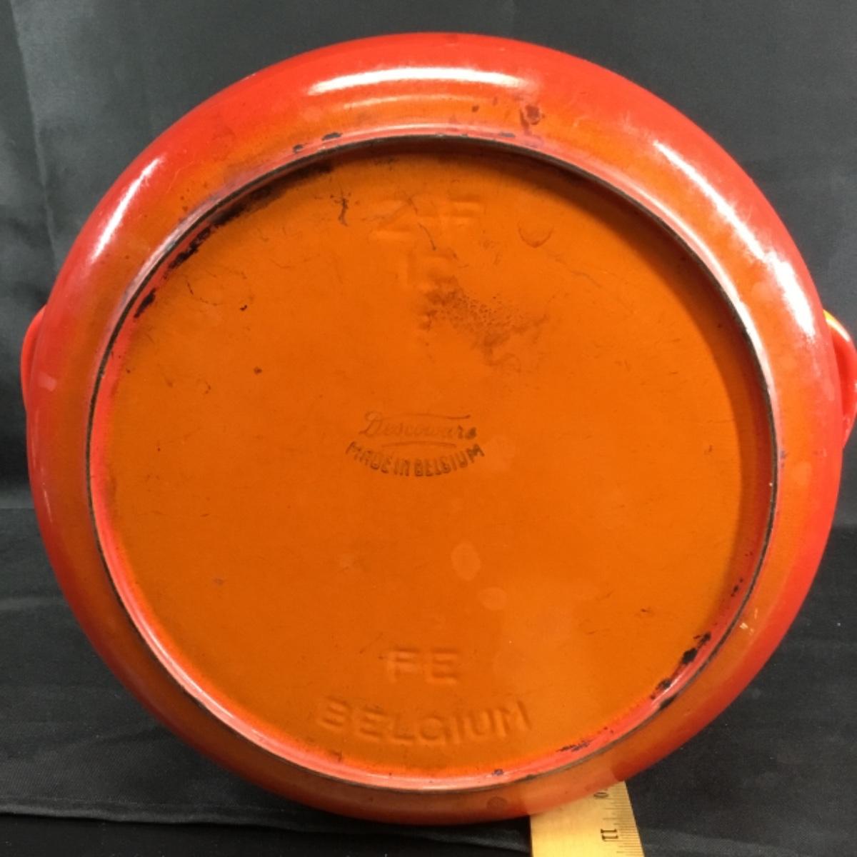 One vintage blaze orange Dutch oven made by Descoware Of Belgium. Chips, and next to the finish can be seen in the photos. Pot is very heavy.