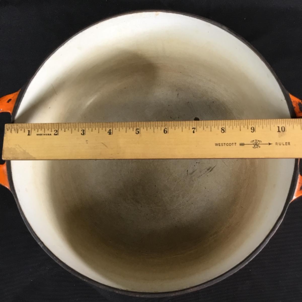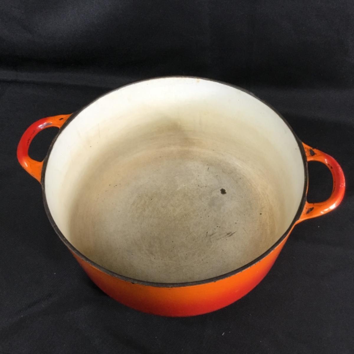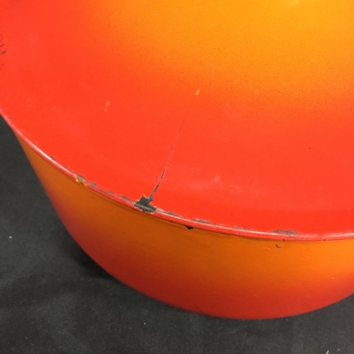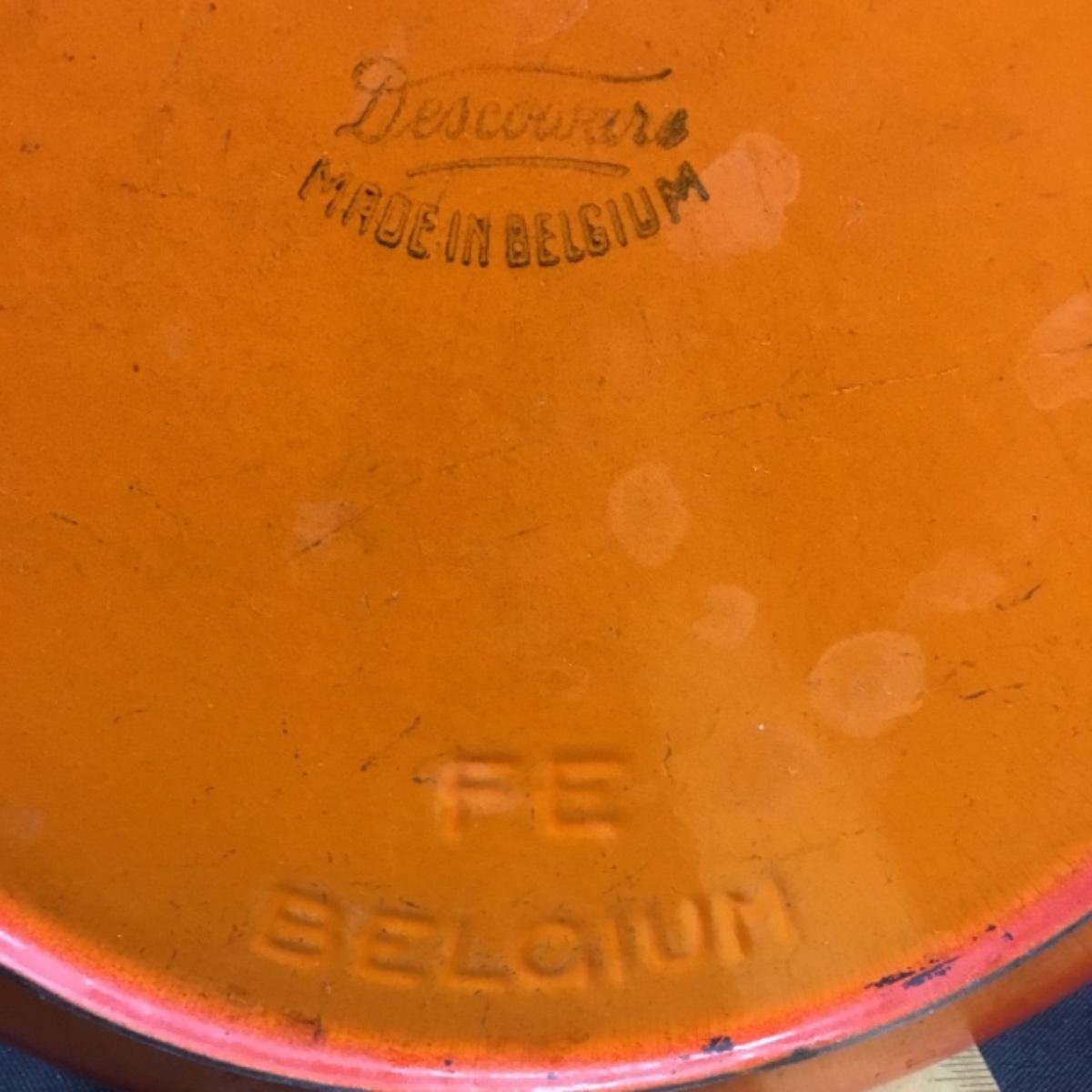 One vintage blaze orange Dutch oven made by Descoware Of Belgium. Chips, and next to the finish can be seen in the photos. Pot is very heavy.