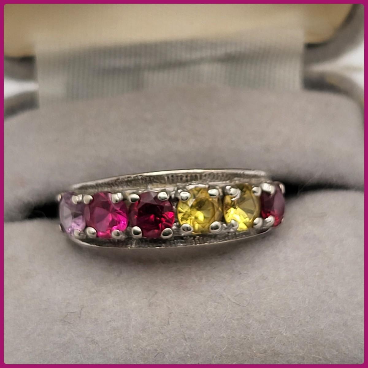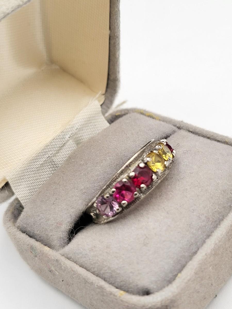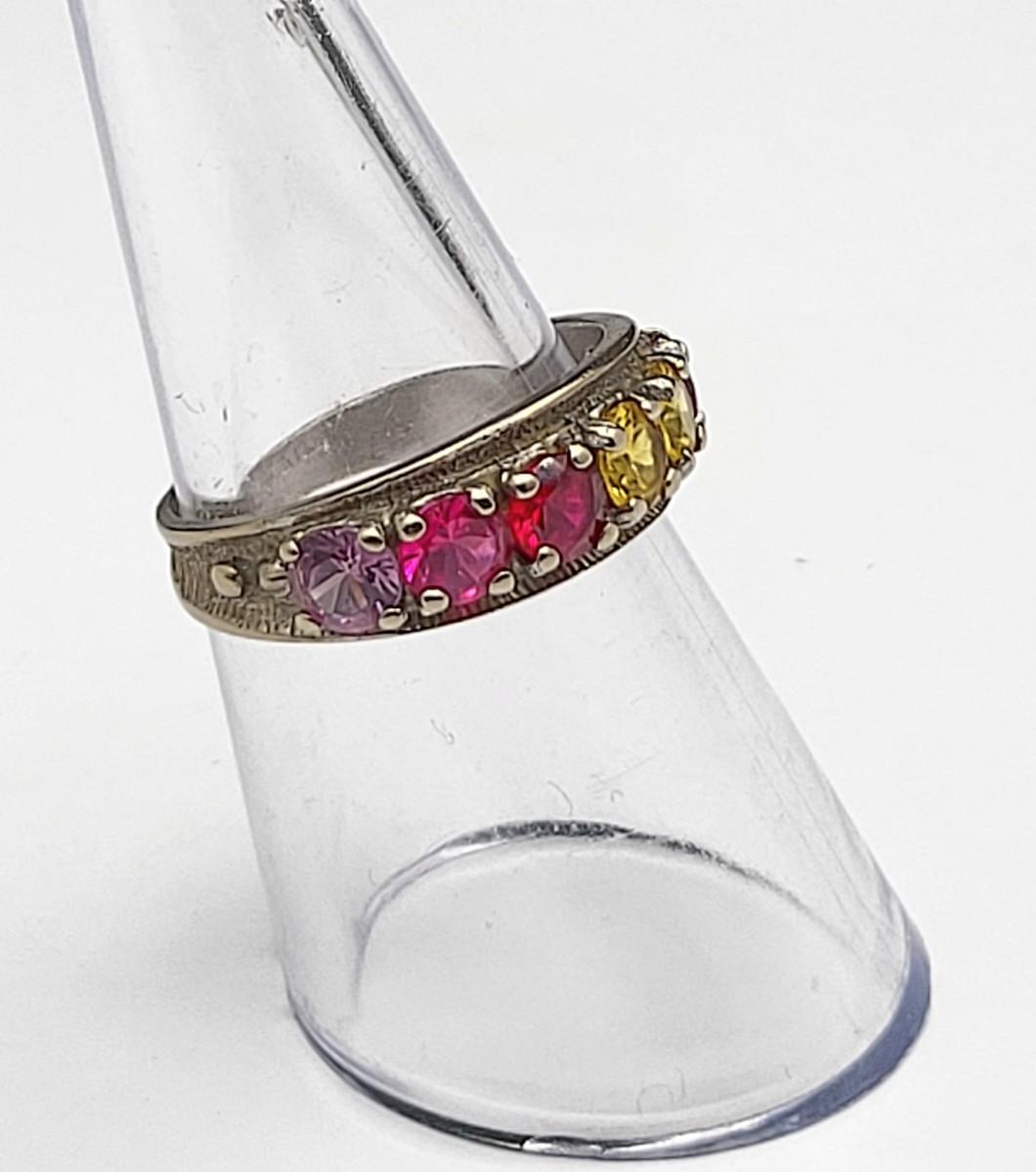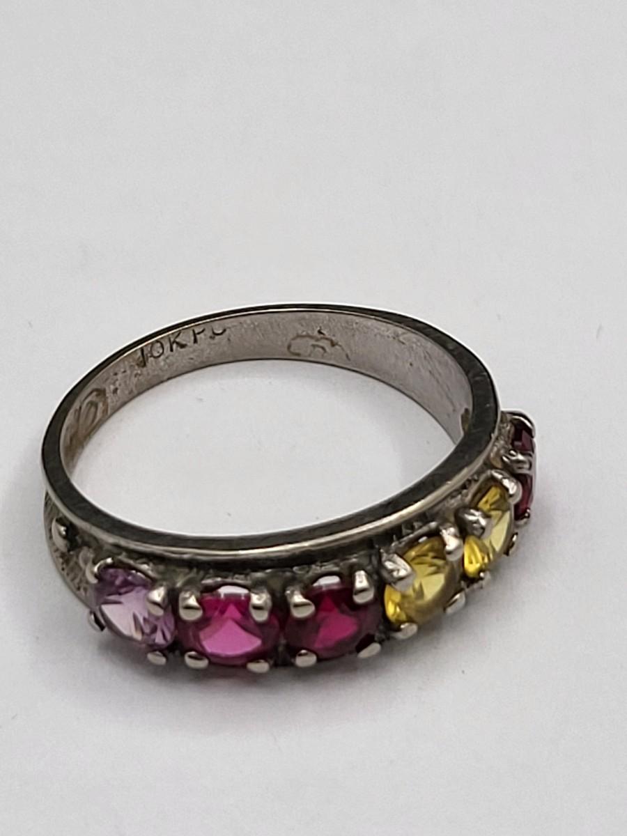 Six, colored sapphire stones (purple, pink, red, and yellow). Stamped 10k white gold ring. Size 5.5.