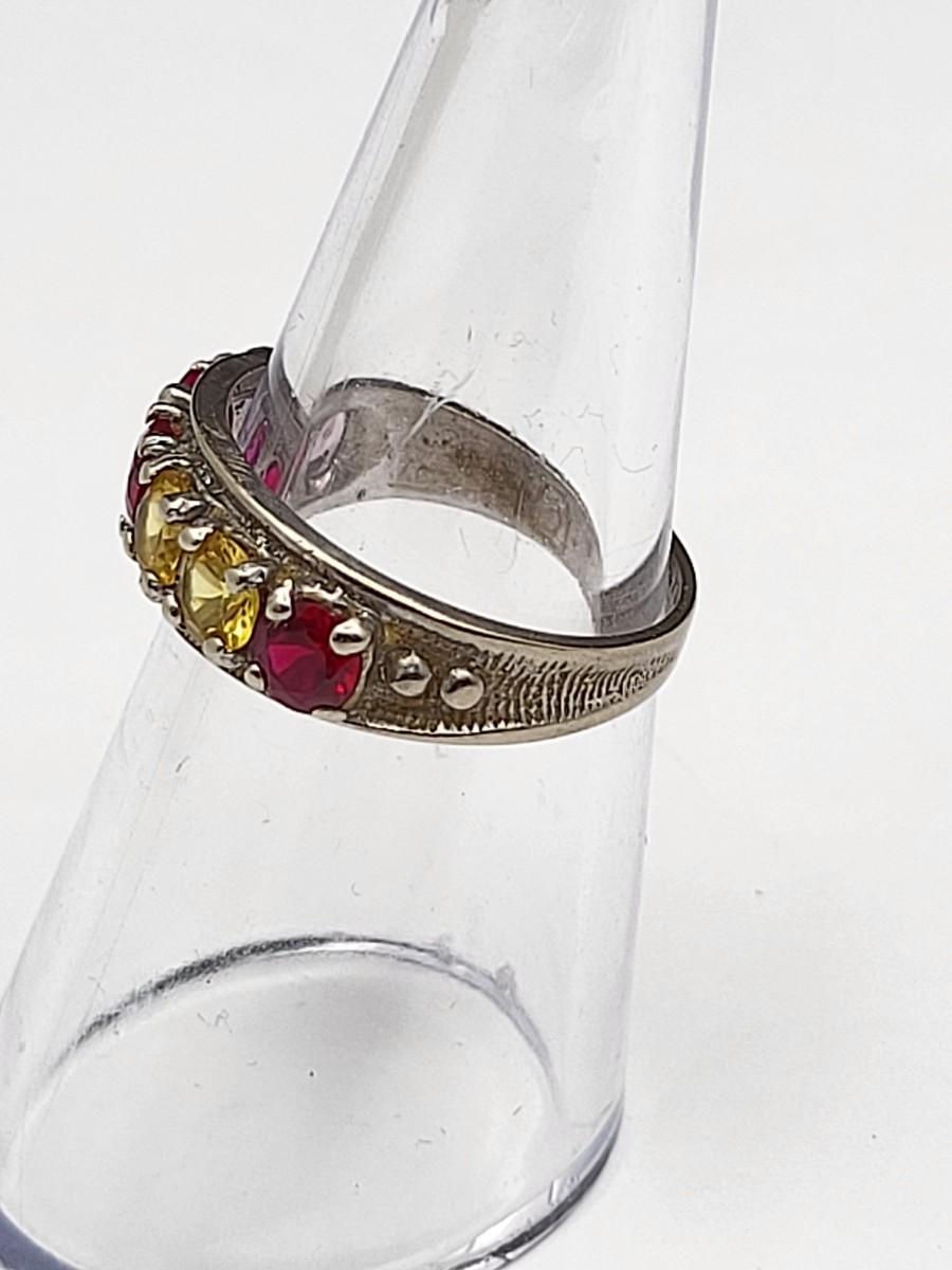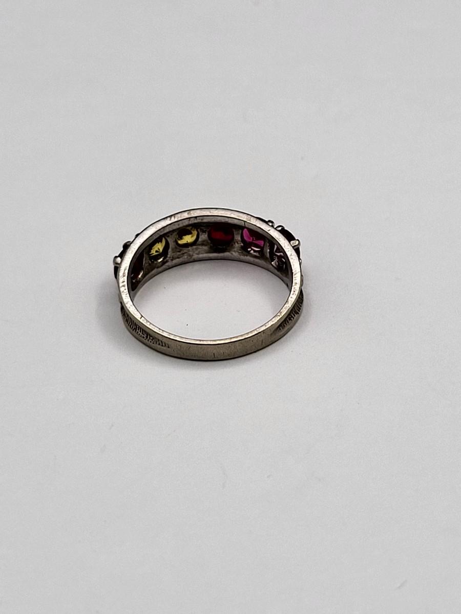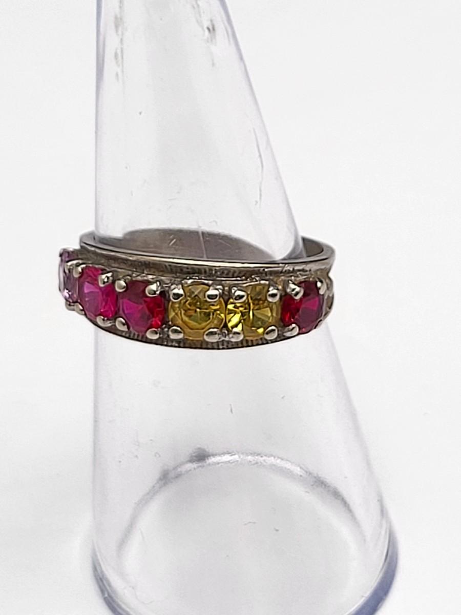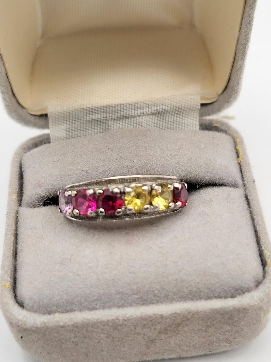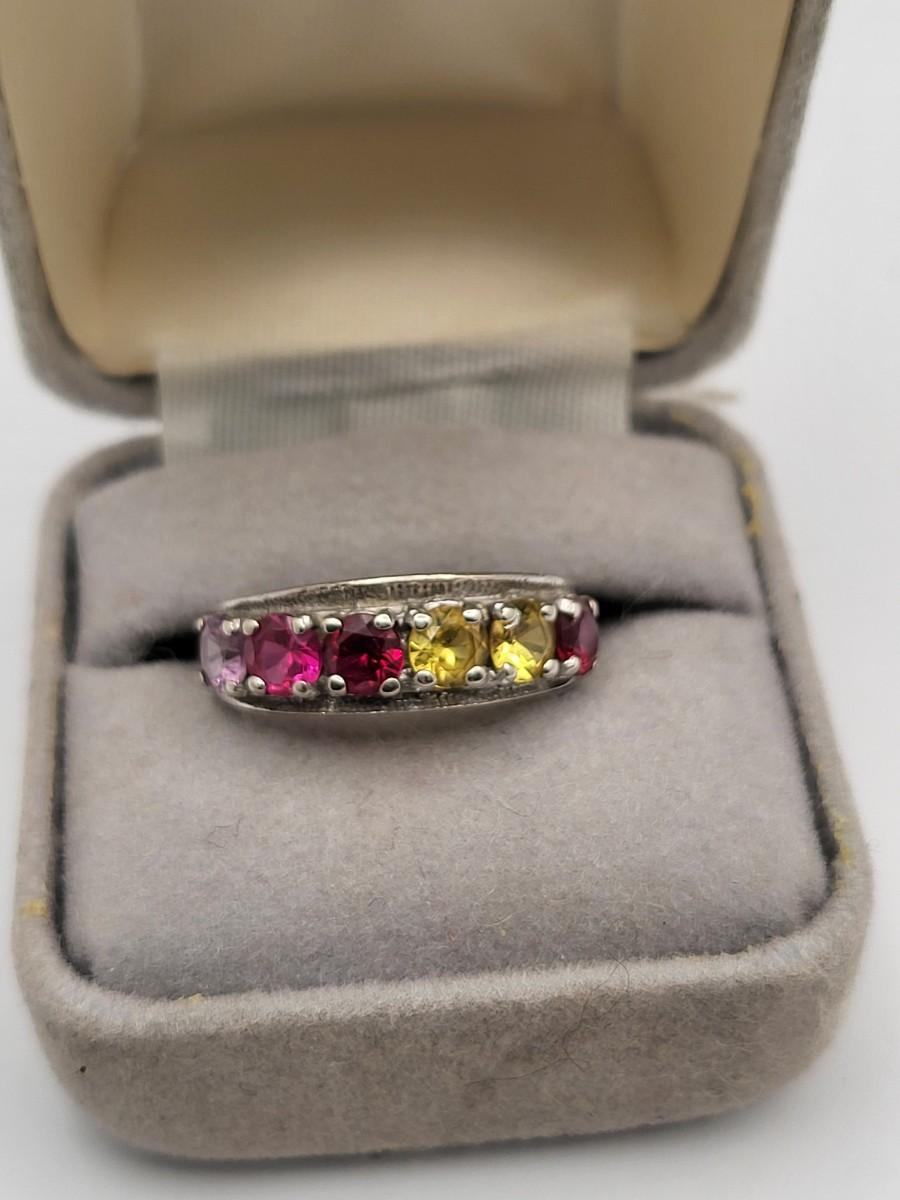 Six, colored sapphire stones (purple, pink, red, and yellow). Stamped 10k white gold ring. Size 5.5.