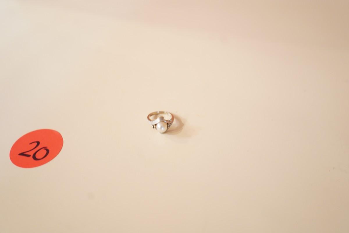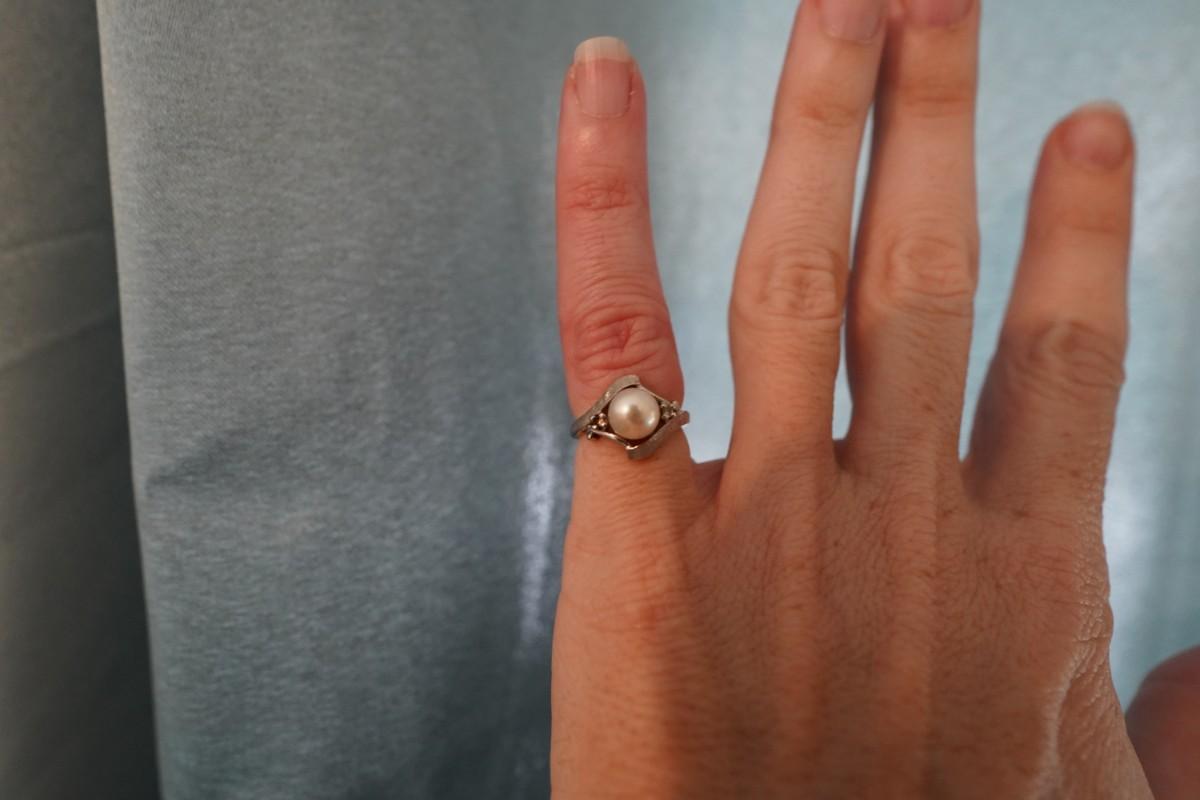 10 carat white gold ring with brushed finish. Cultured pearl - 5mm round. .03 carat diamonds on each side of pearl. 3.3 grams of gold. Size 3.5.