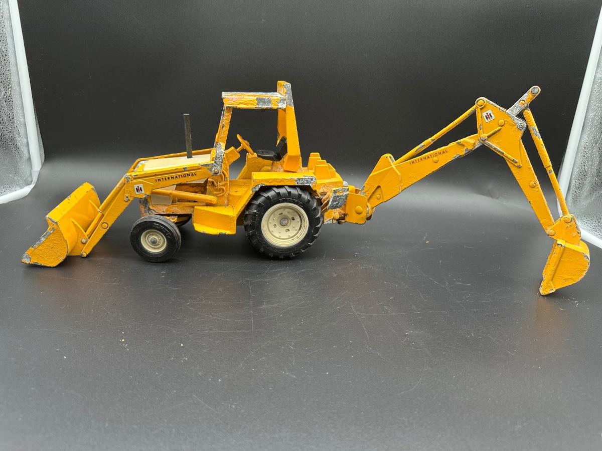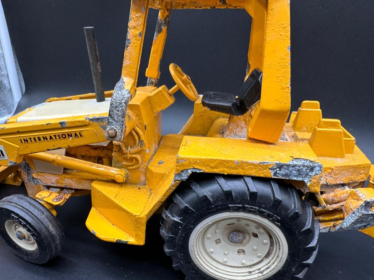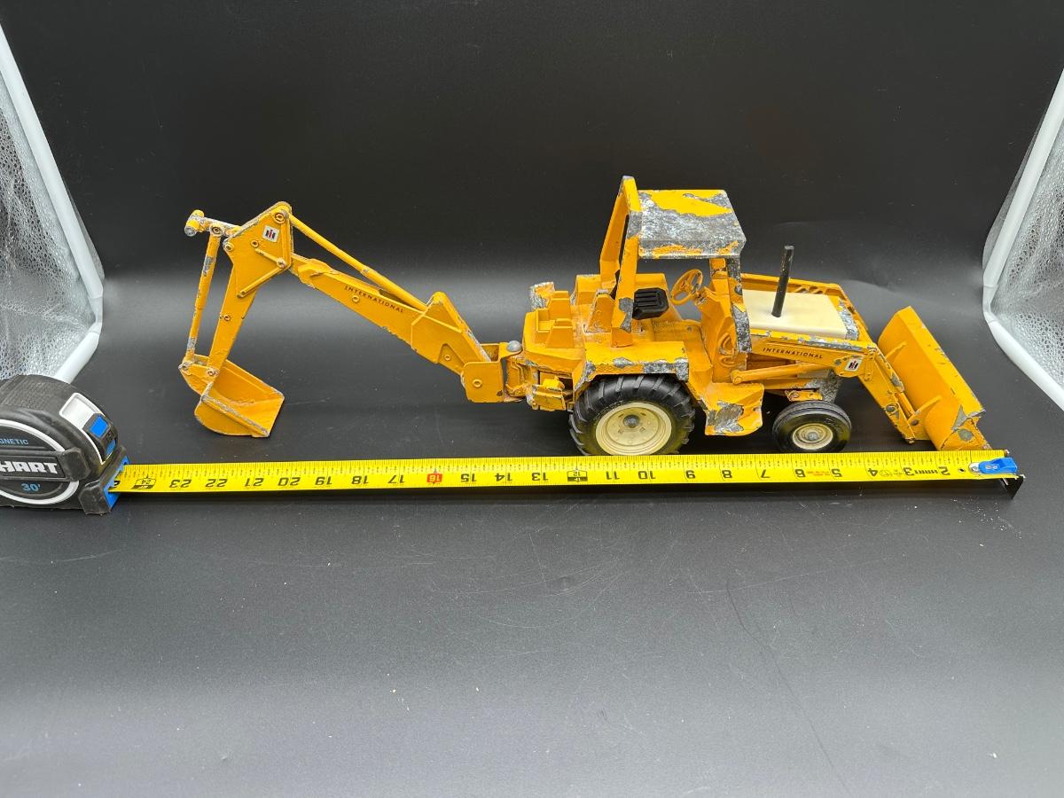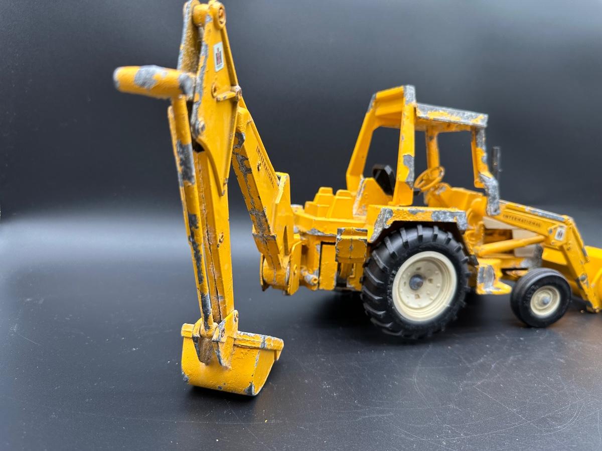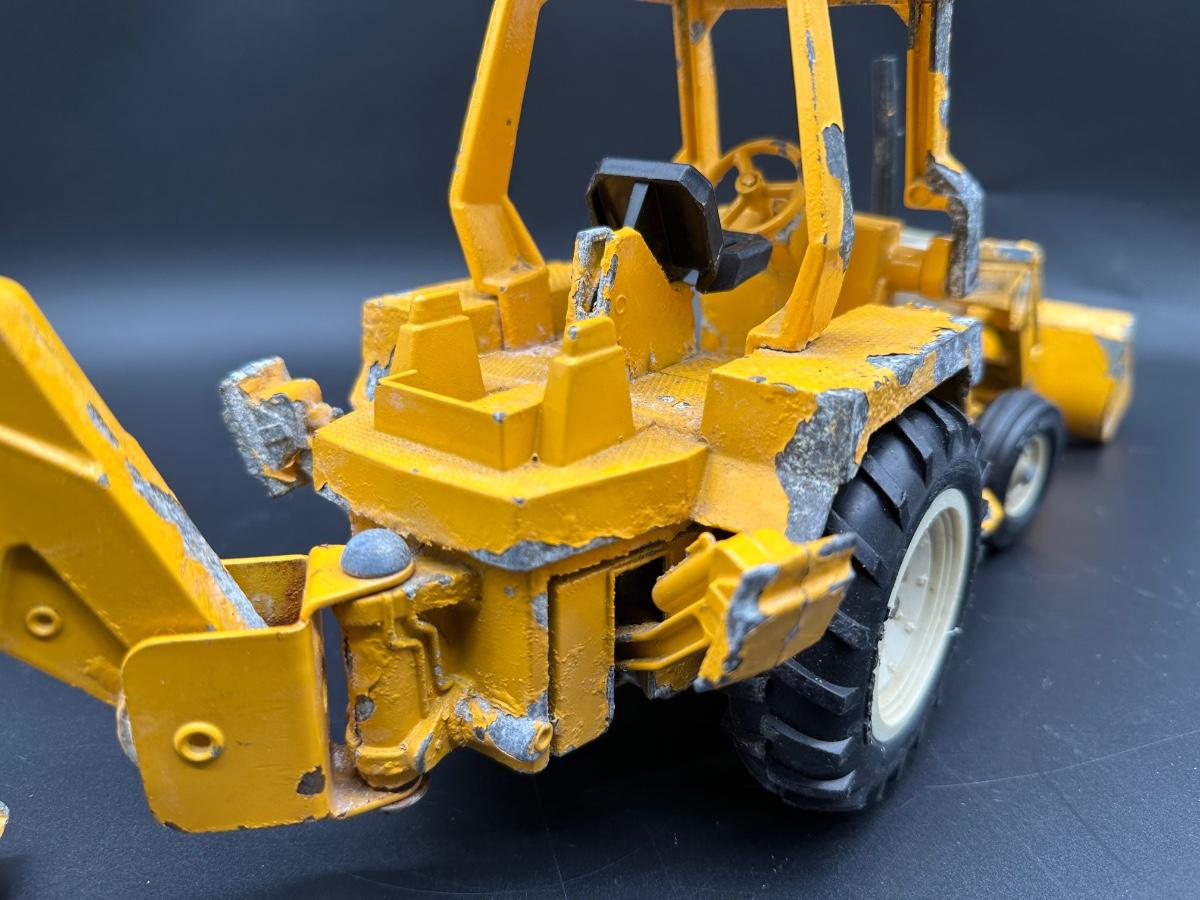 Both show play wear and paint loss, especially on the backhoe (heavy edge wear and chipping). Tractor presents well overall with light wear and dust. No obvious broken castings observed. Sold as found.