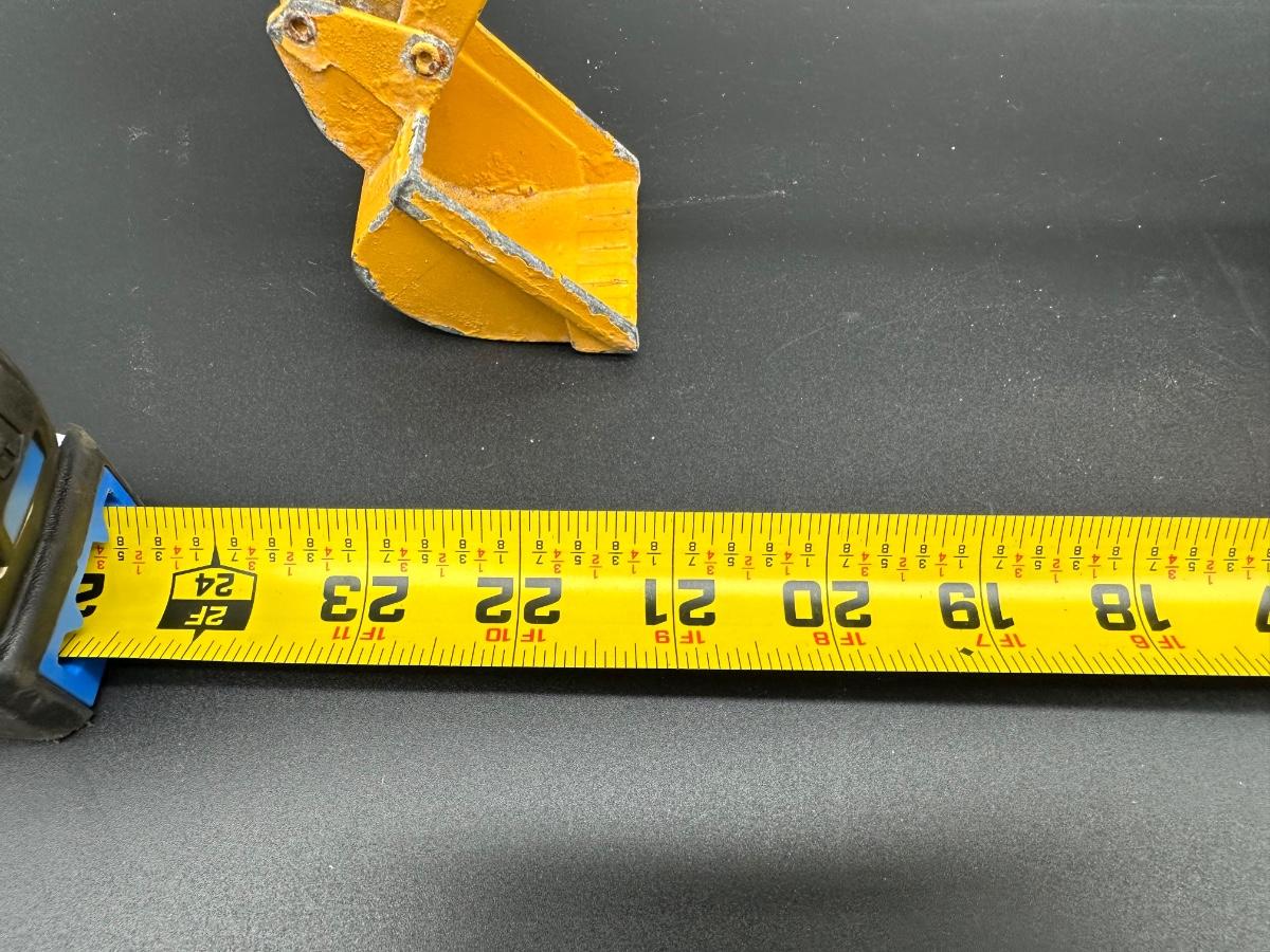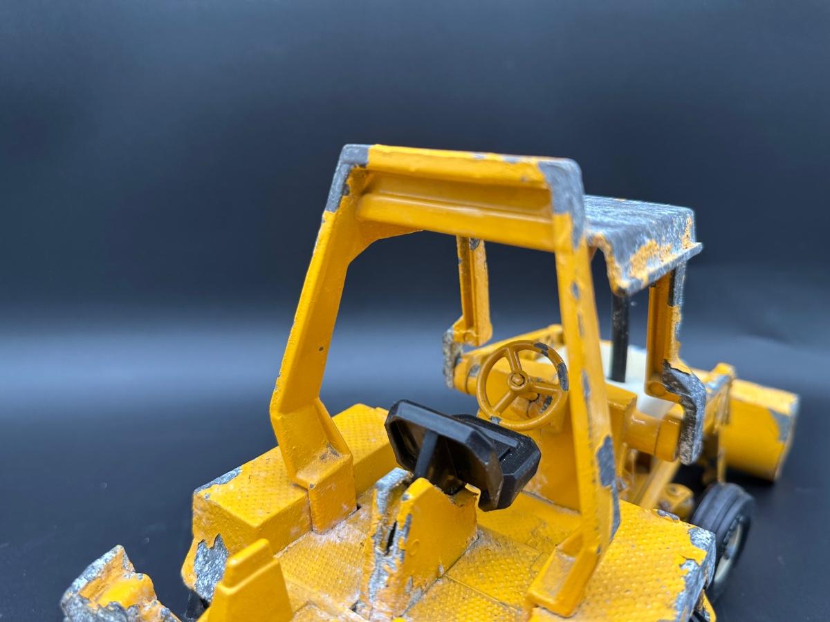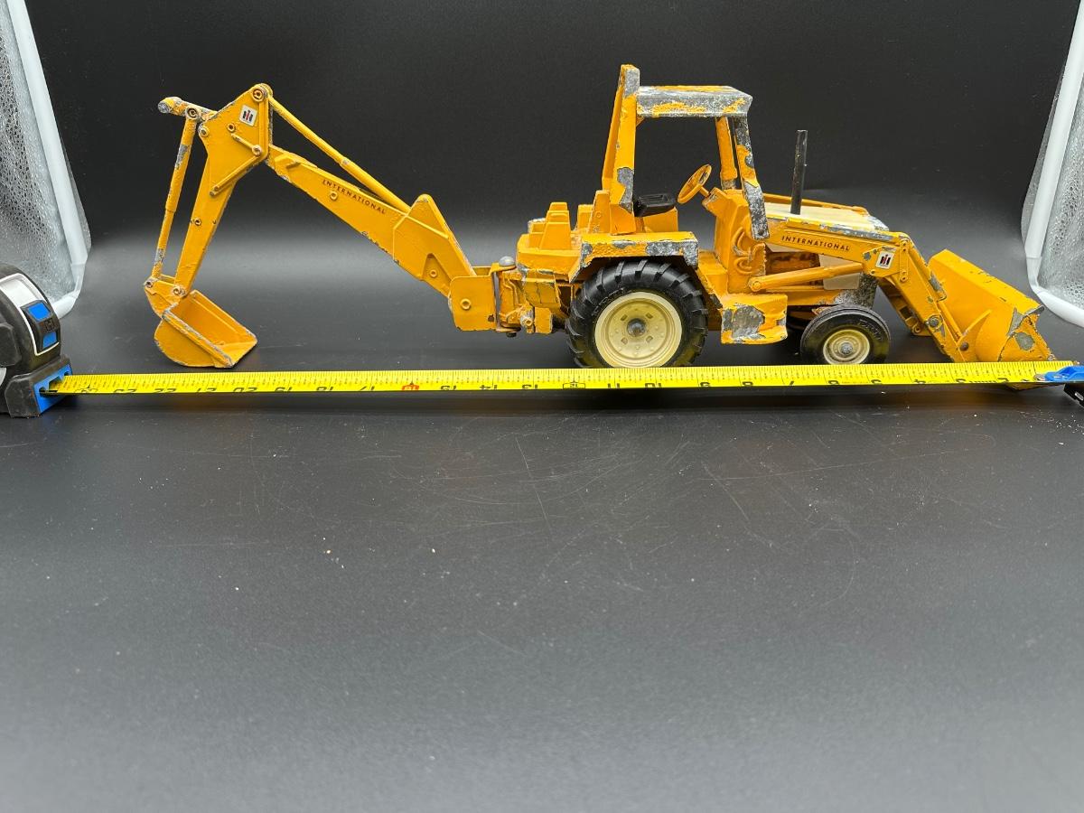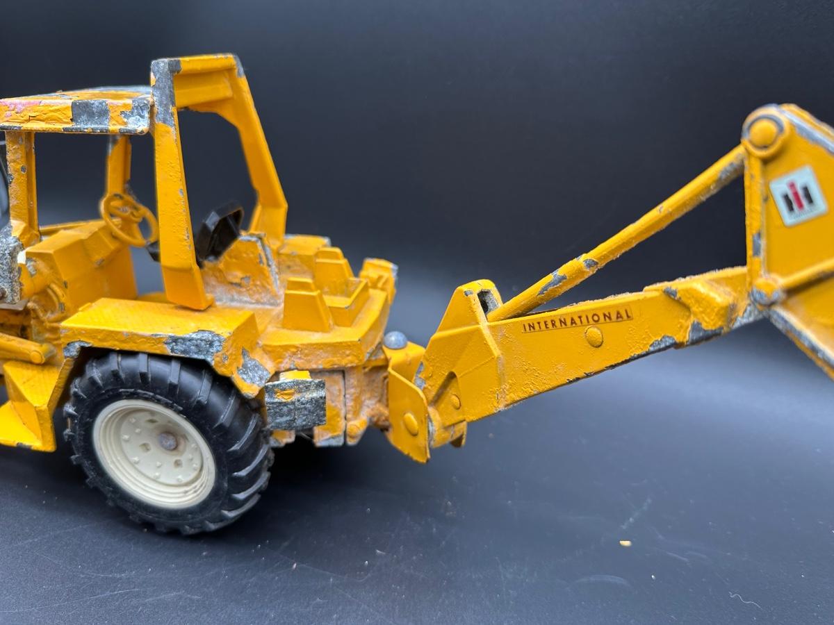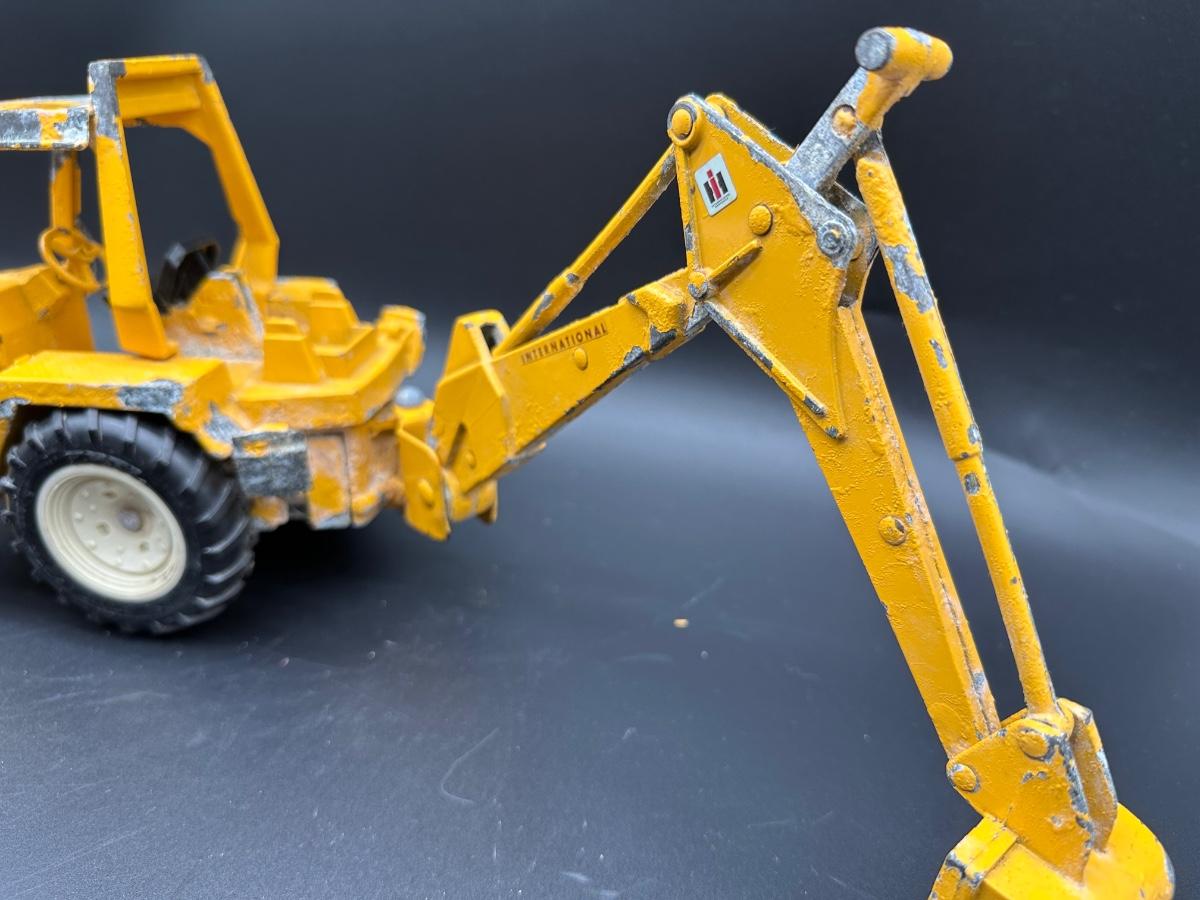 Both show play wear and paint loss, especially on the backhoe (heavy edge wear and chipping). Tractor presents well overall with light wear and dust. No obvious broken castings observed. Sold as found.