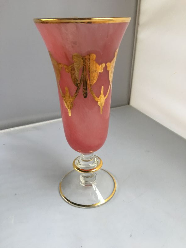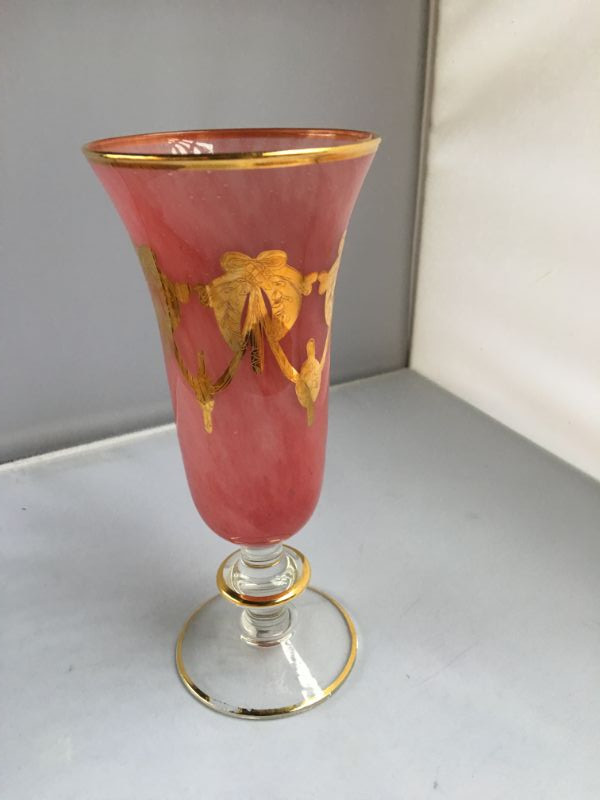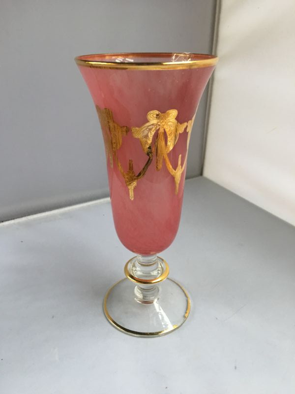 Vintage 7 1/2" Tall Pink Glass by Interglass, Made in Italy, Heavily Gilded Champagne Coup