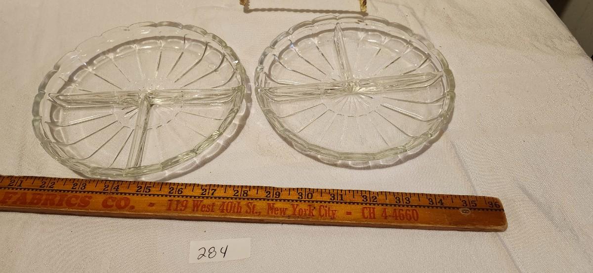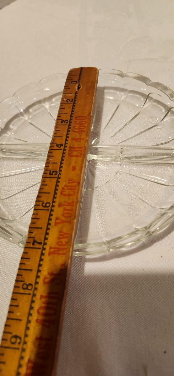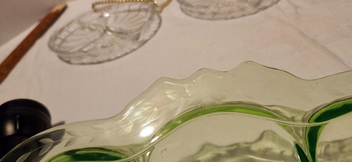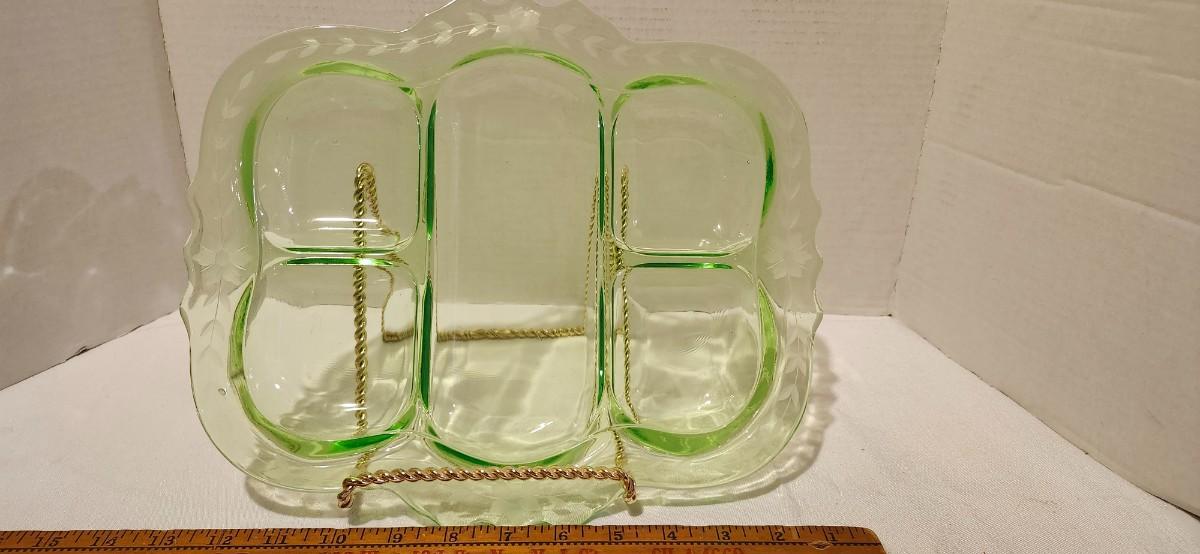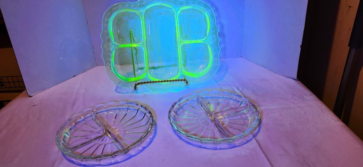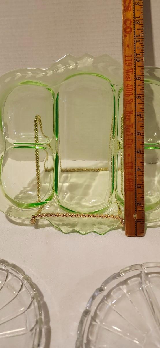 Vintage 12.5” x 10.5 " Green Uranium Glass Divided Relish Tray Plate and 2 clear Divided Relish Tray
