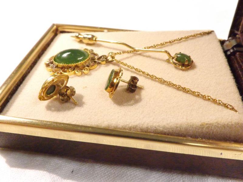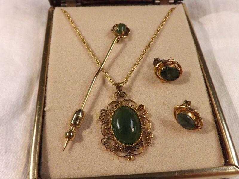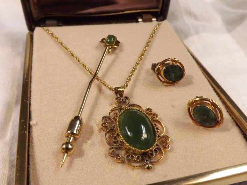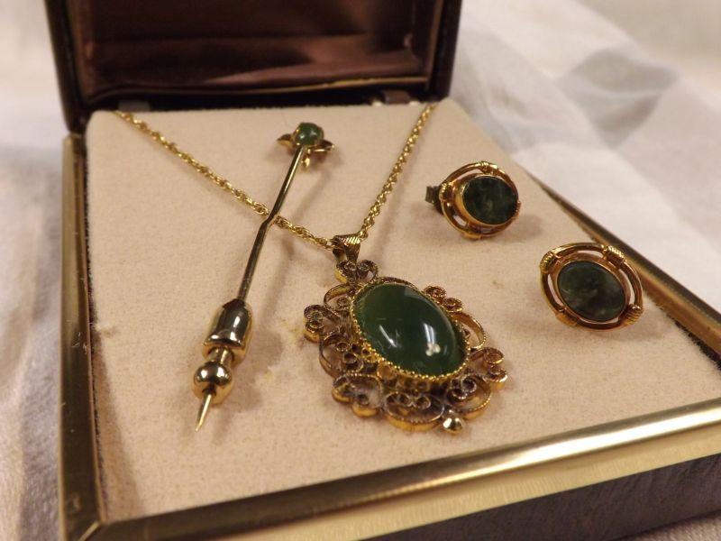 Vintage Jade necklace, earrings, and pin. Lovely scrollwork on the pendent. **Please read Terms and Conditions before placing a bid. Pick up is Wednesday, September 25 from 4pm to 7pm and Saturday, September 28 from 9am to 1pm in Williamstown, NJ. All sales are final. All sales are as is, where is. Please review all photos. Any props included in photos are not included in listing. All measurements are approximate.