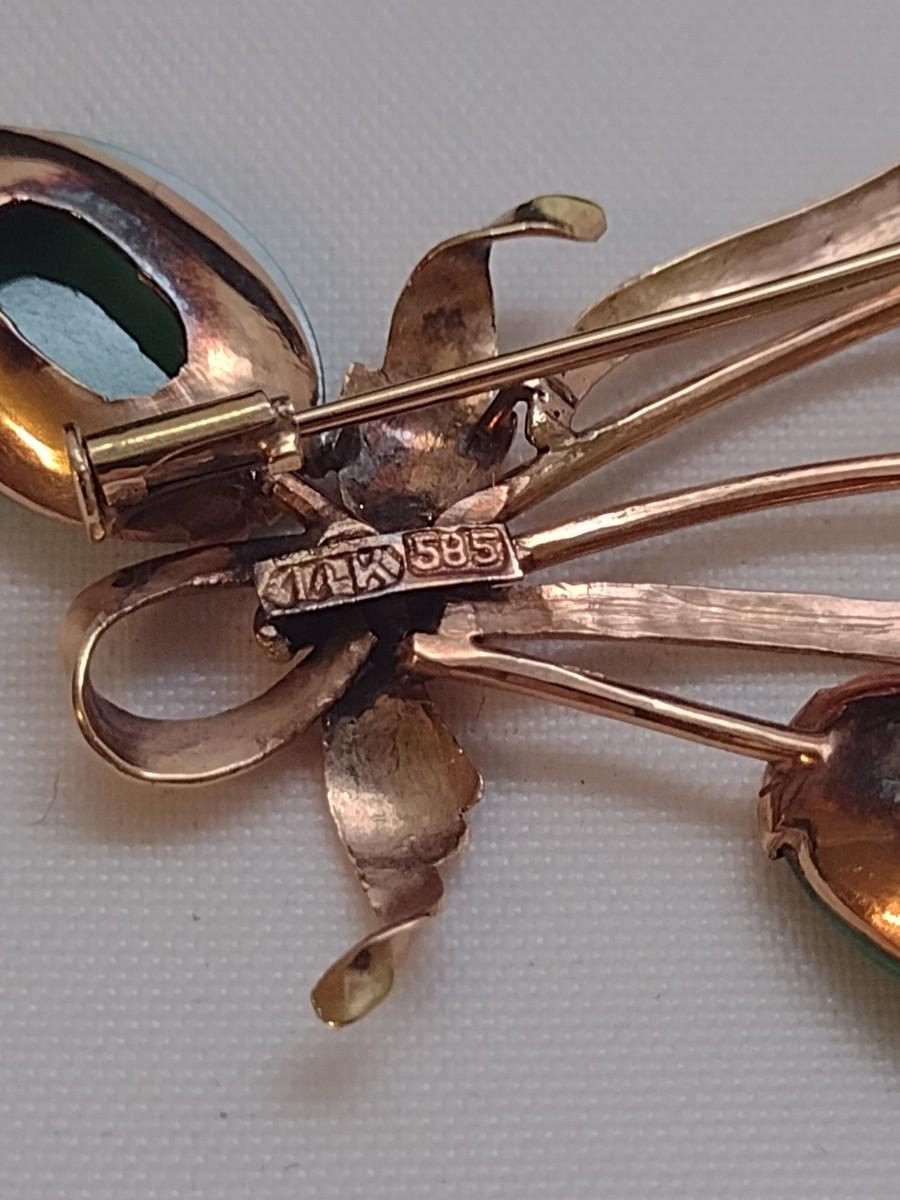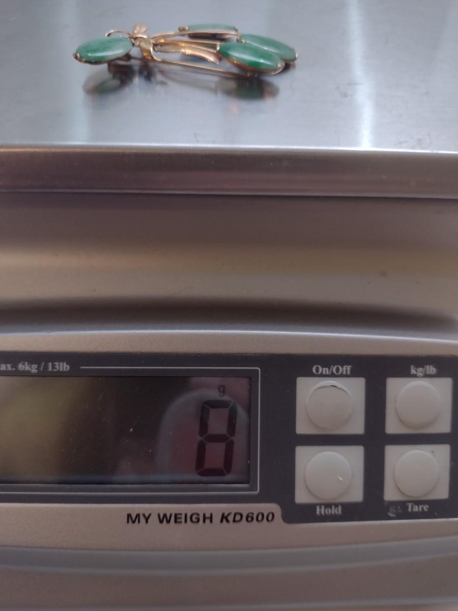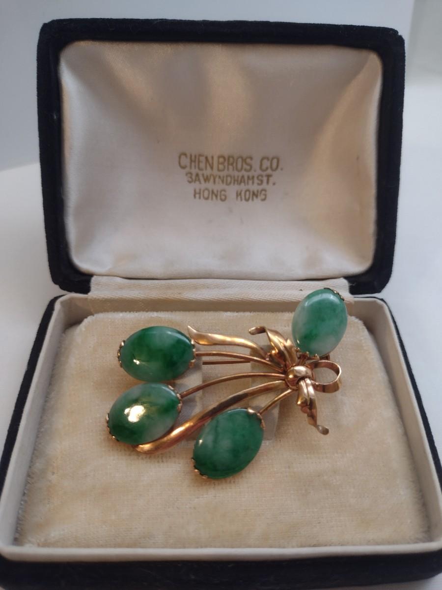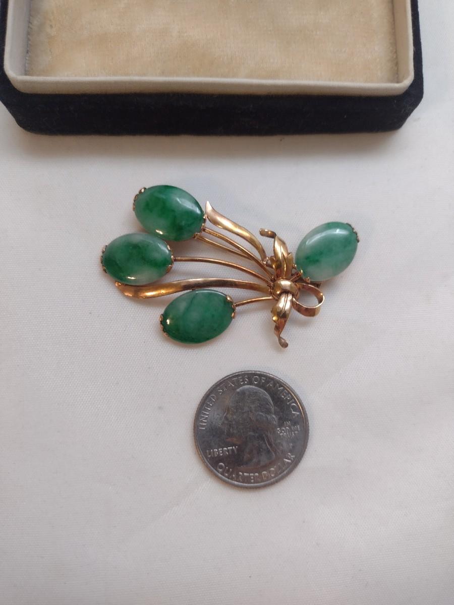 Vintage 14 KT and Jade Brooch (#14). Weighs approx 8 grams. Made in Hong Kong for Chen Bros.