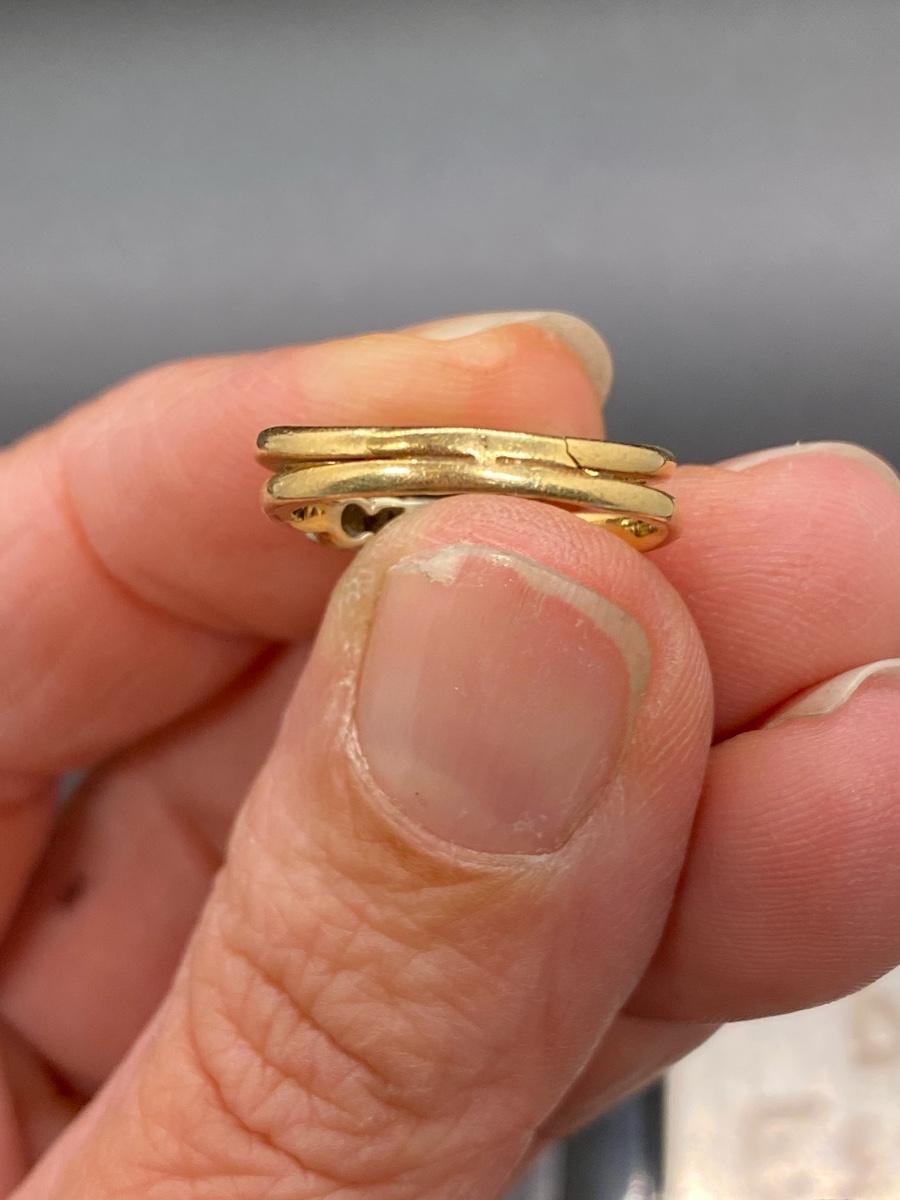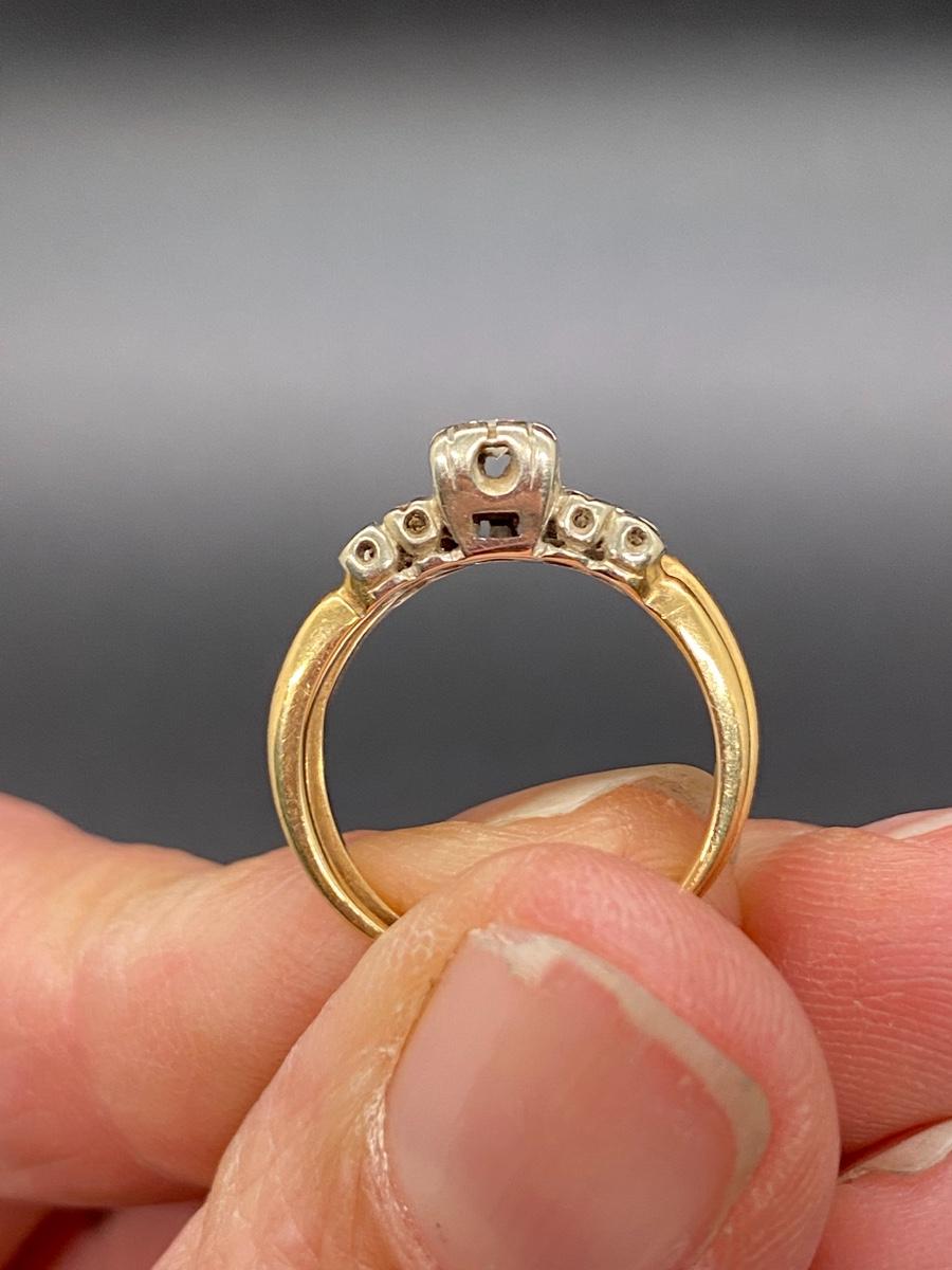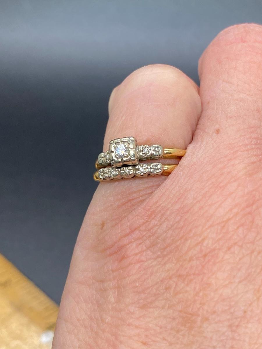 Vintage engagement ring and wedding band set. Believe it is 14k, it is marked but a little hard to read since the underside of rings has been fused together. Small center stone with side stone chips. 3.4g tw, and small about a size 4 or 5.